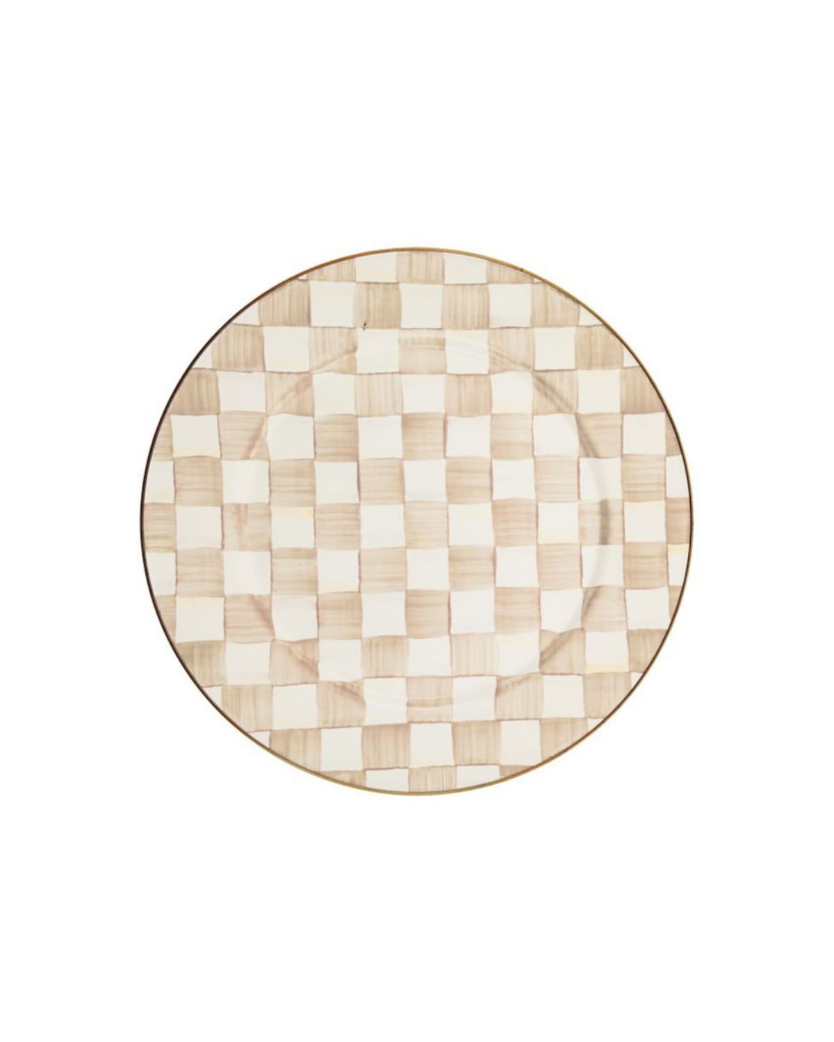 Serve your favorite dishes in style with our Mocha Check Serving Platter. The heavy-gauge steel underbody is glazed with hand-painted, coffee-colored checks and rimmed in bronzed stainless steel.