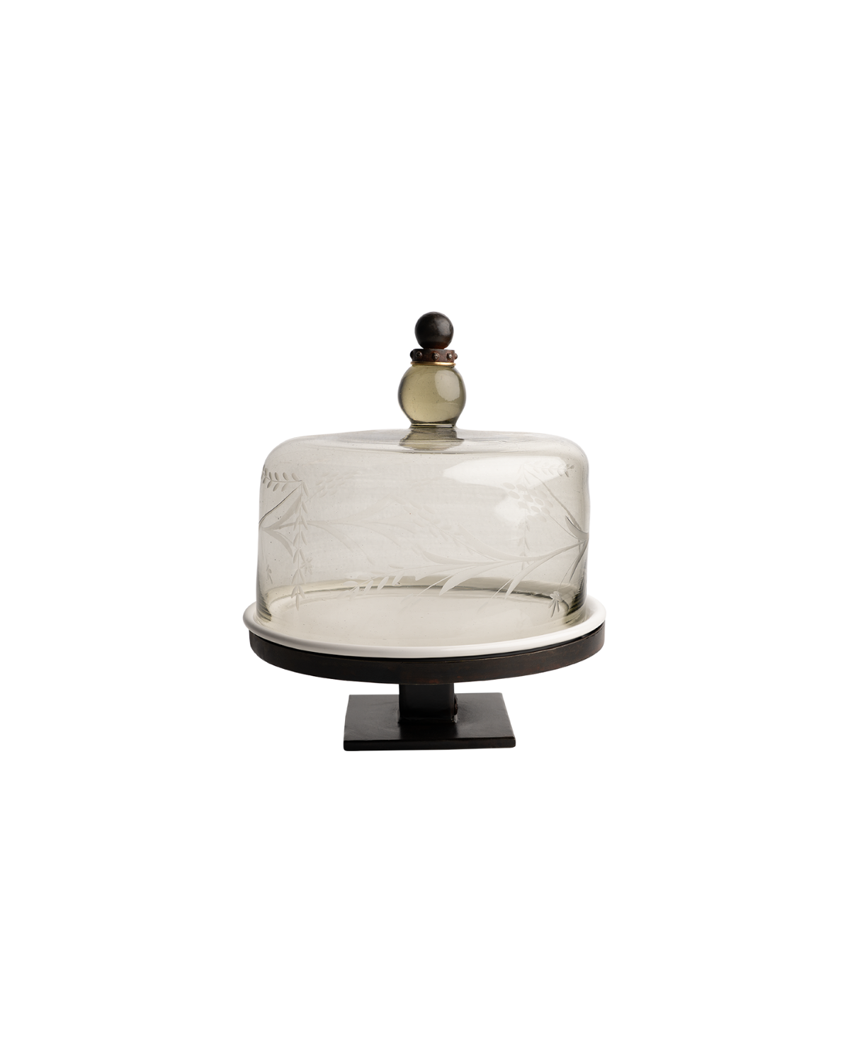 The Patrona Cake Stand by Jan Barboglio serves up sweet elegance with a mouth-blown, laurel-engraved glass dome, perched atop a sculptural iron base and removable ceramic plate—because every cake deserves a crown.