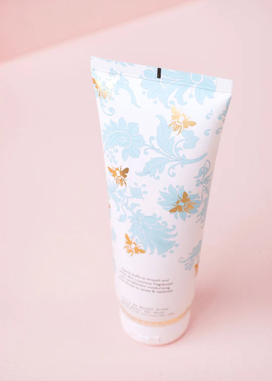 Golden bees buzz across a satin-touch tube of blue French-inspired foulard. Delicate gold detailing brings a touch of sophistication to any shower. Pairs perfectly with the Perfumed Shower Gel.