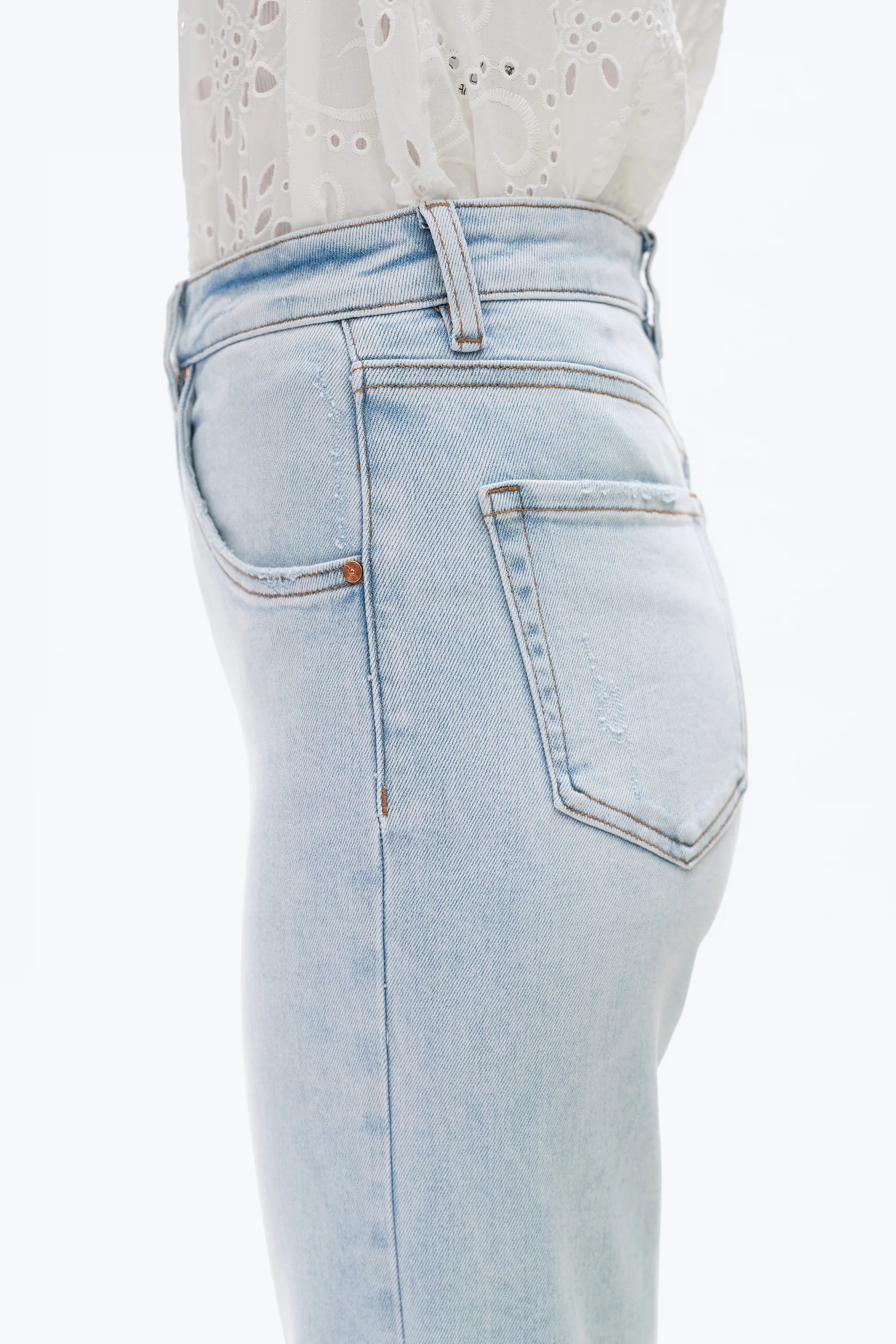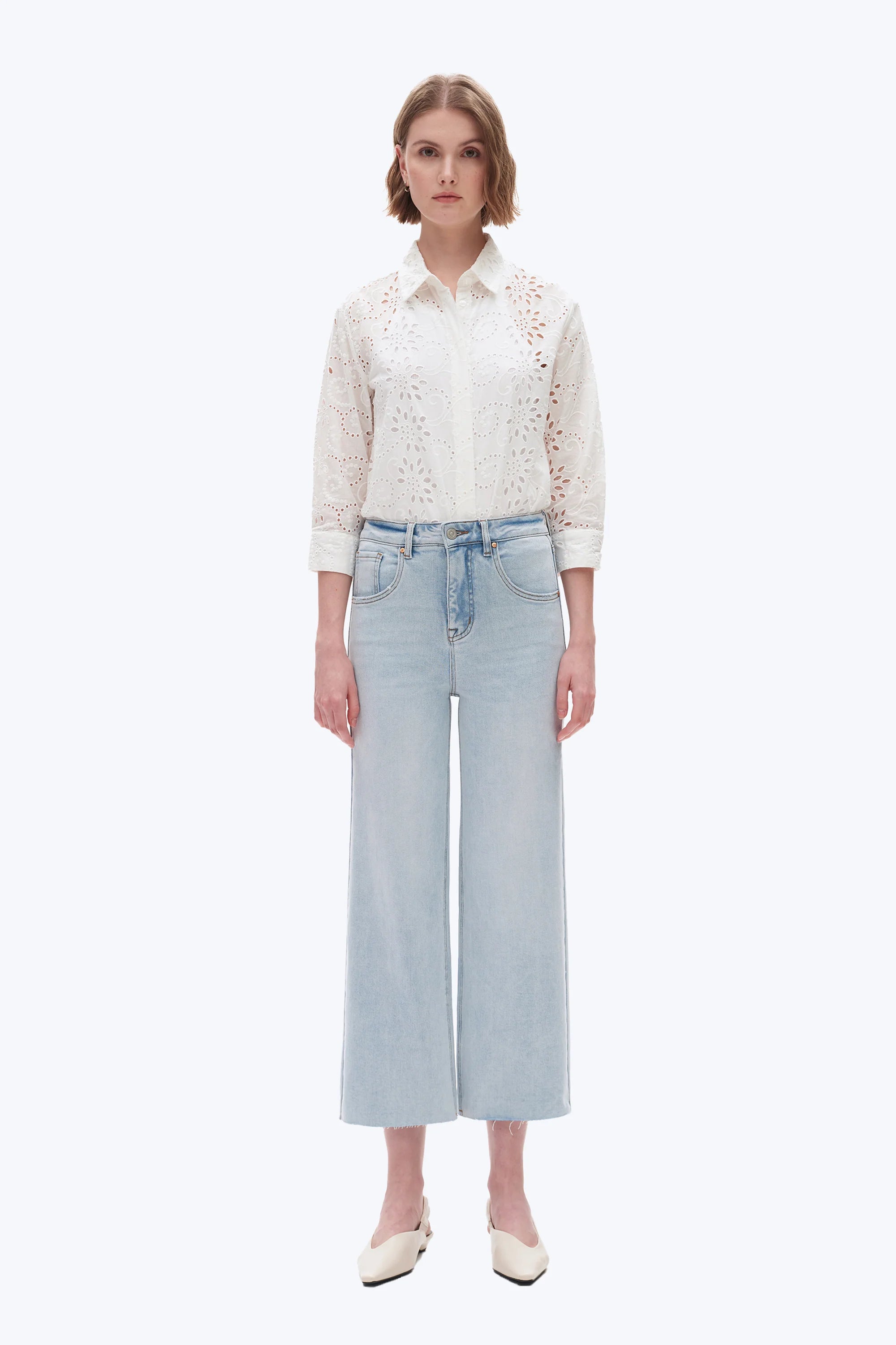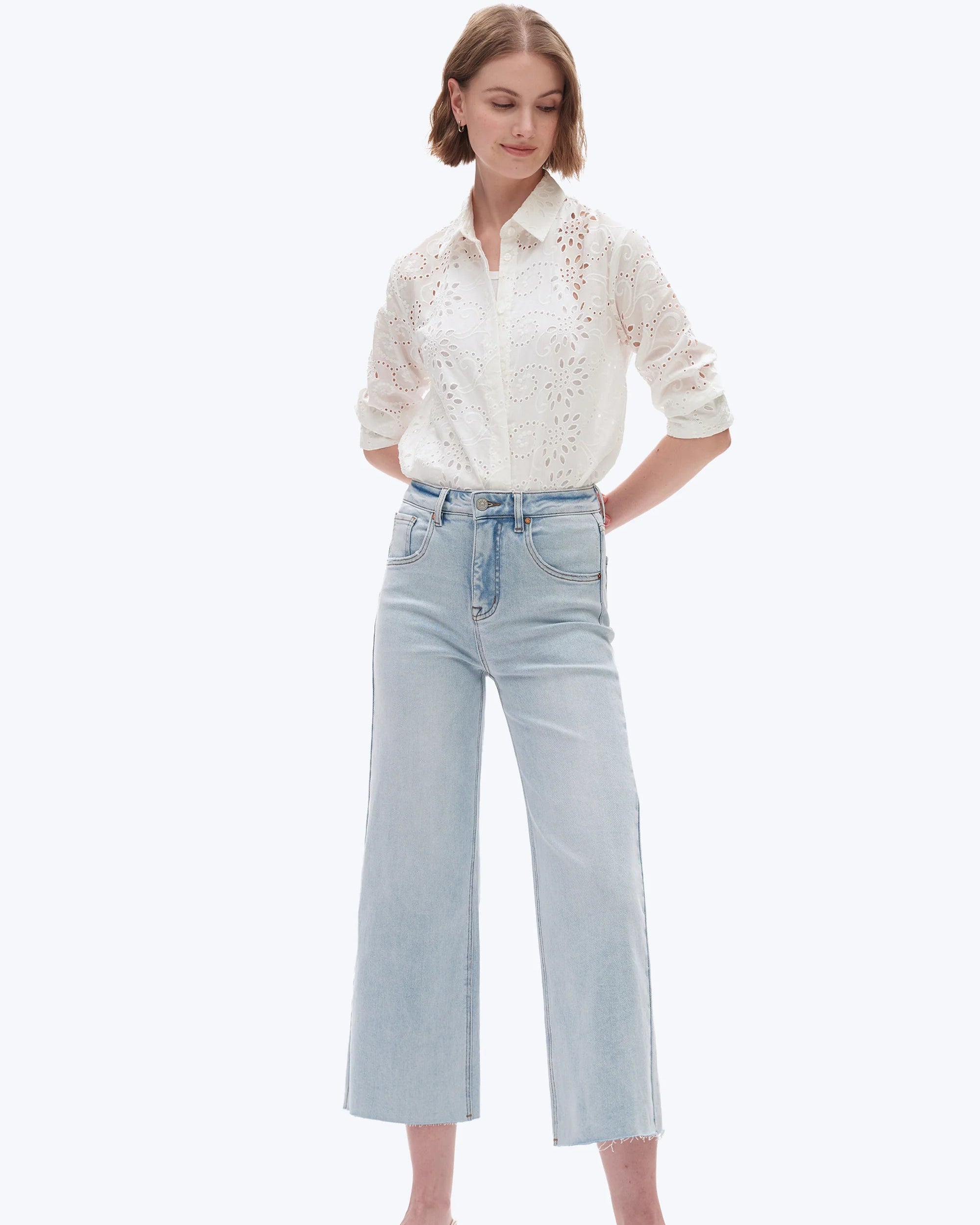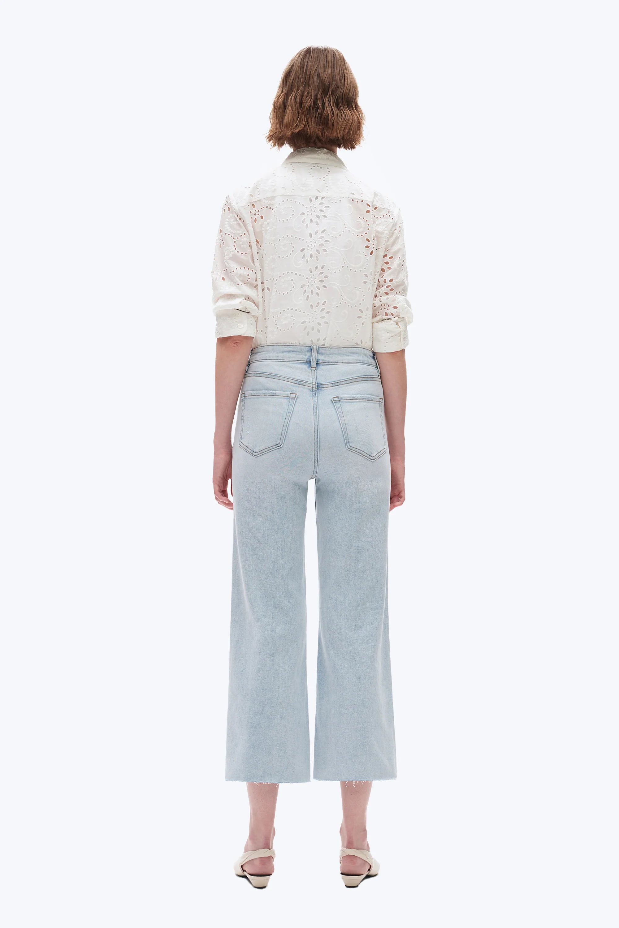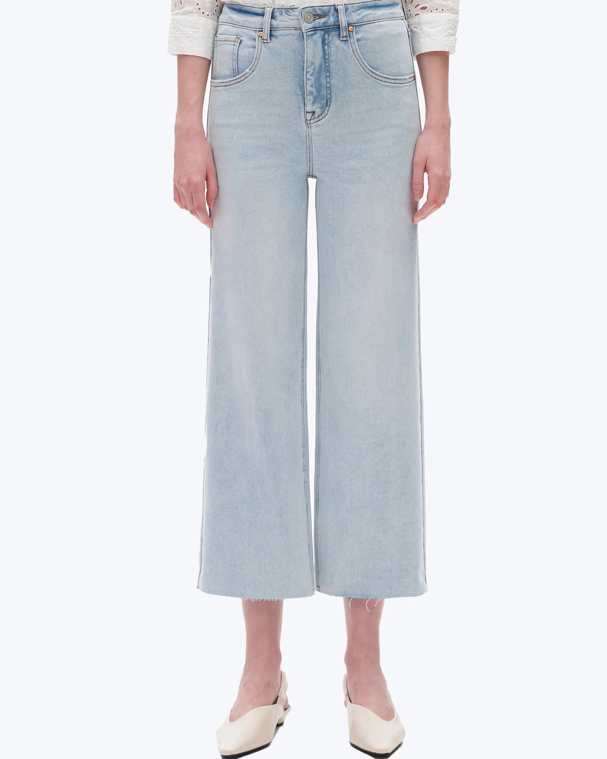 Cropped high-waisted wide-leg jeans in stretchy denim. Designed with a classic 5-pocket silhouette, contrast rivet waist closure, irregular whiskering, hand sanding, raw hem, and distressed back pockets with frayed edges.