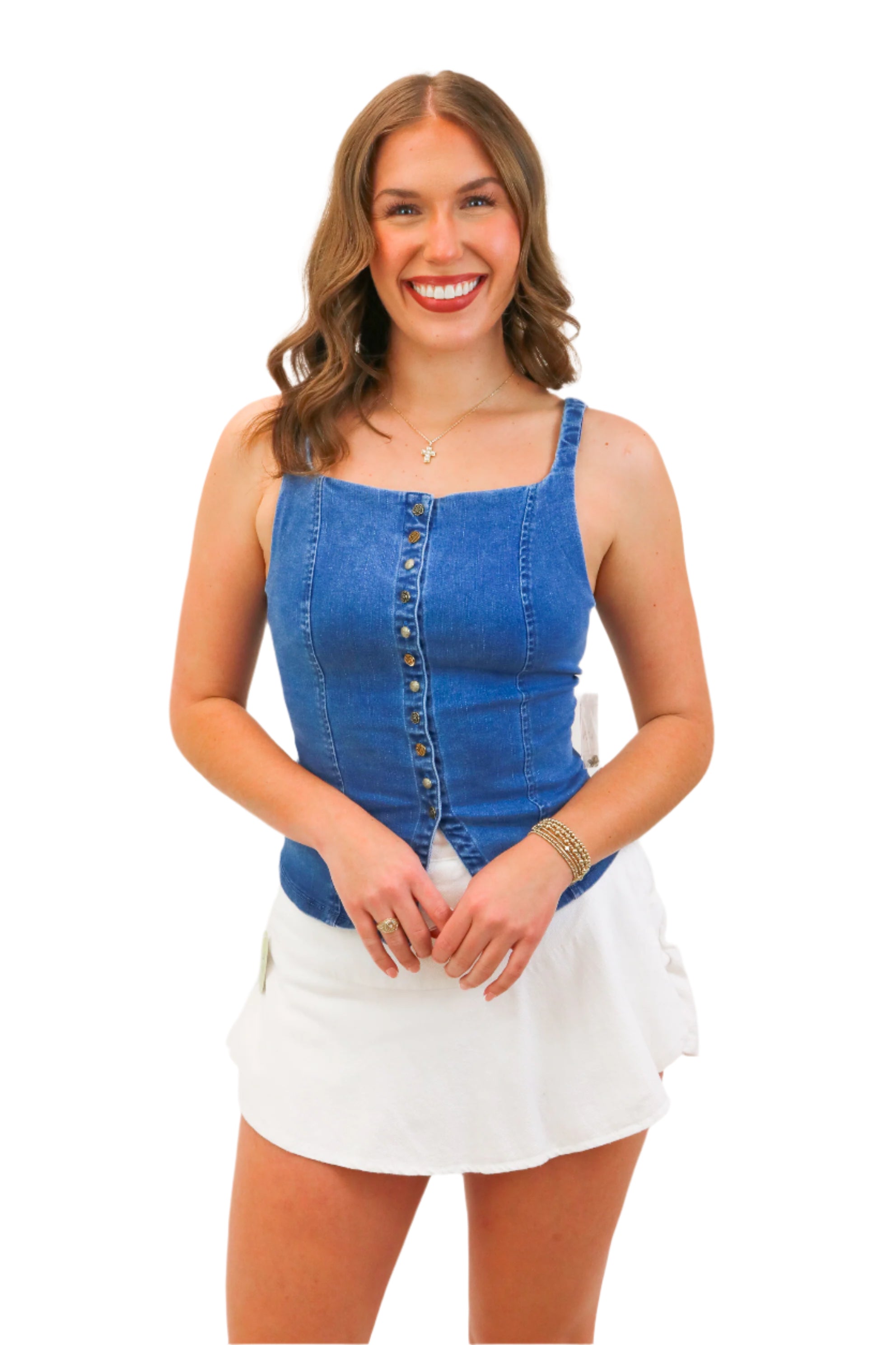 An elevated take on the classic vest silhouette, this top is featured in a slim-fitting silhouette and button-down style with a square-neckline and lace-up back detail.