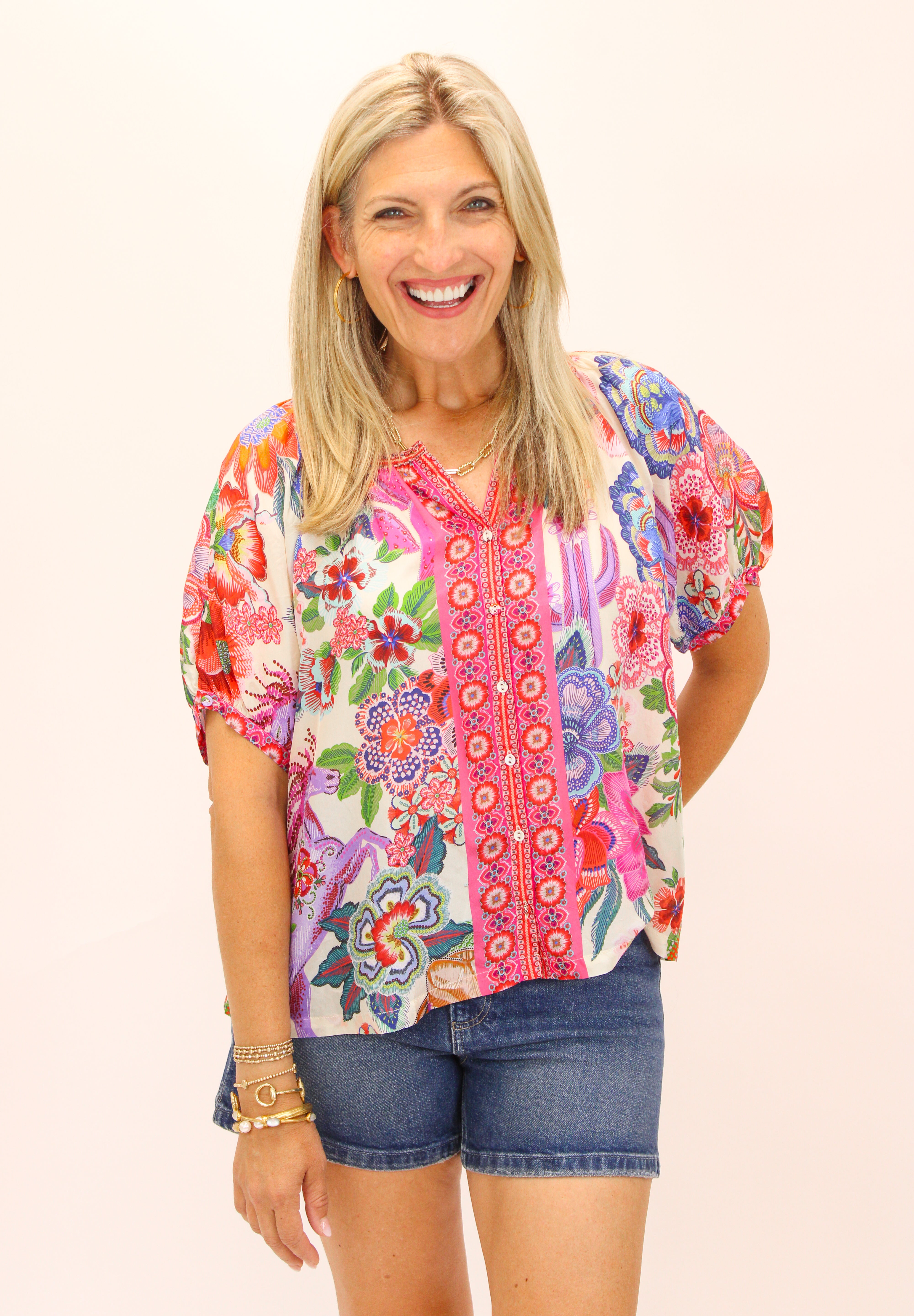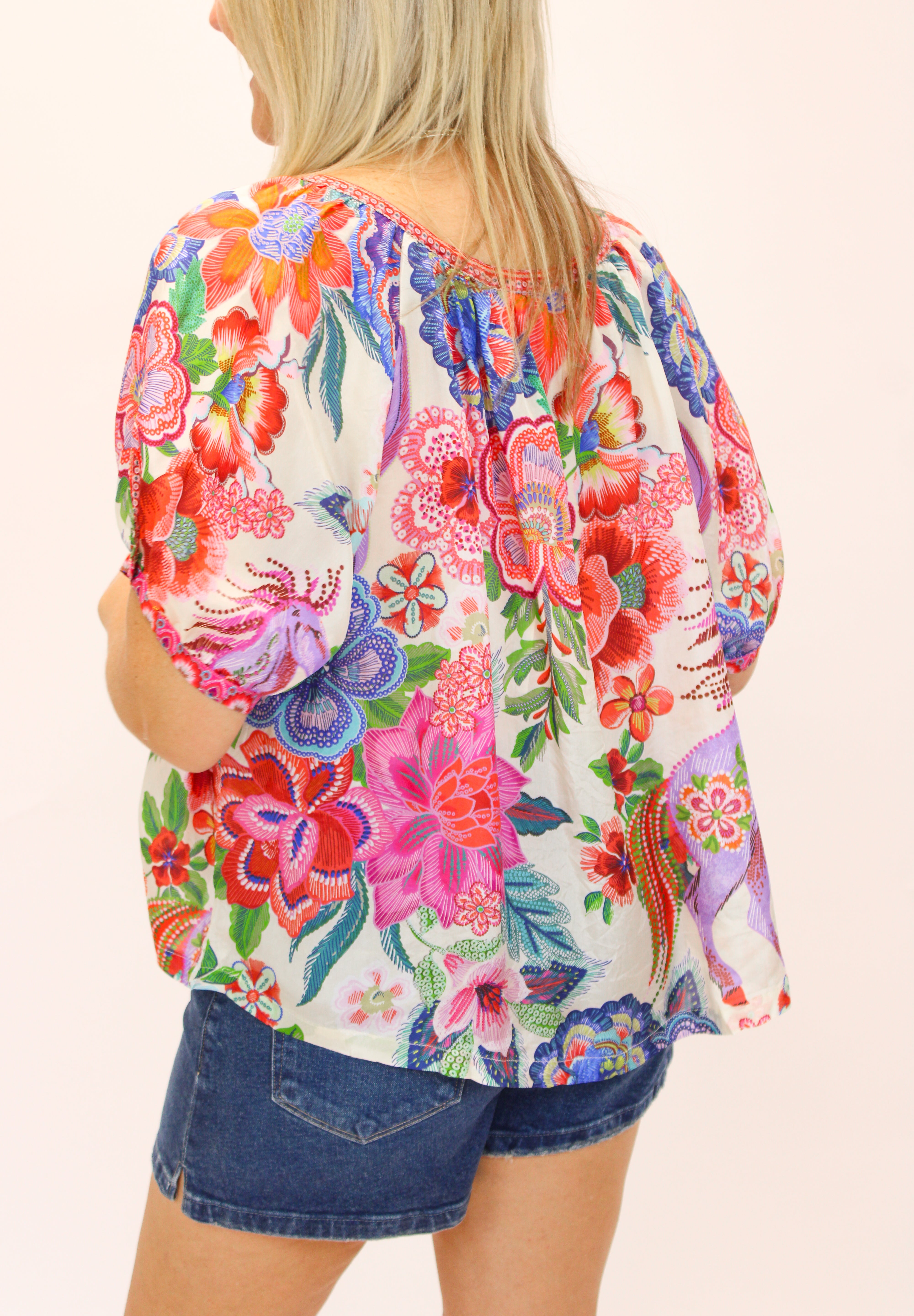 Crafted from 100% luxurious silk, the Avah Button Down Shirt is adorned with a bold floral pattern rich in color. Designed with a rounded neckline and gently puffed elbow-length sleeves, this relaxed-fit blouse is finished with a contrasting front placket. Pair with dark wash denim and coordinating flats for an elevated casual ensemble.
