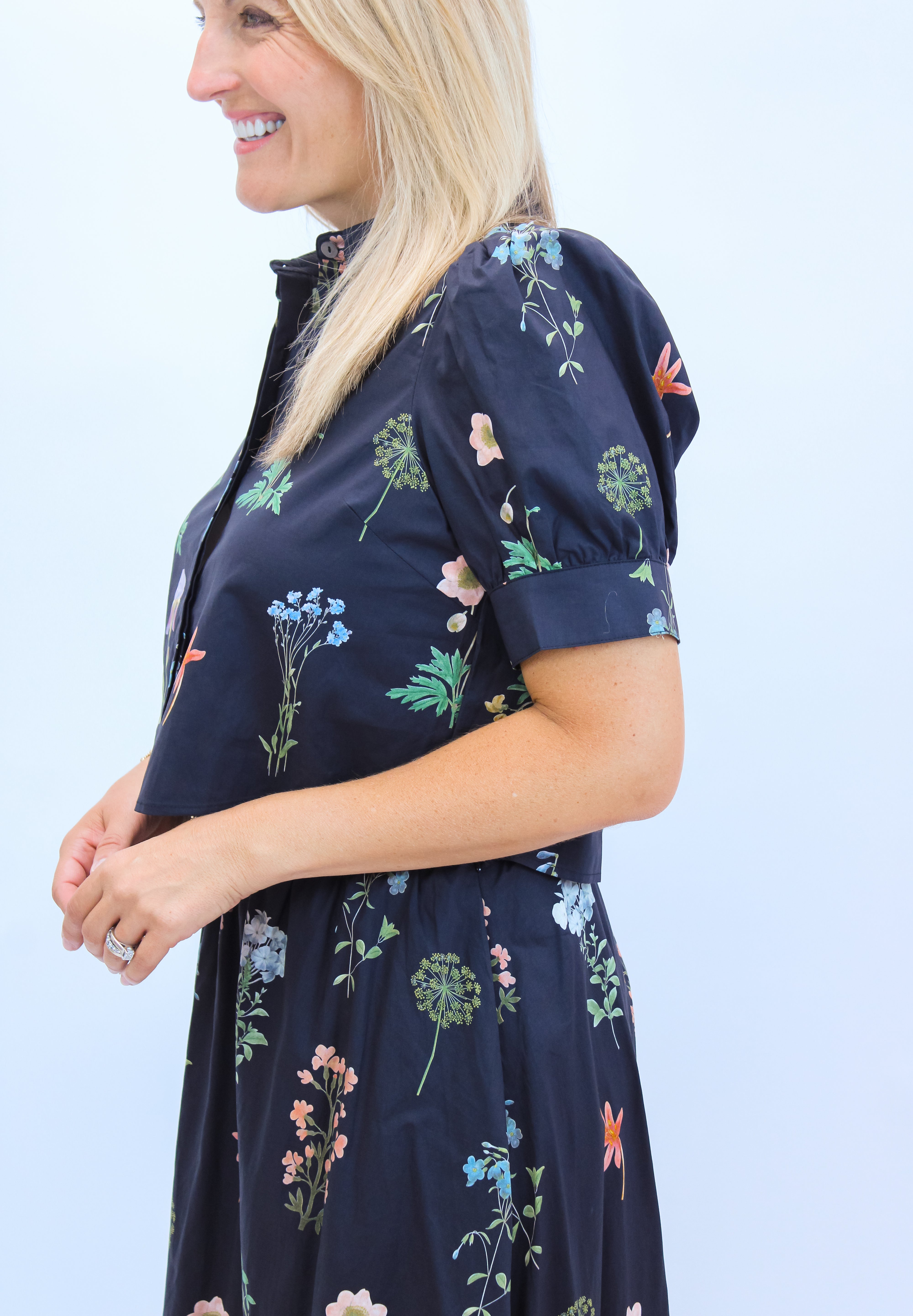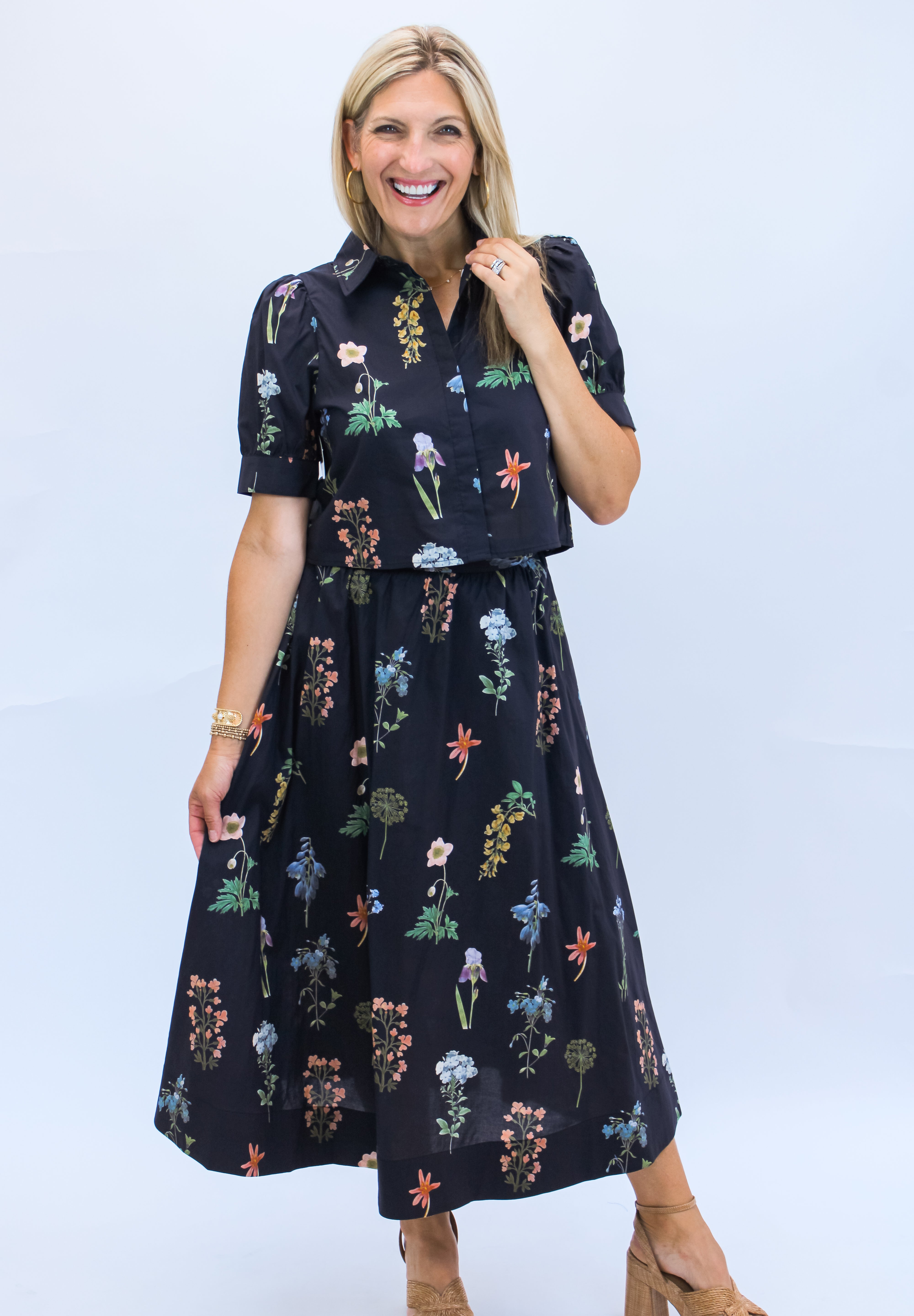 This playful black button-down top features vibrant colorful florals that brighten up any outfit. With charming puff sleeves and a classic collar, it adds a fun, flirty touch to your look. Perfect for mixing and matching, it’s a lively addition to your wardrobe that’s sure to turn heads.