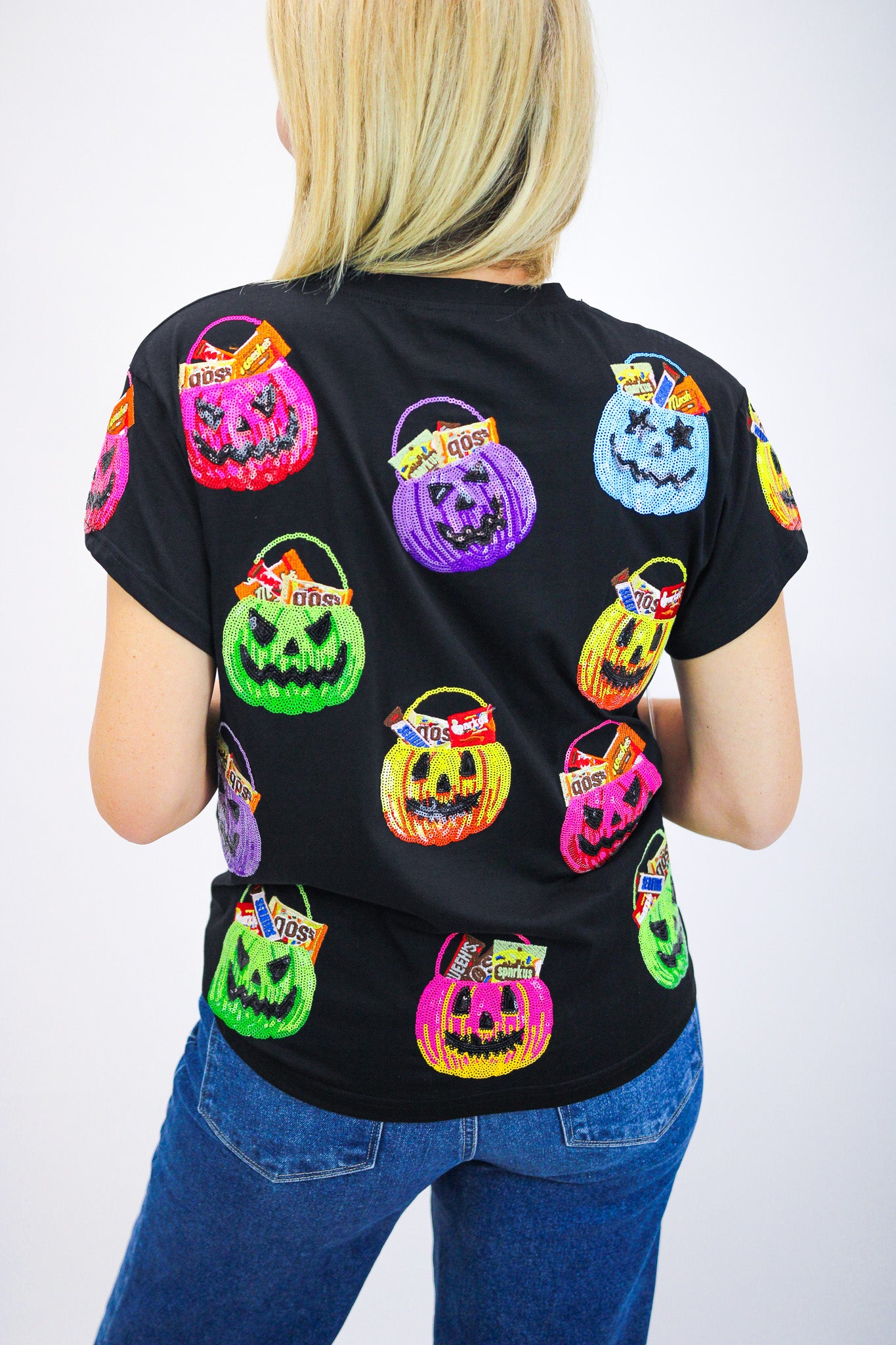 Get ready for spooky season with the Candy In Halloween Baskets Tee! This black tee, sprinkled with colorful Halloween treats, brings playful fun to your festive wardrobe. Perfect for trick-or-treat adventures or cozying up during fall festivities, its lively design adds a sweet touch to your Halloween style.