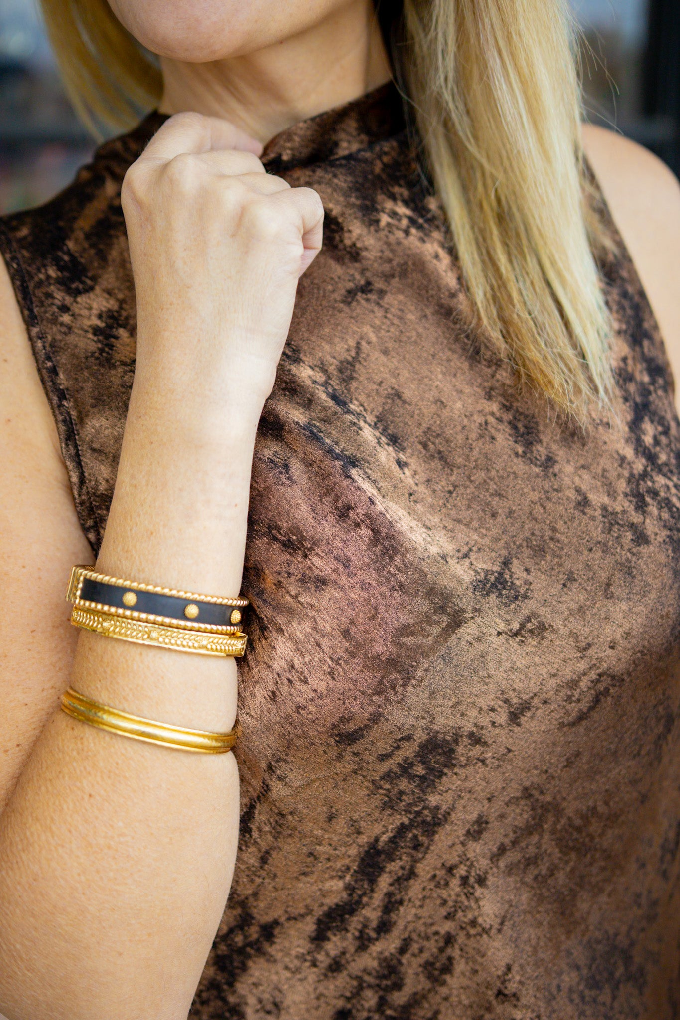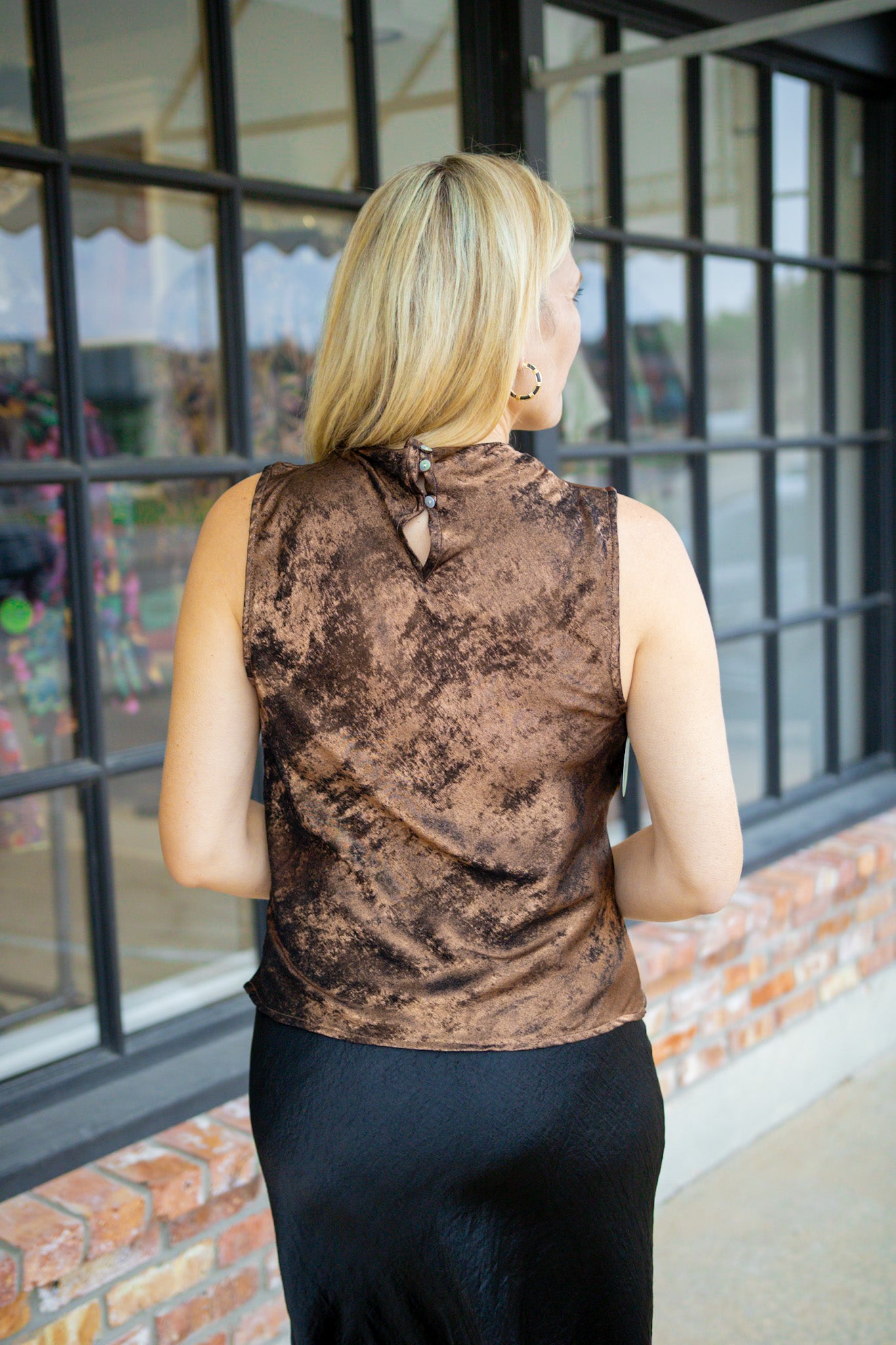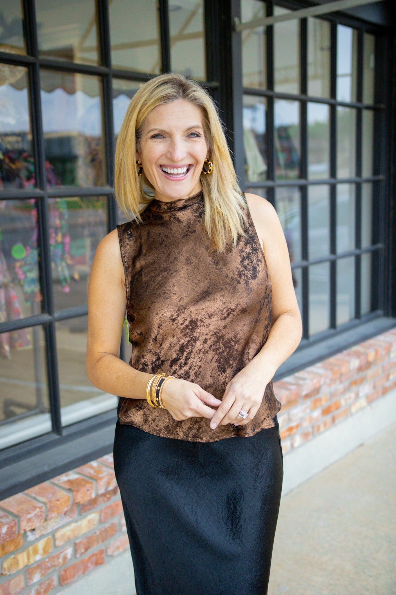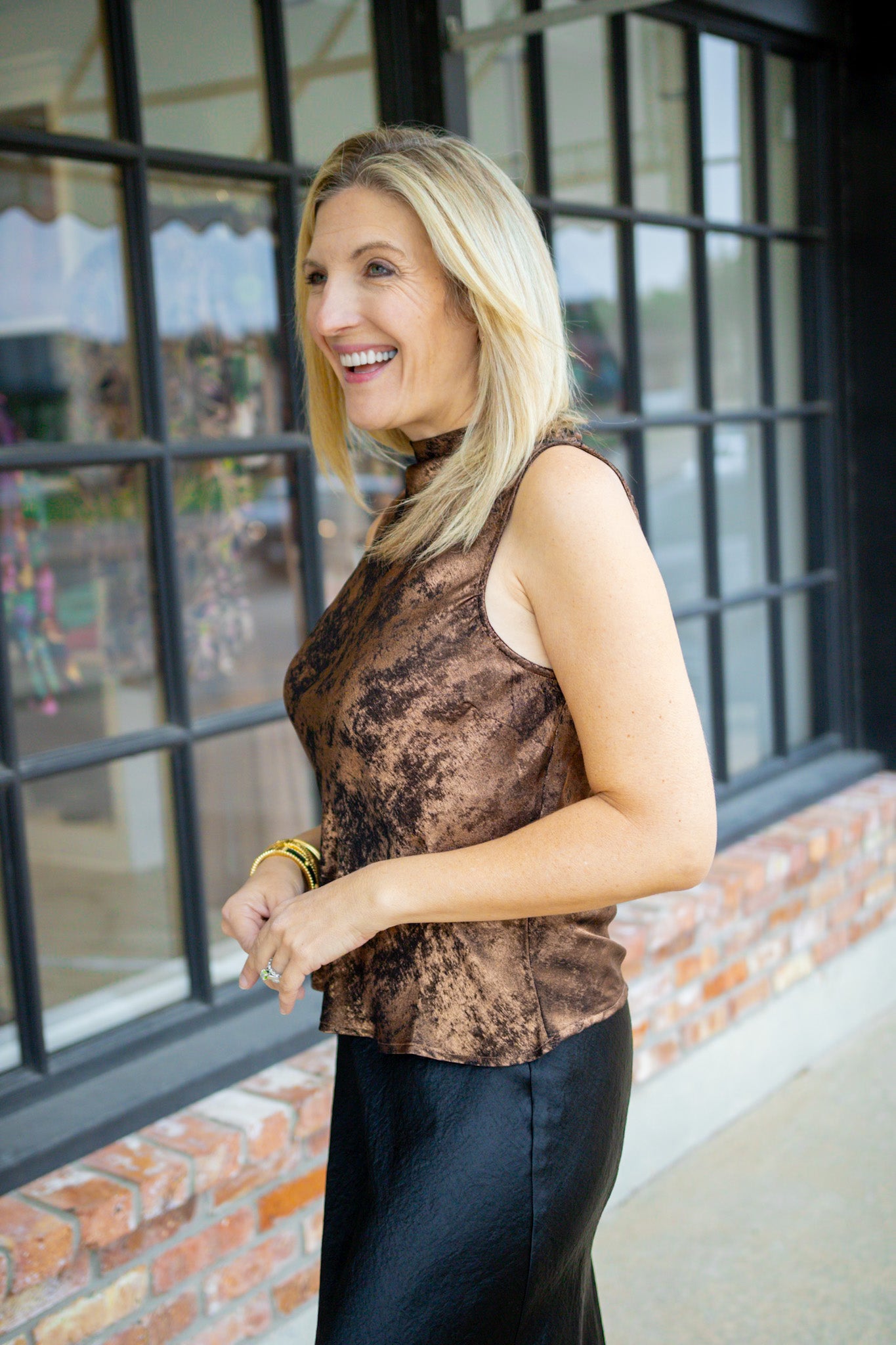 The Cowl Neck Bias Top is a polished style with a subtle shimmer, perfect for holiday gatherings or evening events.