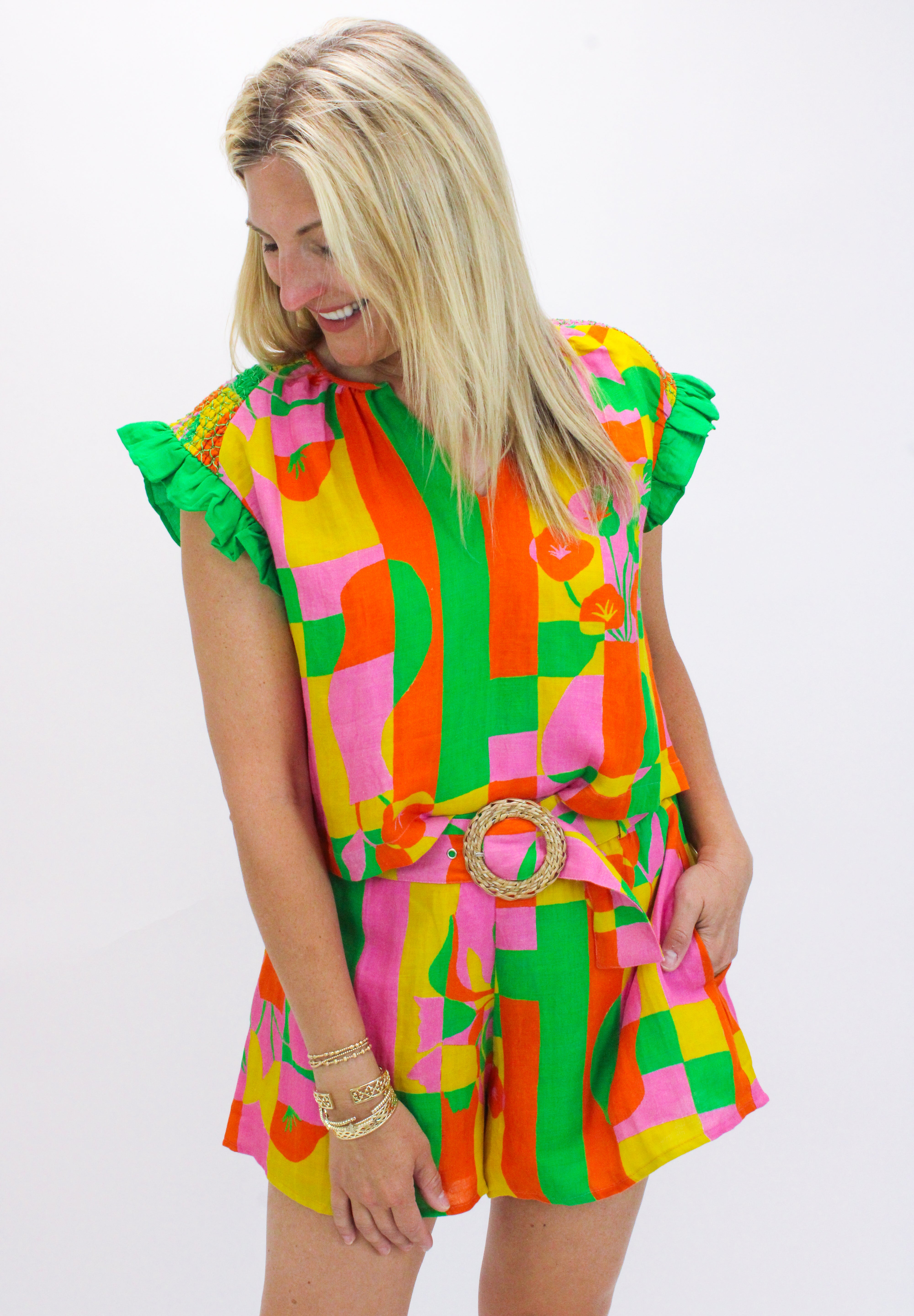 The Gigi top is back in our new Grasse print! It features a cap sleeve with smock detailing, a v-neckline, and a boxy fit for maximum comfort and cuteness! Pair with our James short in cabana for the full look.