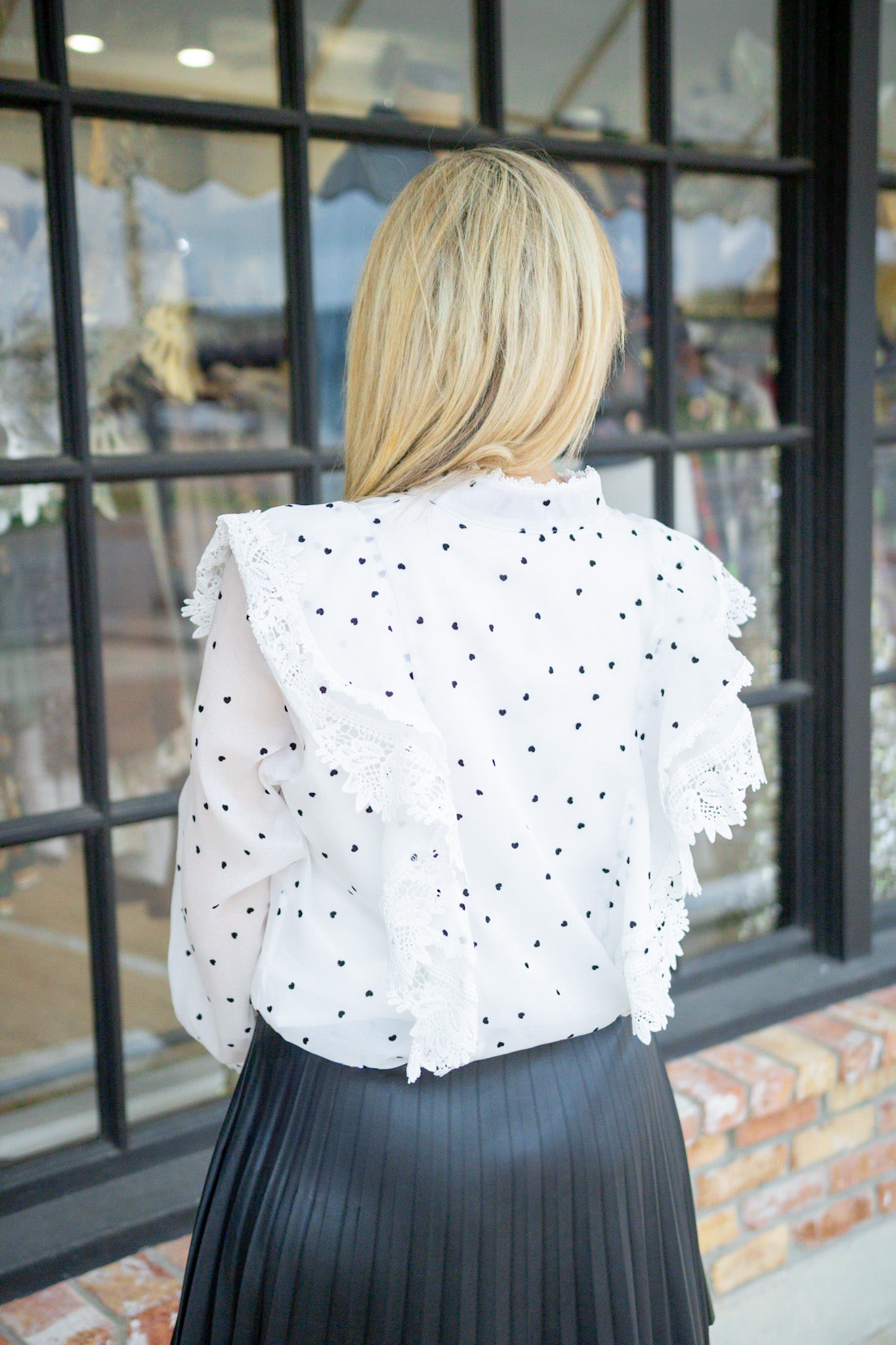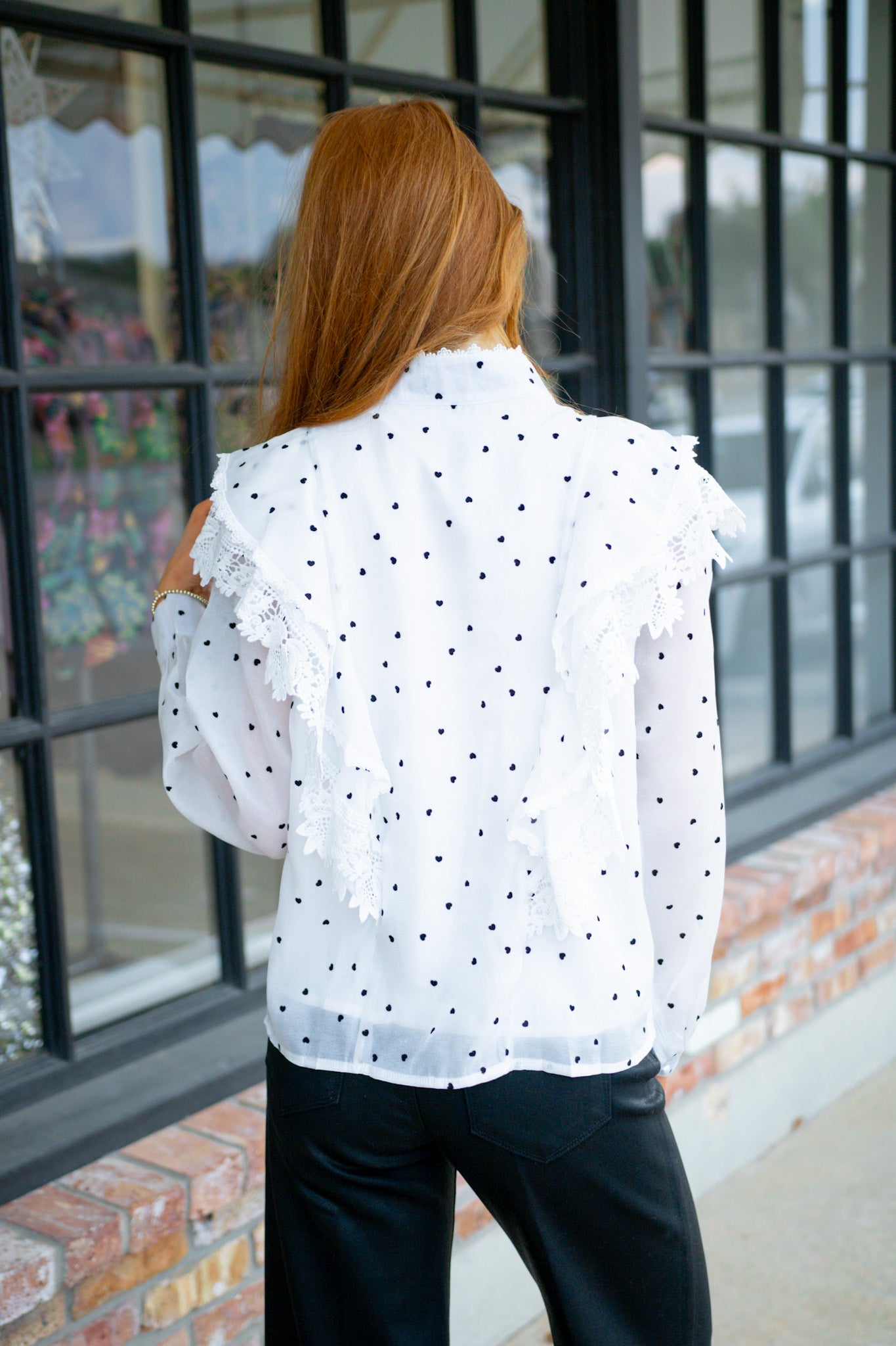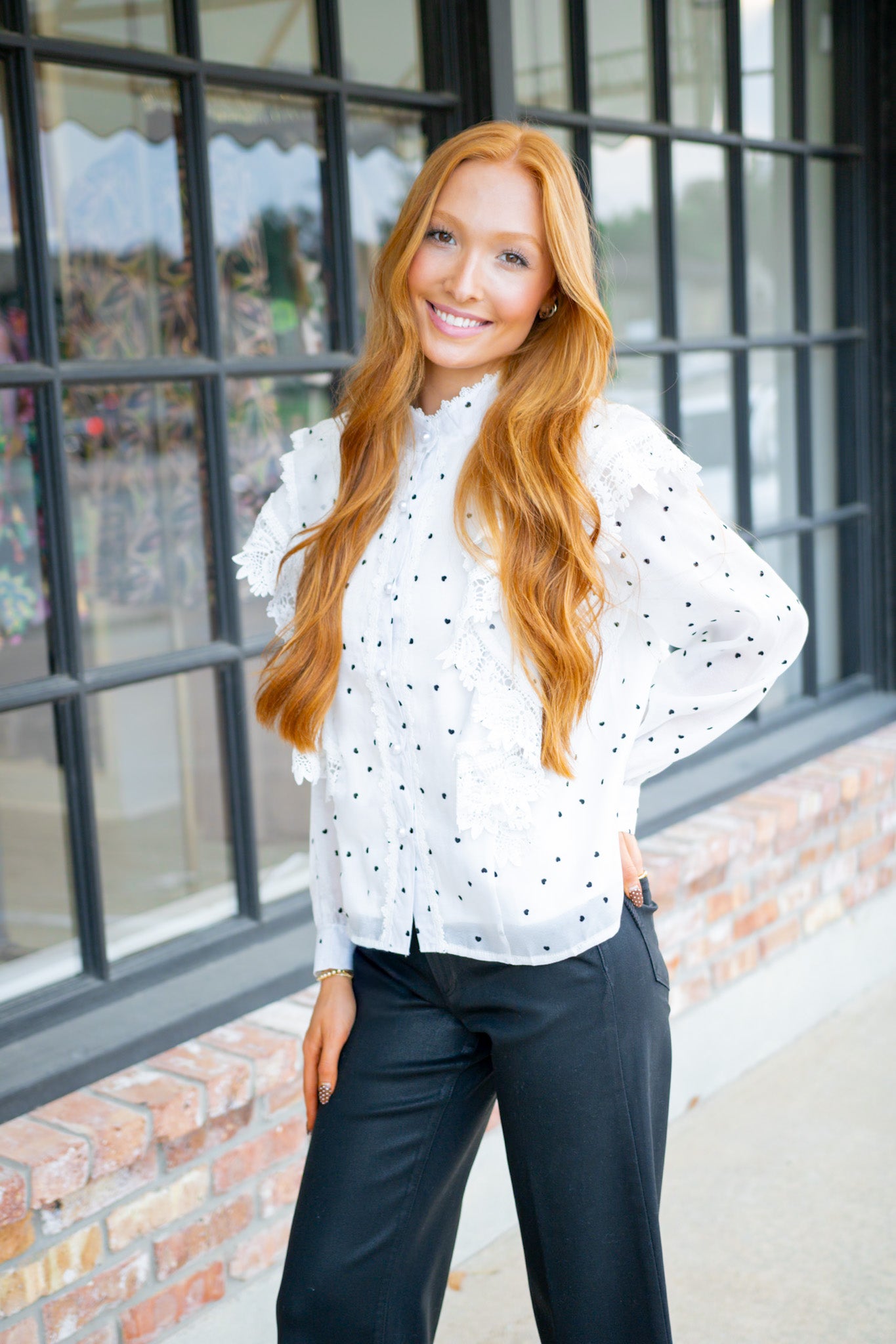 Wear your heart on your sleeve—literally—in this charming white blouse sprinkled with tiny black hearts. Delicate ruffle details add movement and texture, giving you that effortlessly romantic vibe. Perfect for layering or wearing solo, this playful piece brings a touch of sweetness to any outfit while keeping things fresh and fun.