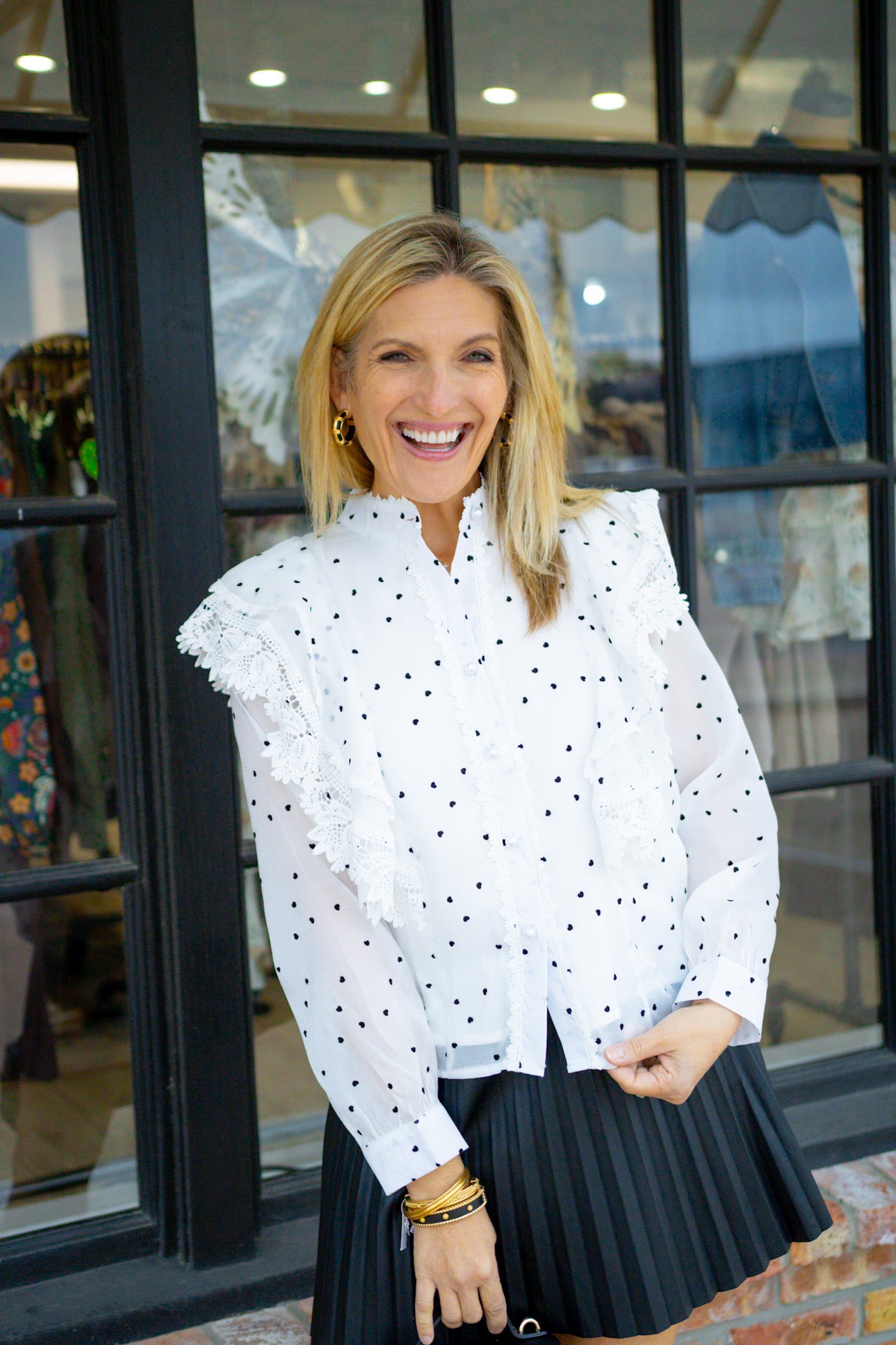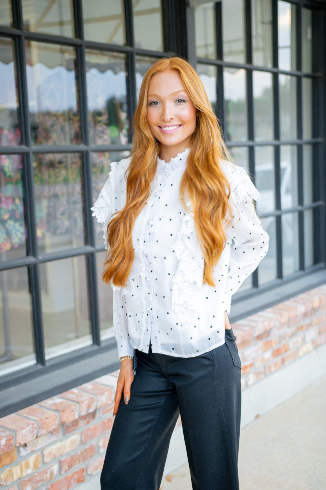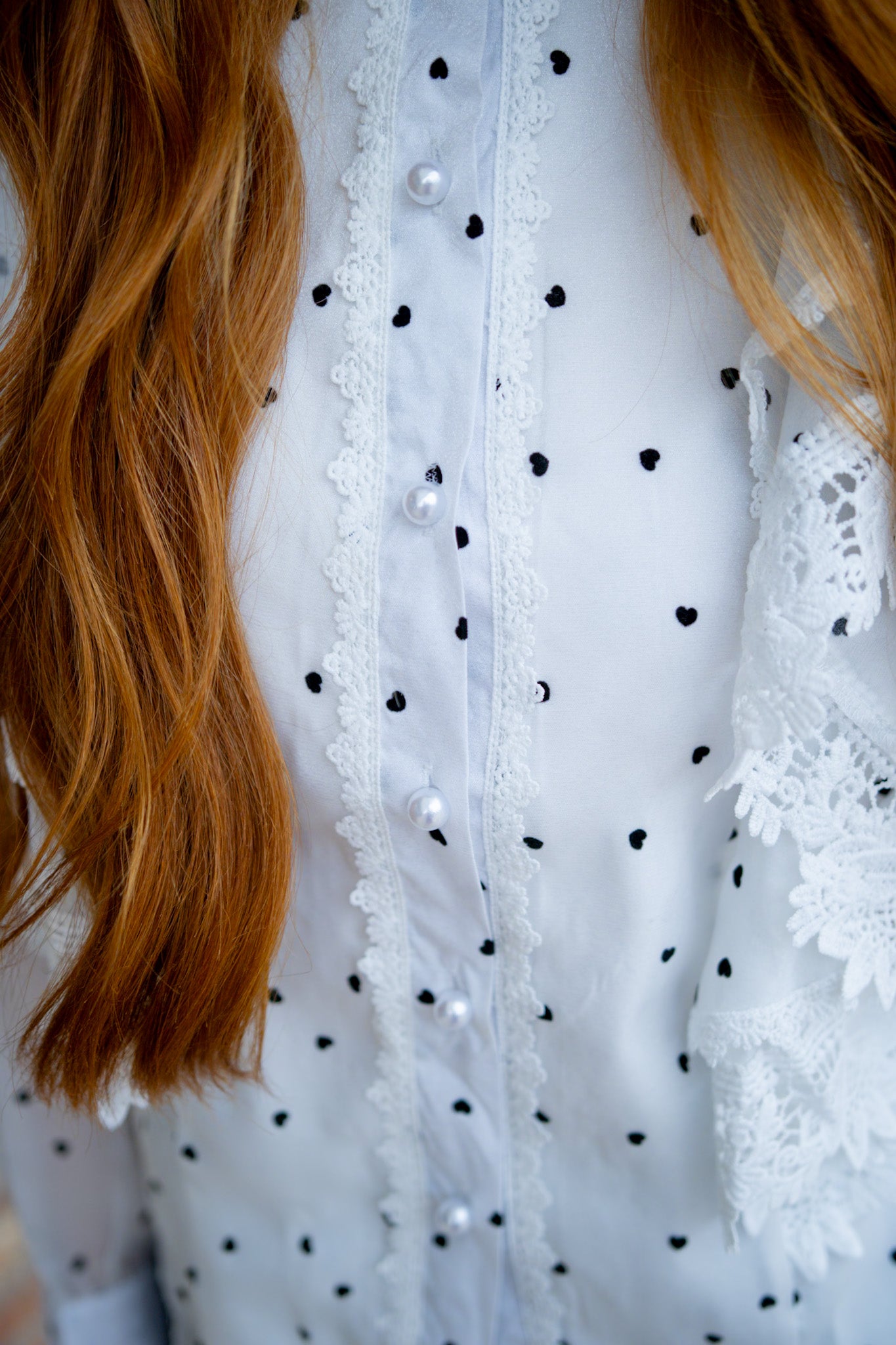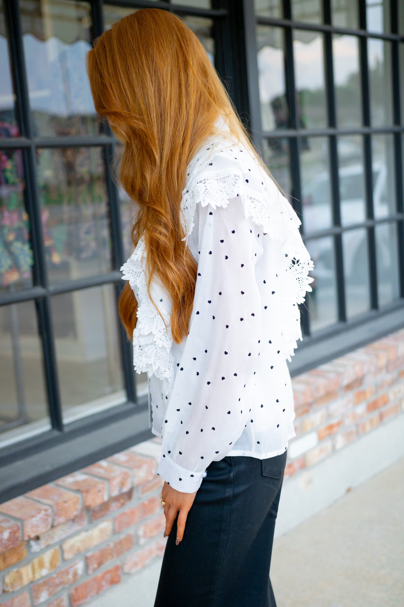 Wear your heart on your sleeve—literally—in this charming white blouse sprinkled with tiny black hearts. Delicate ruffle details add movement and texture, giving you that effortlessly romantic vibe. Perfect for layering or wearing solo, this playful piece brings a touch of sweetness to any outfit while keeping things fresh and fun.