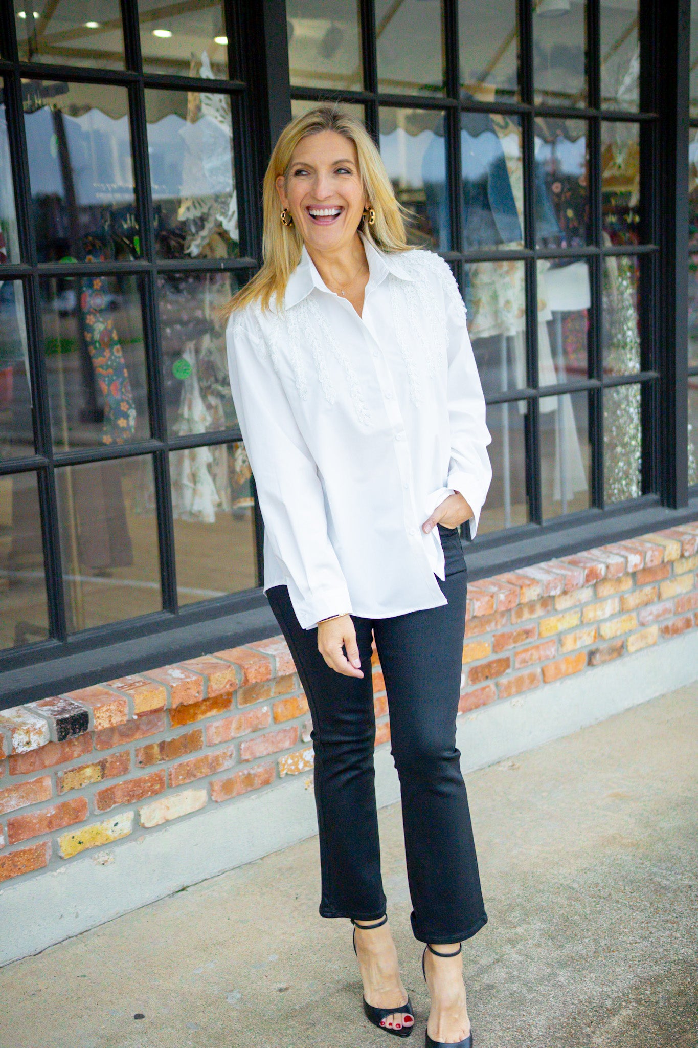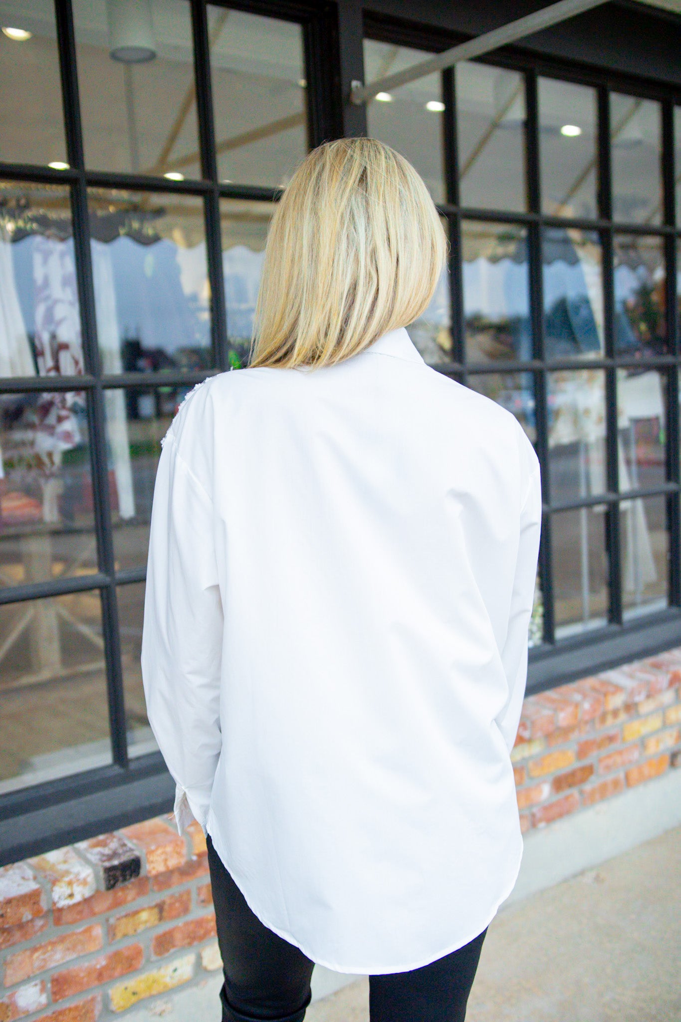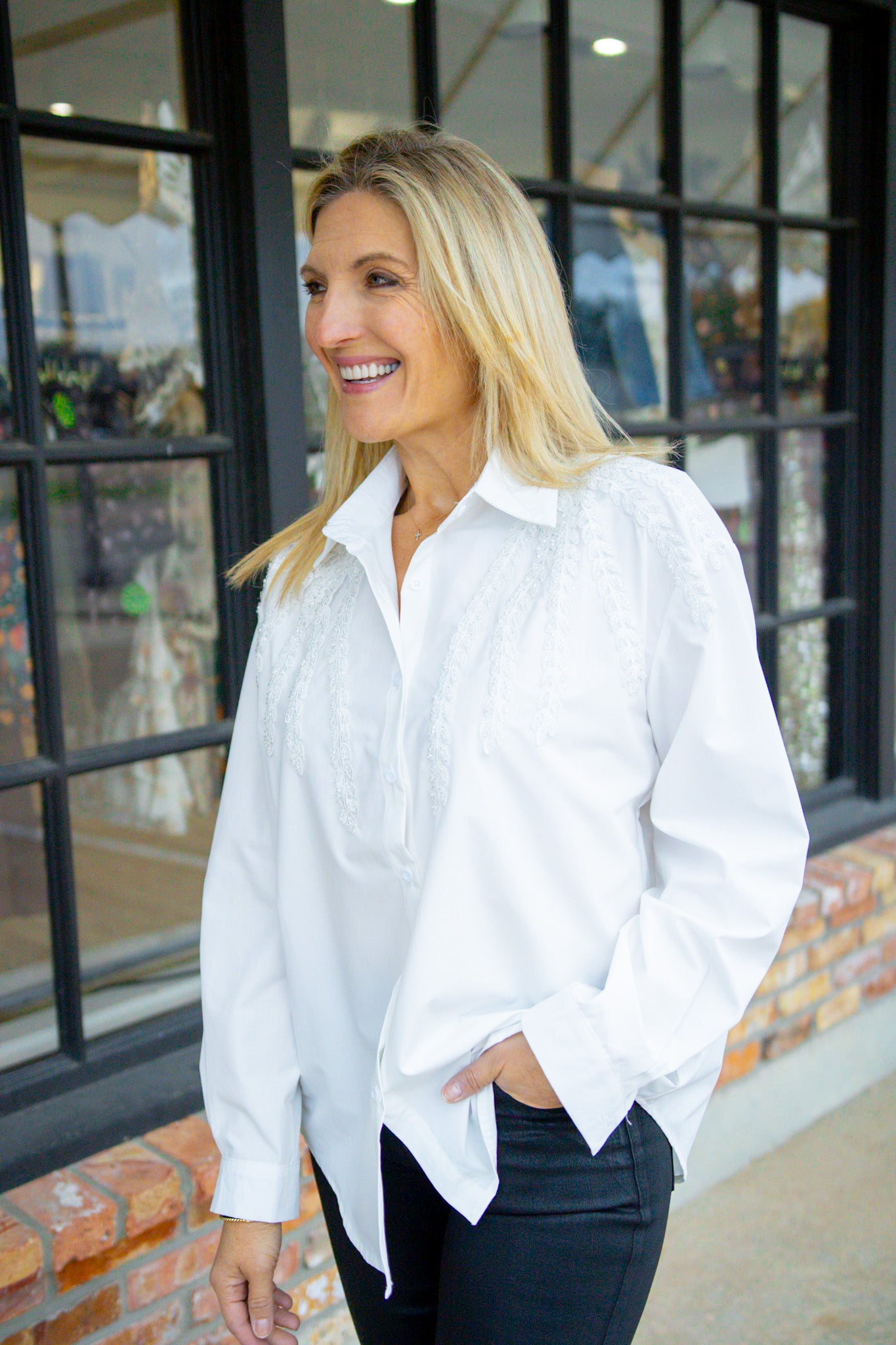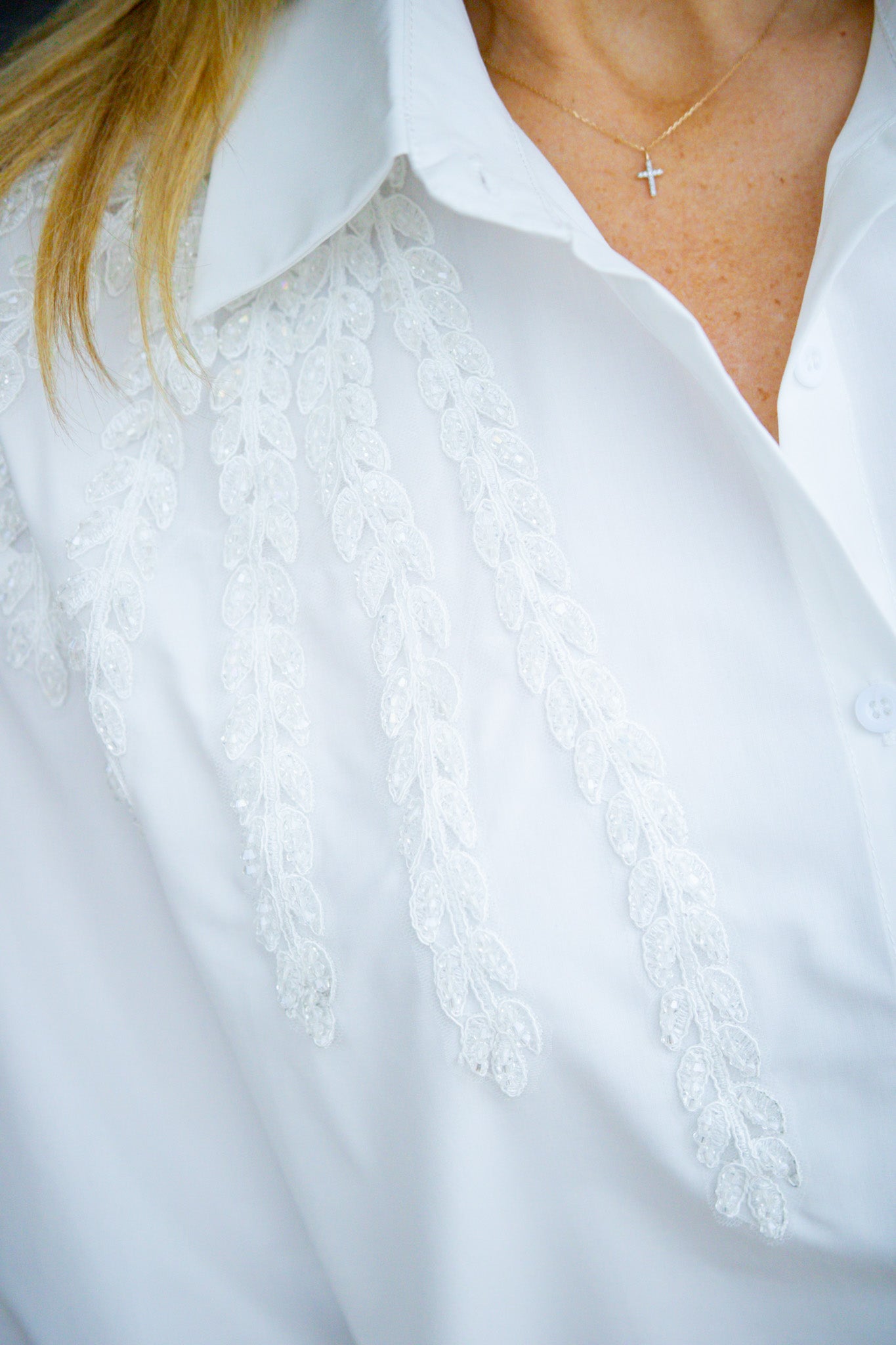 Elevate your everyday style with the Enchanted Frostvine Blouse. This playful piece blends comfort with sparkle, featuring a cotton-blend fabric that's soft against your skin and easy to care for. The standout sequined and beaded botanic wing design adds whimsical charm to a classic silhouette. With its crisp standard collar, front button closure, and long sleeves finished with single button cuffs, this shirt transitions seamlessly from casual outings to special occasions. The regular fit ensures a flattering look for all-day wear.
