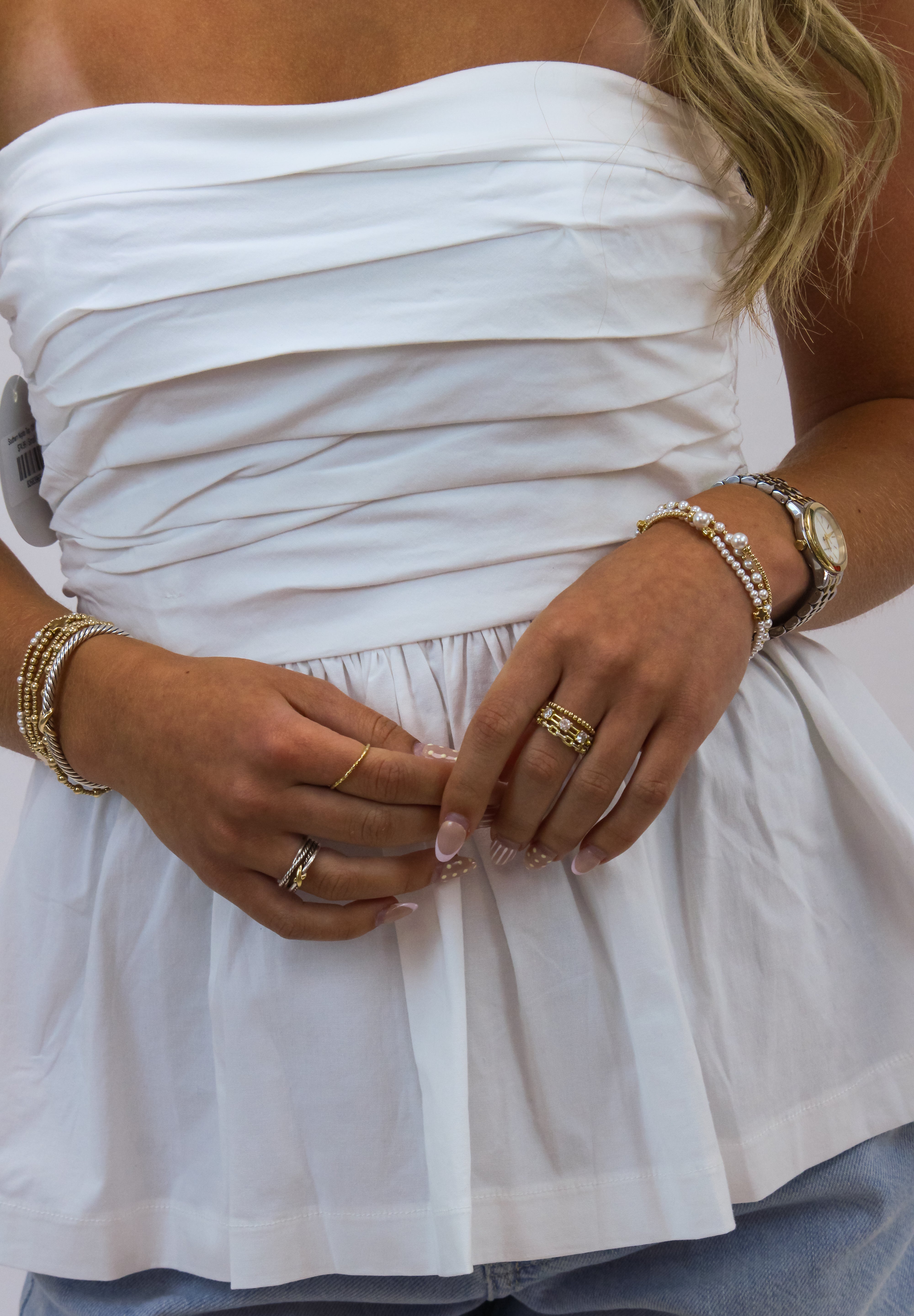 Get ready for a flirty and fun Southern night with our Off White Southern Nights Top. This bubbled peplum tube top not only adds a playful touch to your outfit but also features a smocked back for a comfortable and secure fit. Perfect for a night out or a music festival.