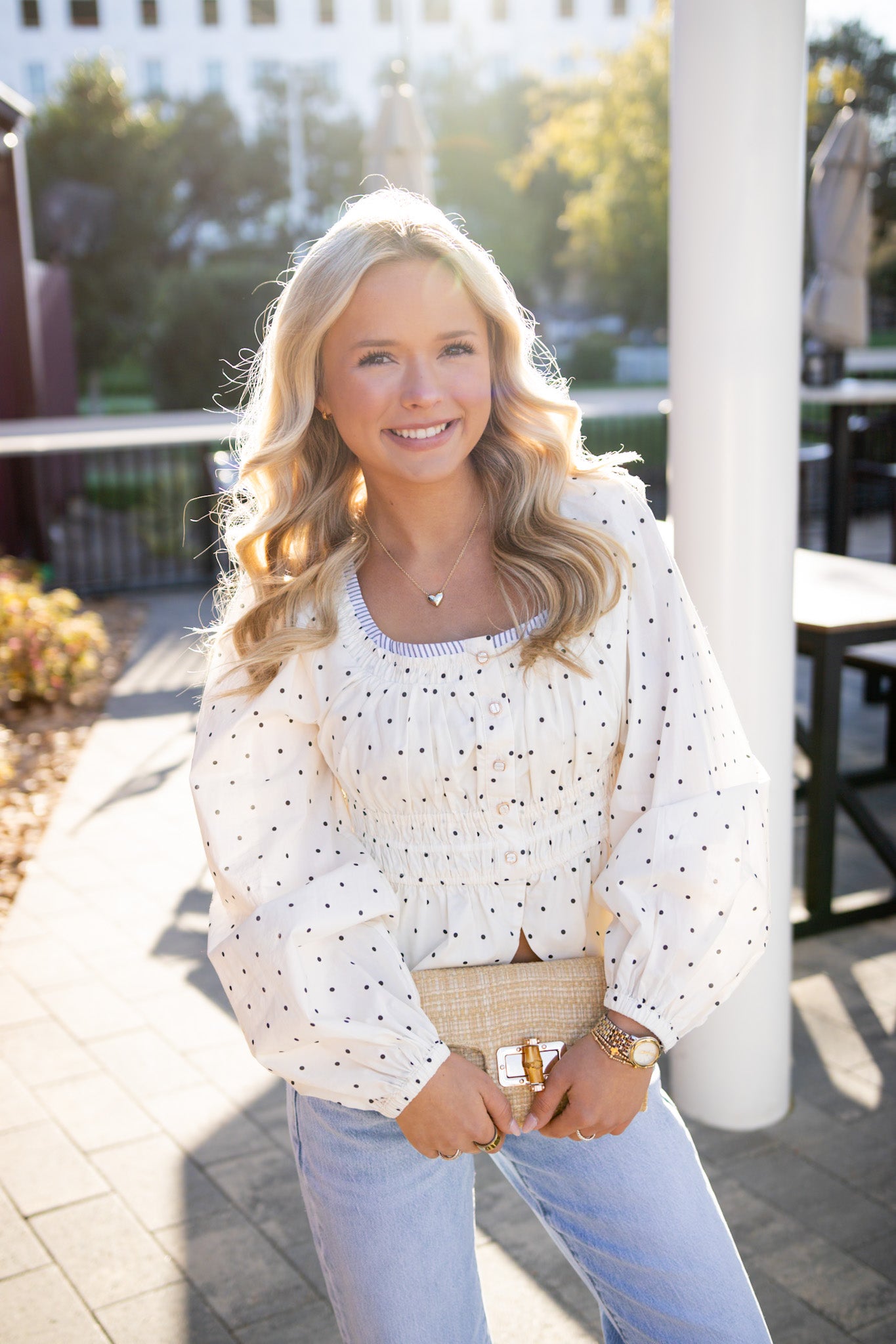Sweet dots steal the show on this breezy poplin top, where playful polka patterns pop against crisp white and black. Luxe gold and pearl buttons elevate the look, while striped trim along the collar adds a preppy punch. Dress it up with tailored trousers or keep it casual with your favorite denim—this versatile piece is ready for whatever your day brings.