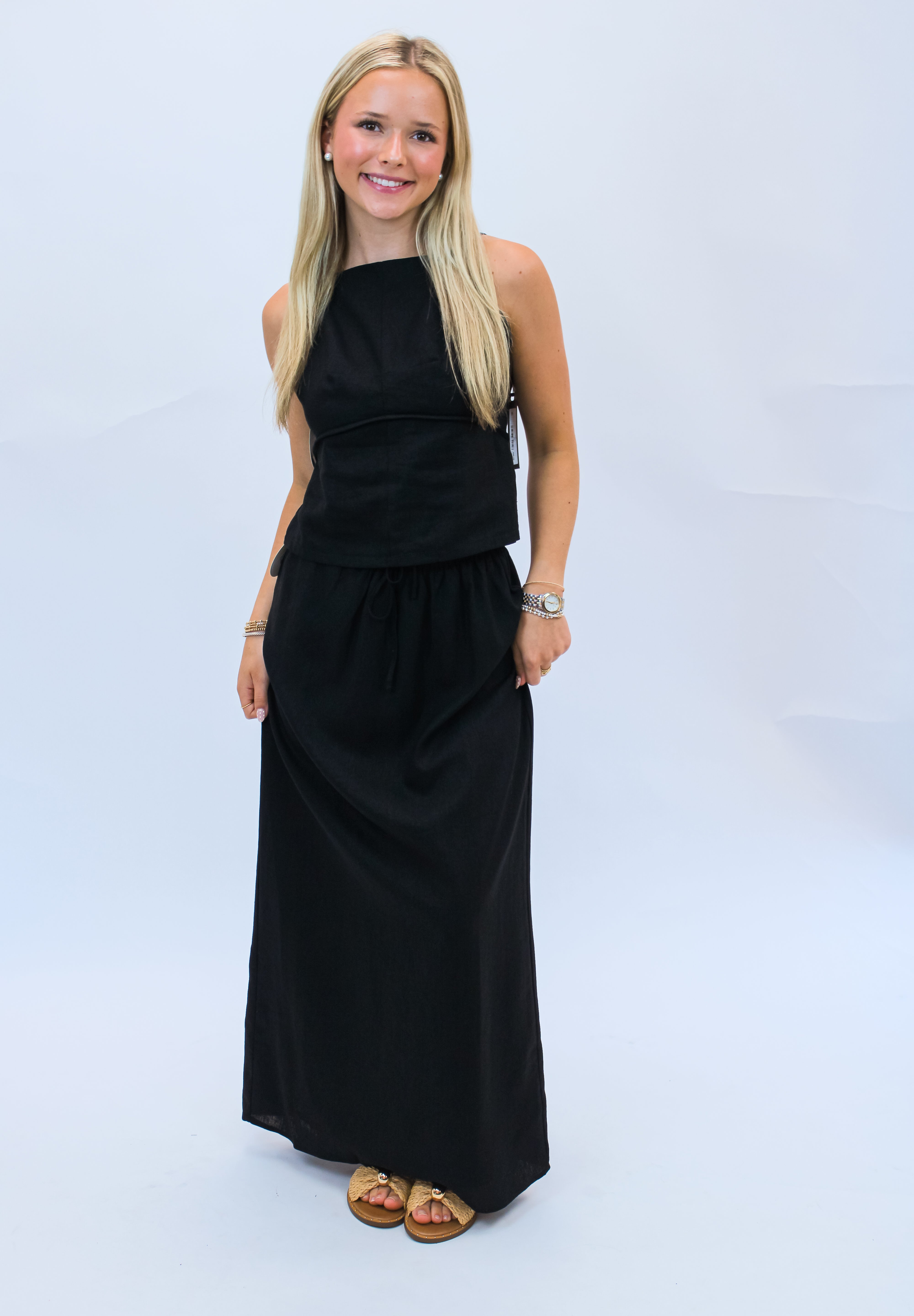 The Teigan Top in black is a sleek and stylish choice with a high halter neckline and an open back that turns heads. Fully adjustable straps and back details let you customize your fit for comfort and flair. Pair it with the matching Cadi Skirt for a playful, coordinated look that’s perfect for any occasion.
