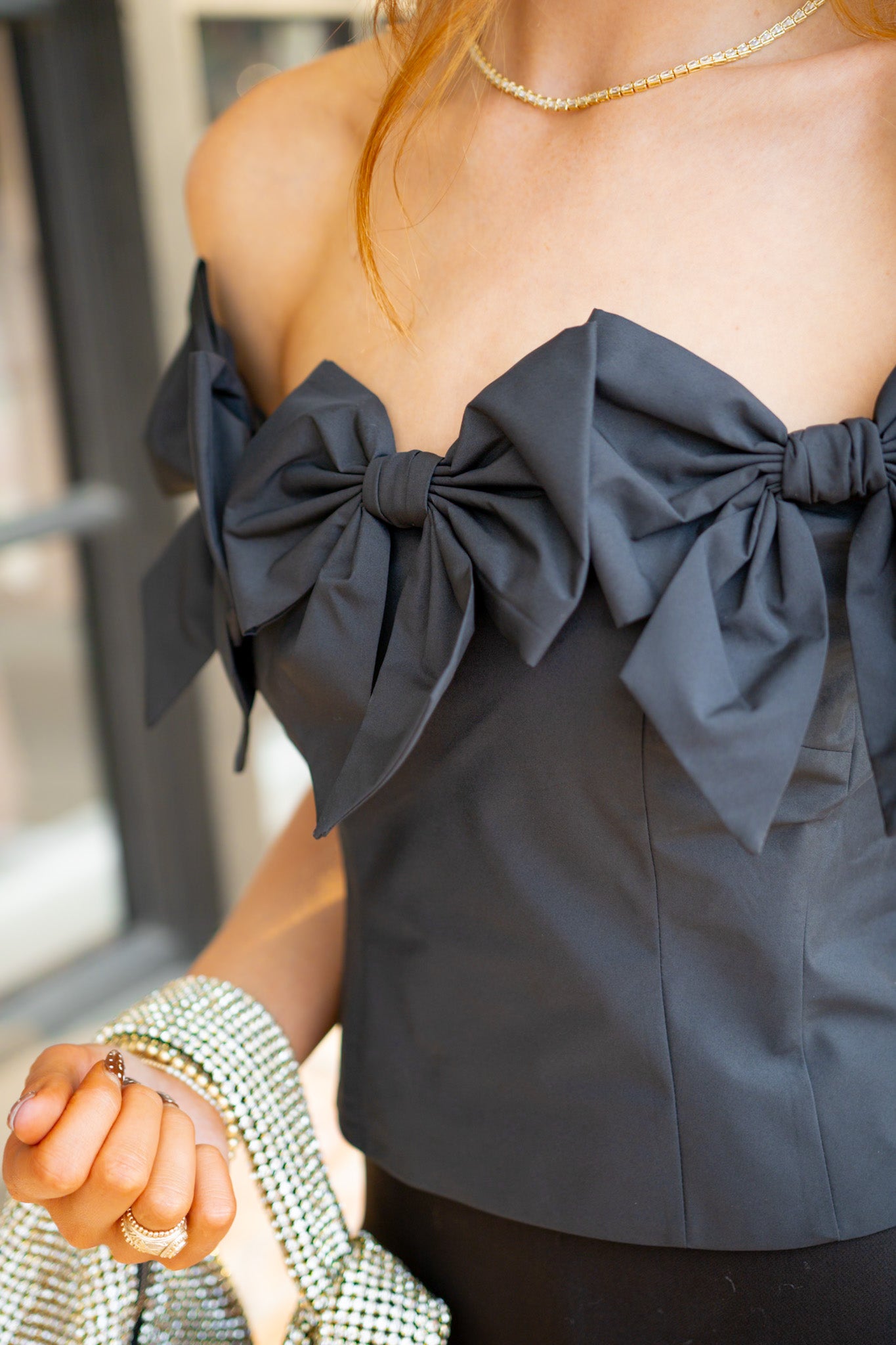 Romantic and statement-making, the Winston Top captures the magic of a holiday evening. Designed from rich taffeta fabric, this cropped off-the-shoulder silhouette features princess seams for a beautifully sculpted fit. Along the neckline, gorgeous bows are delicately placed, adding whimsical charm and drama. The elastic armbands ensure comfort and flexibility beneath the bows, while a hidden side zipper allows for a seamless finish.