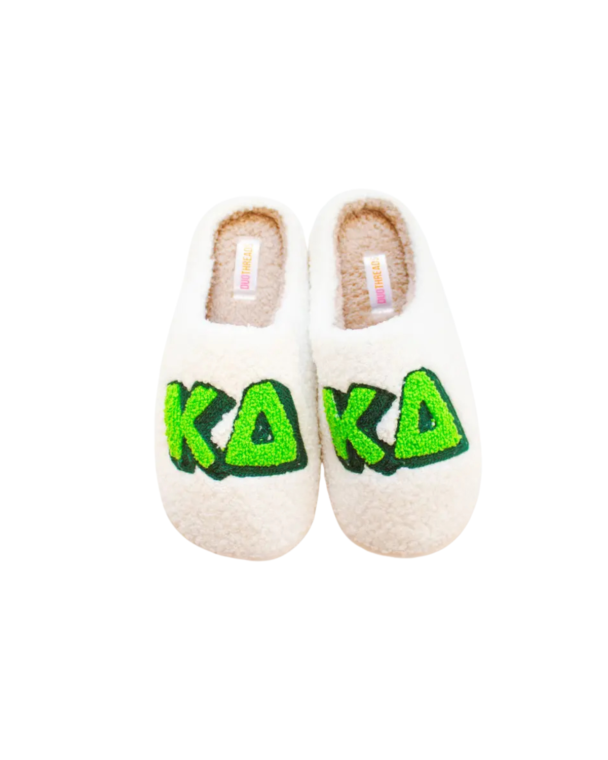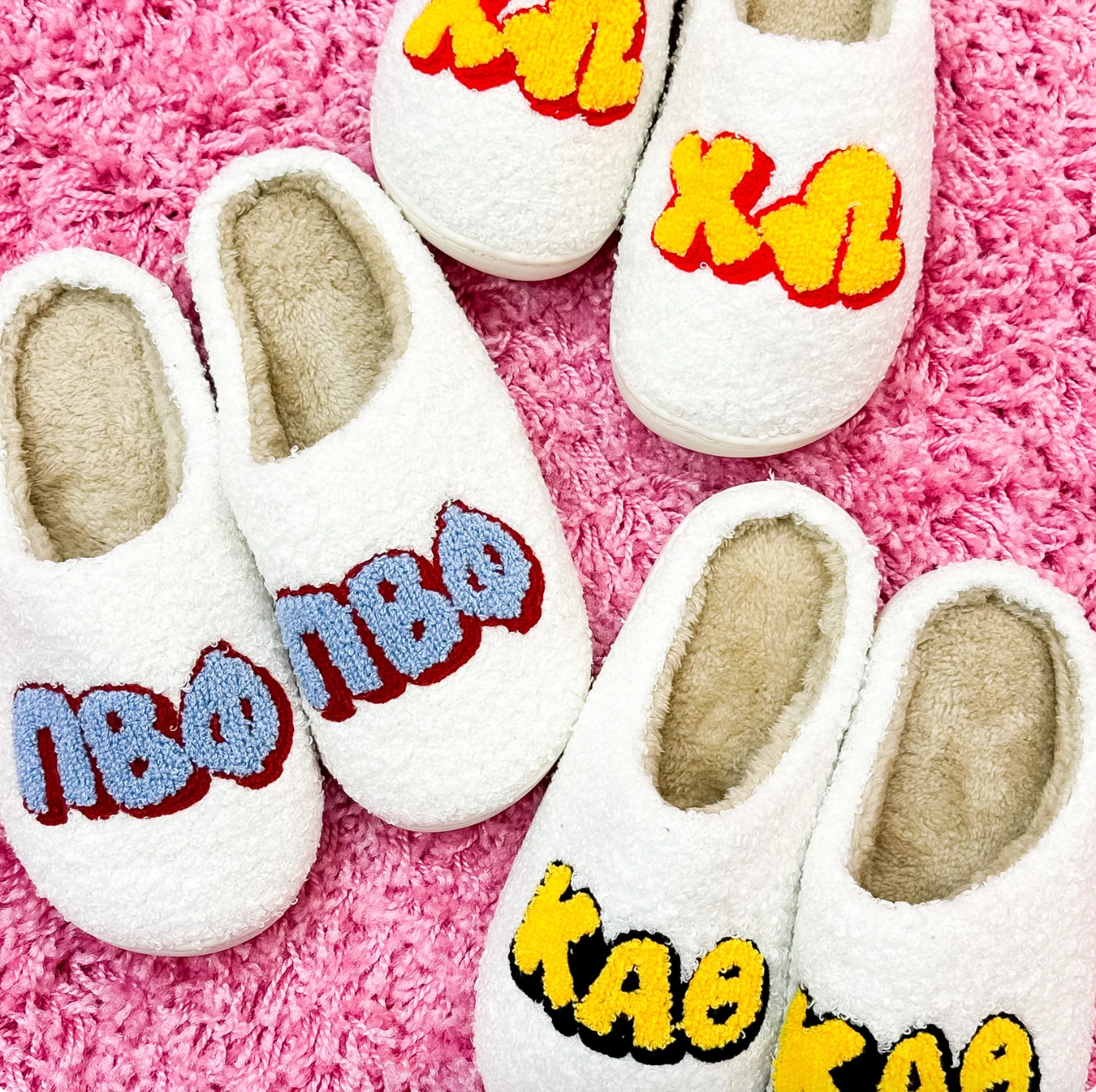 Kick back and rep your sorority with these cozy slippers. Show off your sisterhood in style with these ultra-comfortable slippers. Perfect for lounging and showing off your Greek pride!