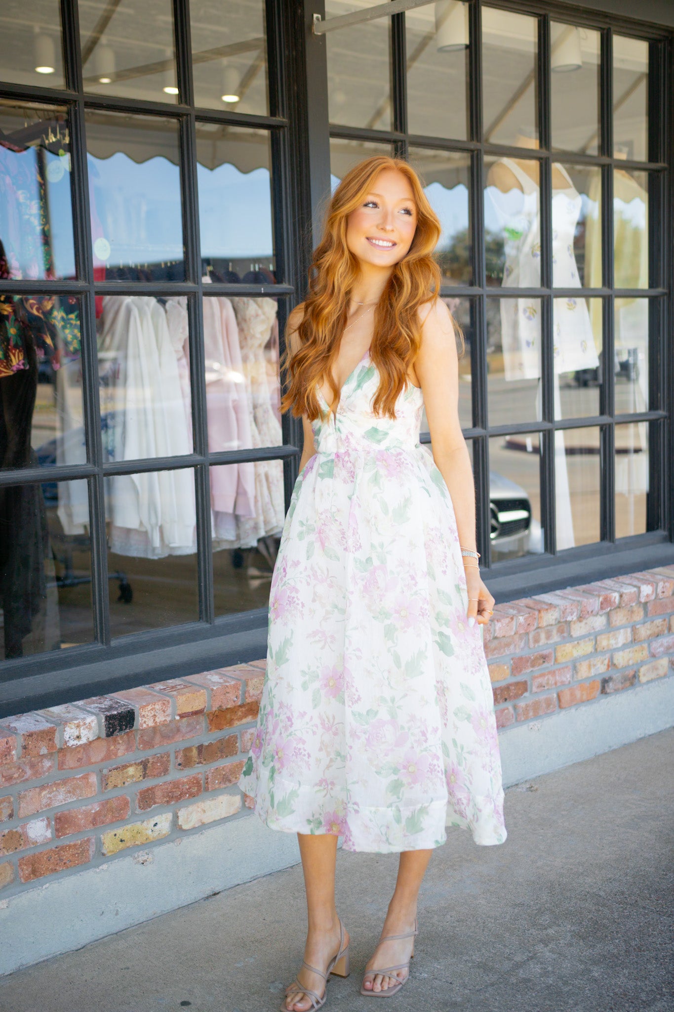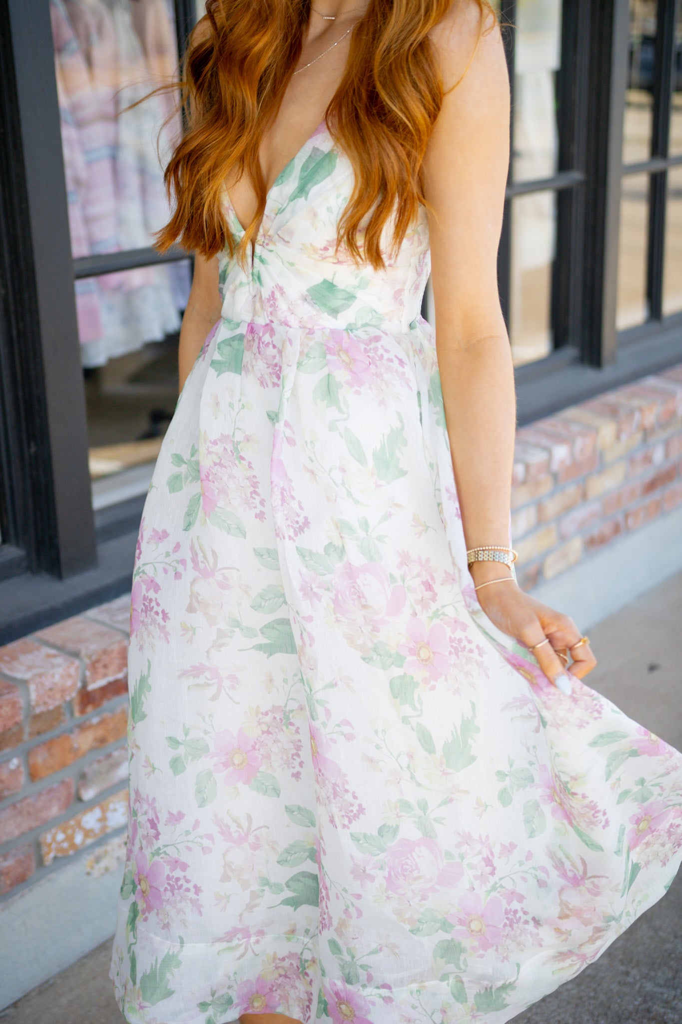 Soft watercolor florals and a plunging V-bar neckline bring romantic sophistication to this midi dress. The pleated bodice and organza-lined A-line skirt create ethereal movement.
