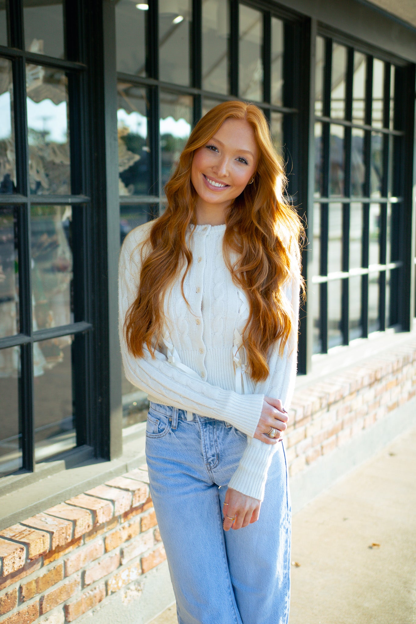 Stay cozy and chic with the Saidee Cardigan. The cream cable-knit design is accented with woven ribbon ties for a playful touch. Keep warm with the ribbed crewneck, long sleeves and front button closures. Perfect for any occasion, this cardigan is a must-have for your wardrobe.
