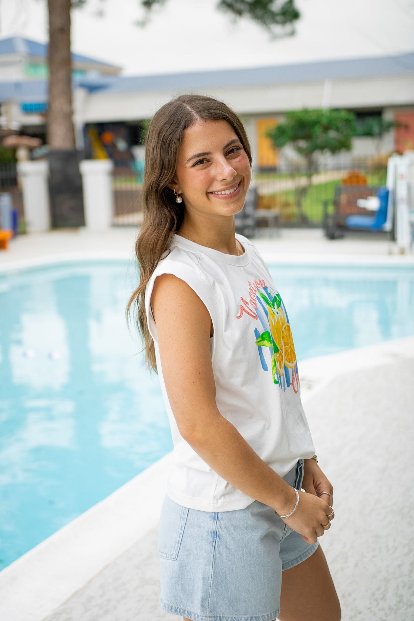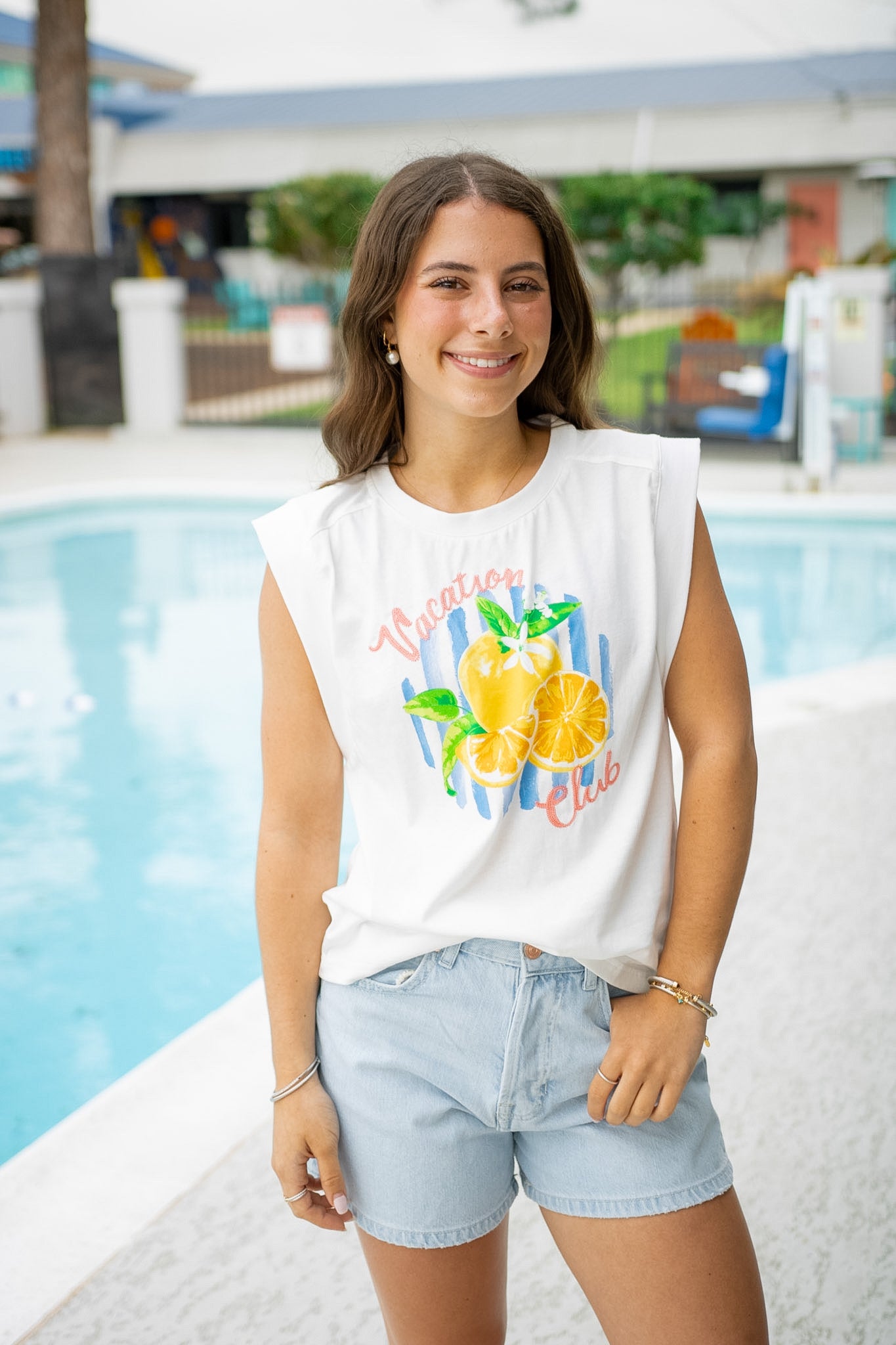 Sunny days called, and this top answered. This relaxed graphic muscle tee features a cheerful lemon design with “Vacation Club” lettering that instantly brings the fun, getaway vibe. The soft fabric and easy sleeveless silhouette make it perfect for warm days, whether you’re lounging poolside, running errands, or heading out for a casual summer afternoon. Pair it with denim shorts or a breezy skirt for an effortlessly cute look.