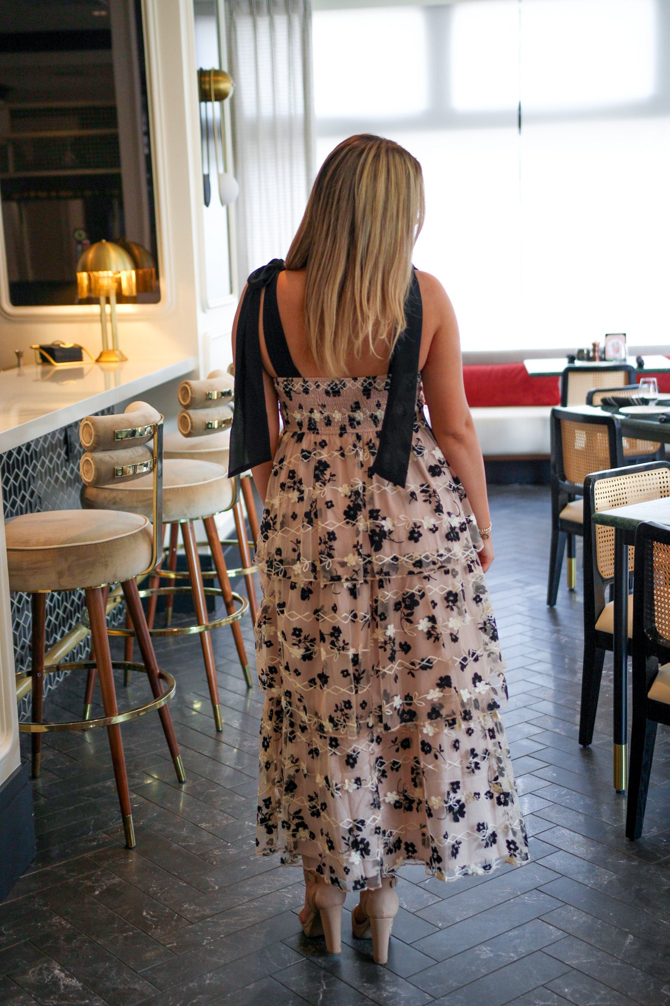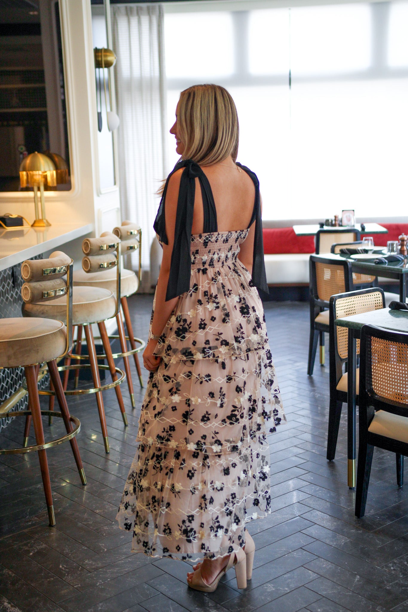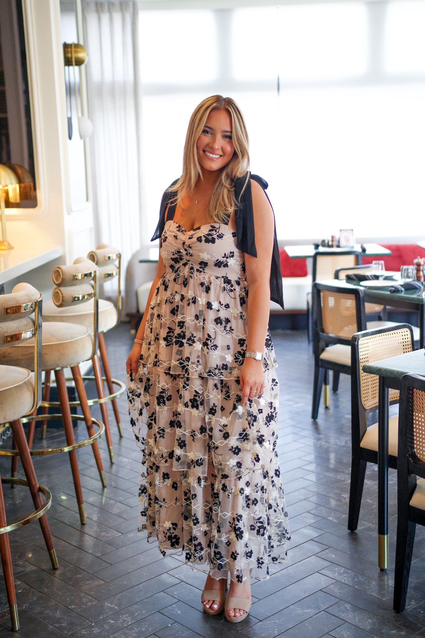 Step into a fairytale in The Moonlight Bloom Dress, a truly enchanting piece. This dress features a soft taupe base with a delicate mesh overlay adorned with intricate black and white floral embroidery. The thick, black ribbon shoulder ties add a romantic touch and are fully adjustable for a perfect fit. With its flowing, tiered silhouette, this dress is made for twirling under the moonlight.