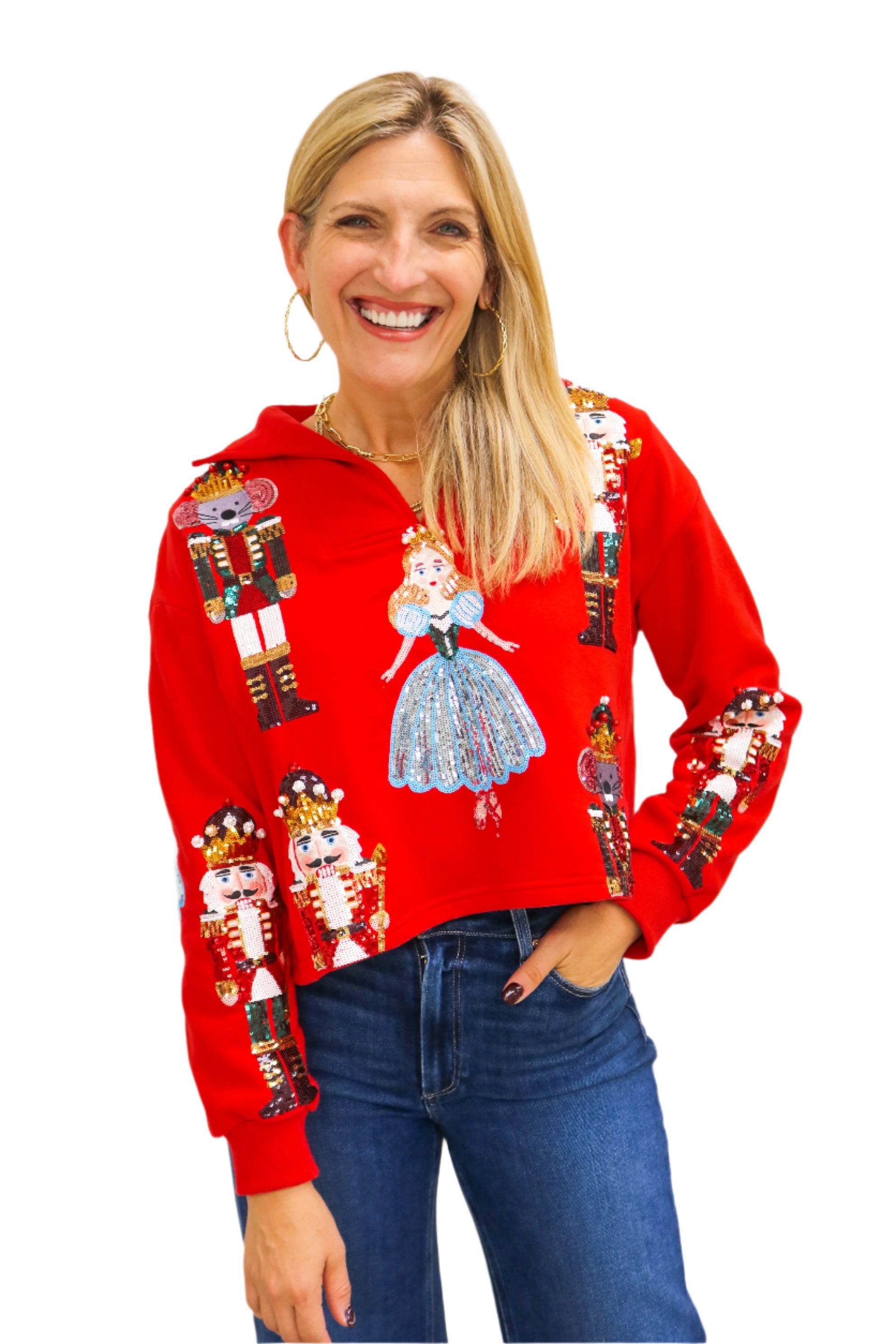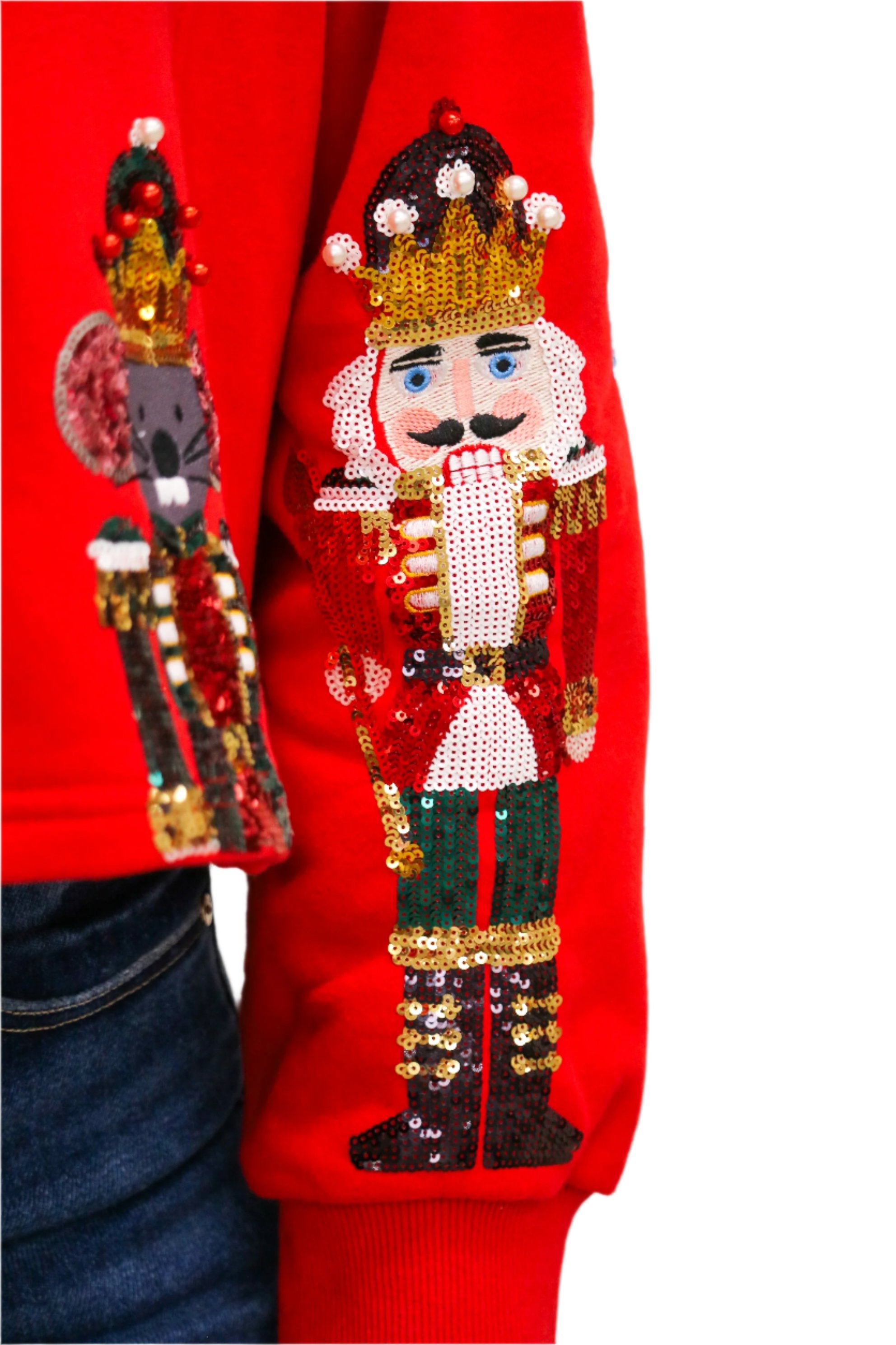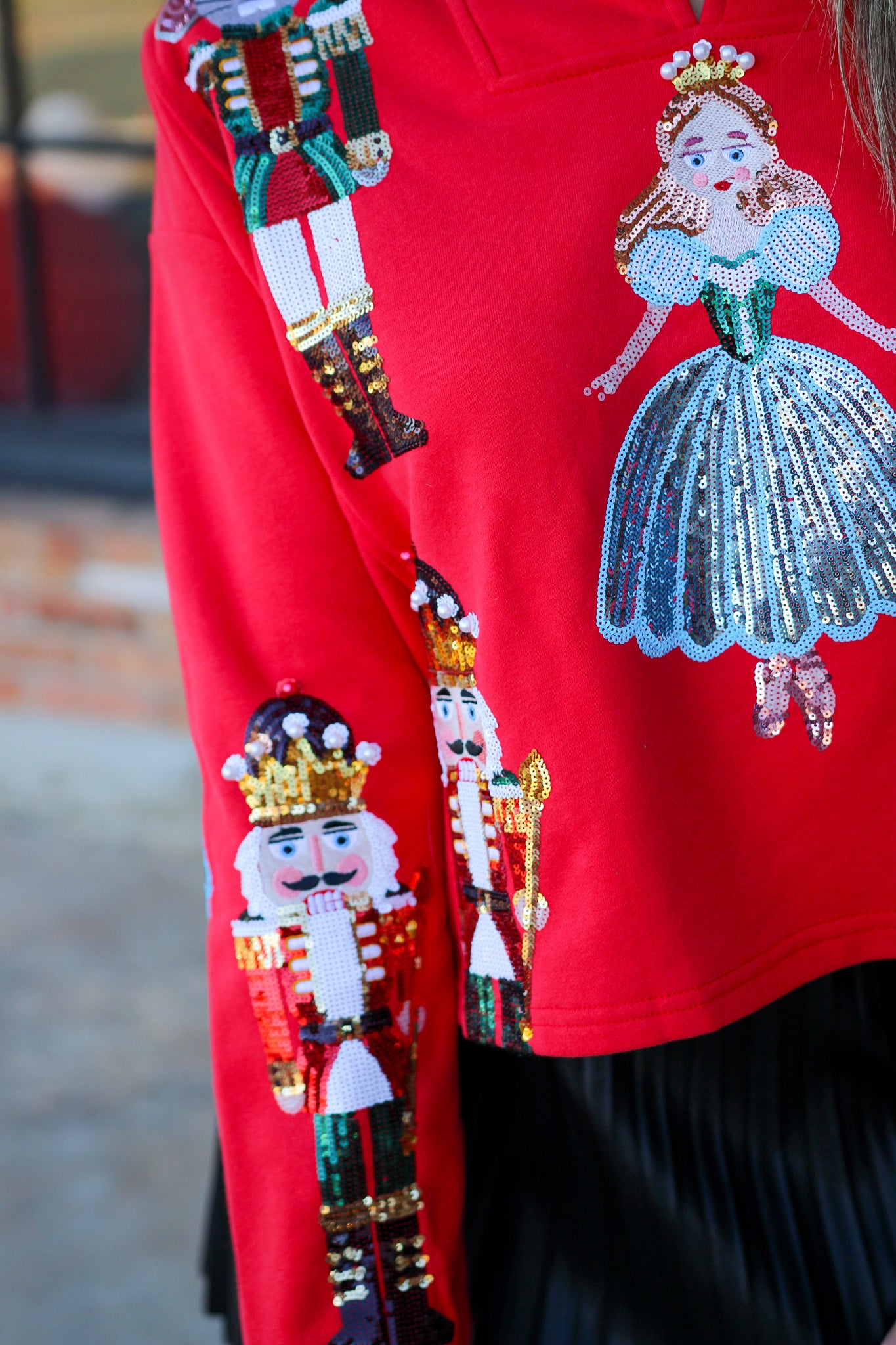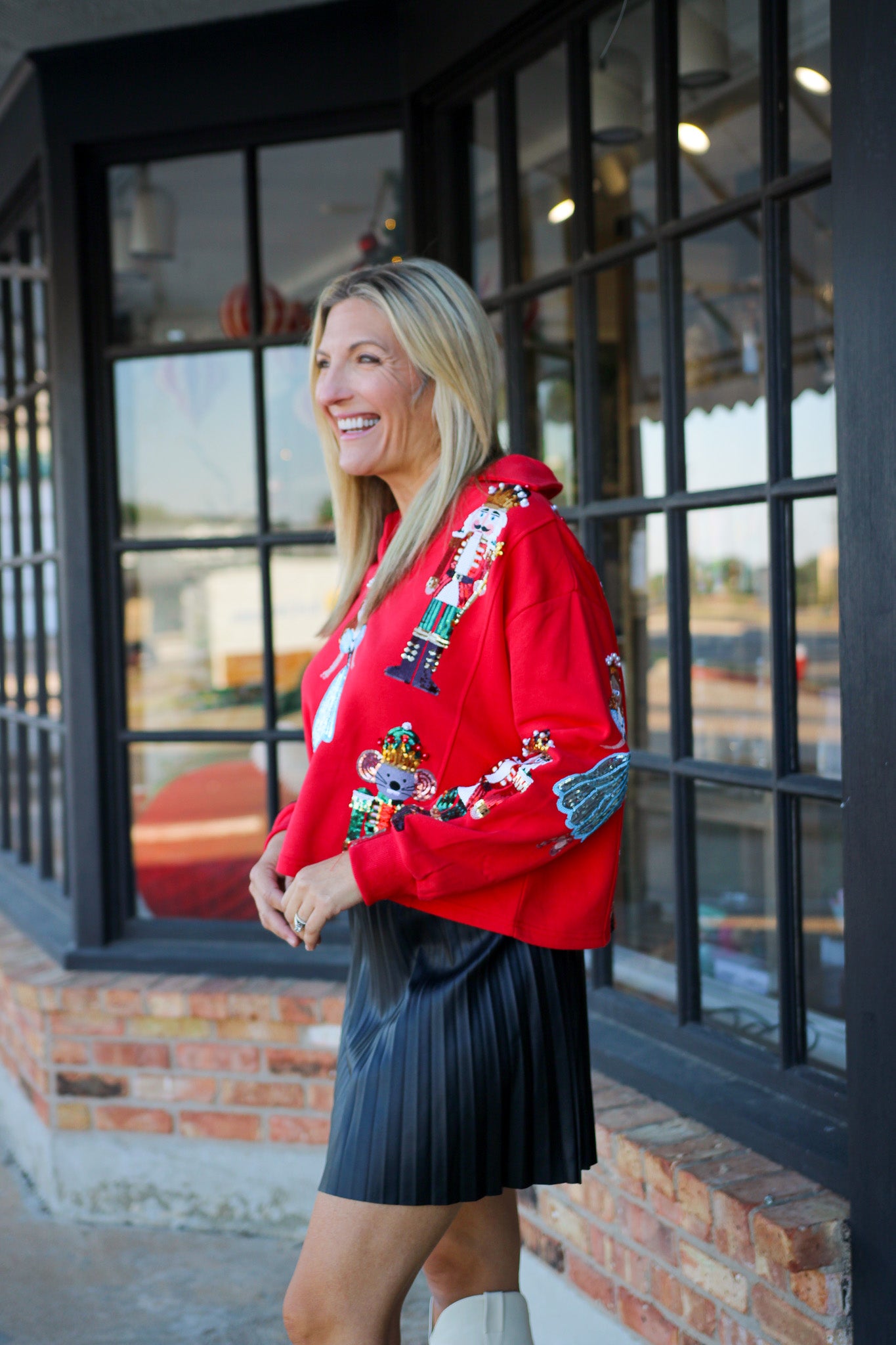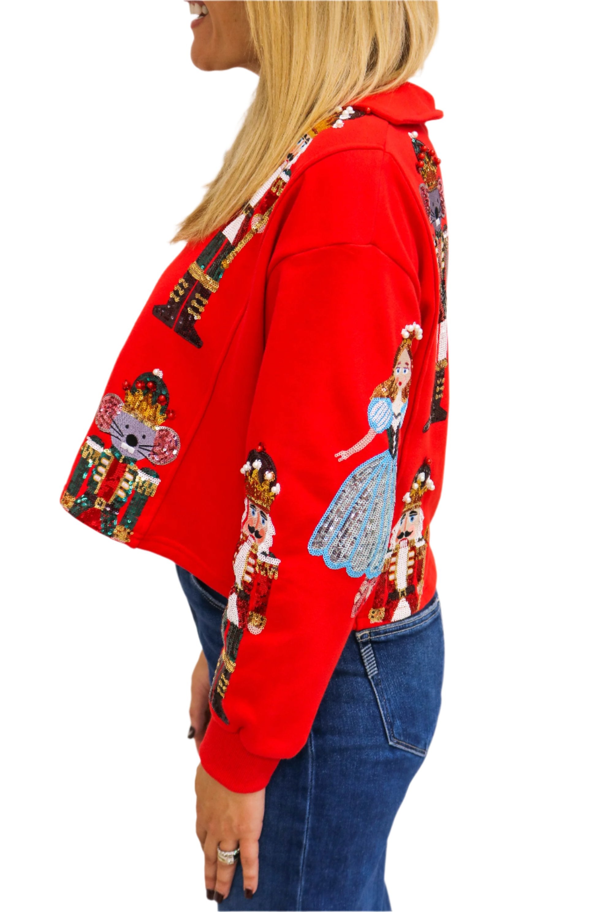 This cropped sweatshirt is perfect for your holiday wardrobe. Its relaxed and oversized fit is both comfortable and trendy. The bold collared neckline adds a touch of sophistication, while the bright holiday red and sequin nutcracker characters make a playful statement. Dress up or down for any occasion!