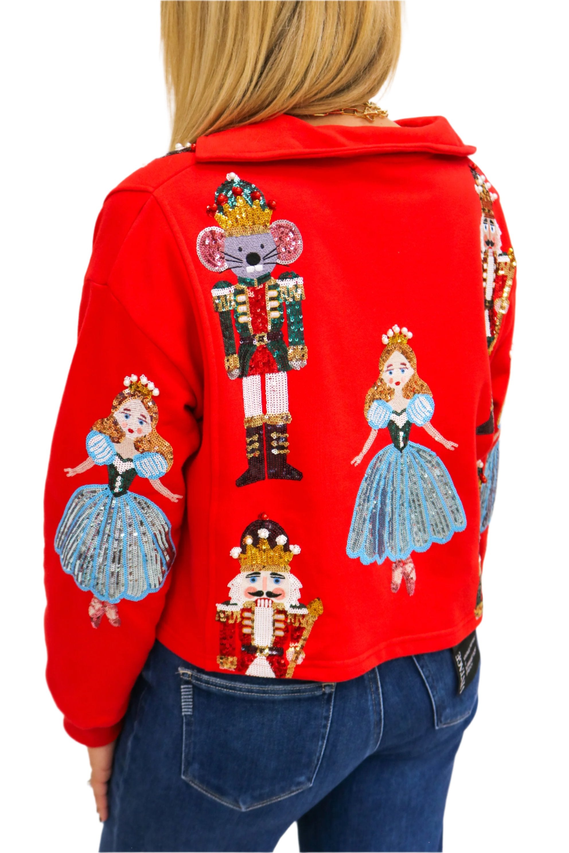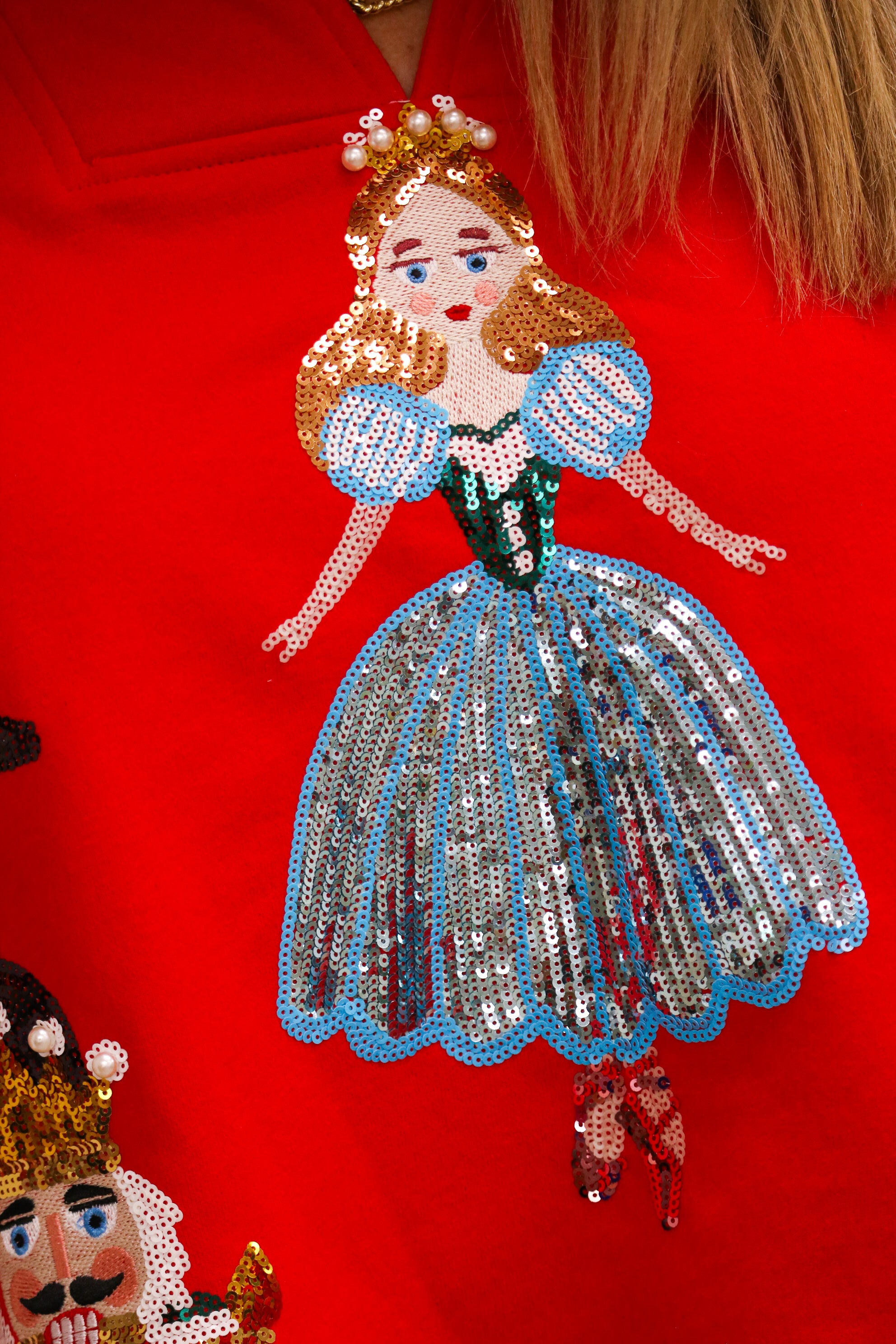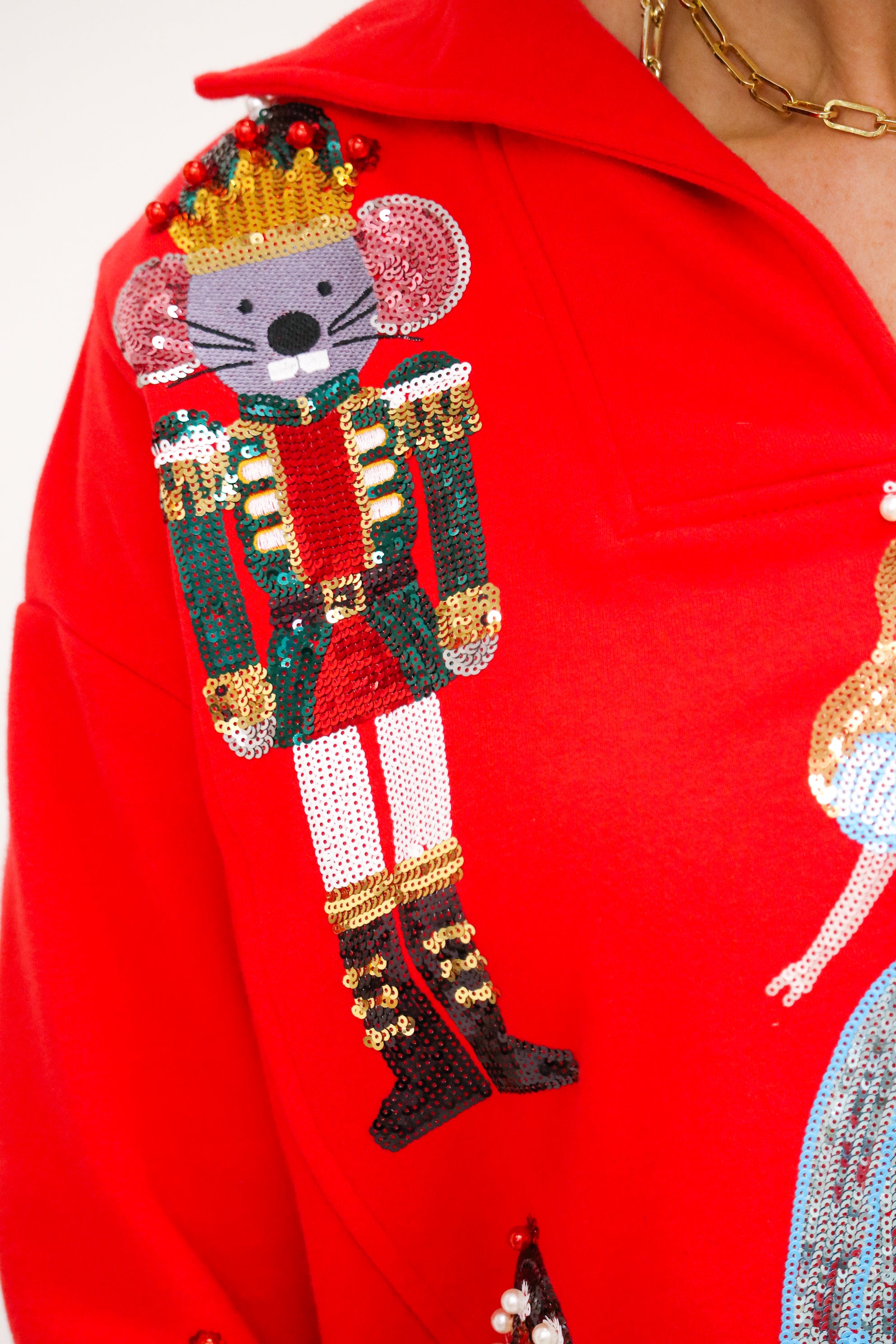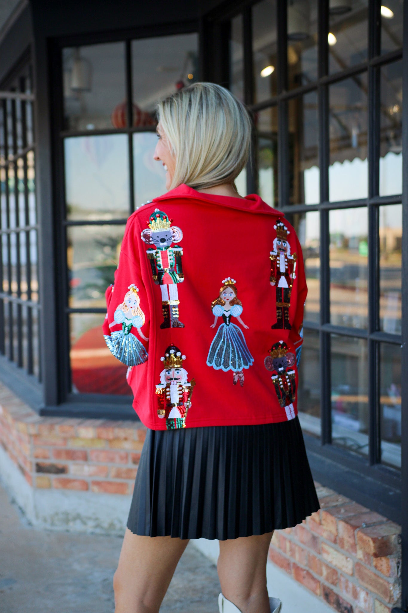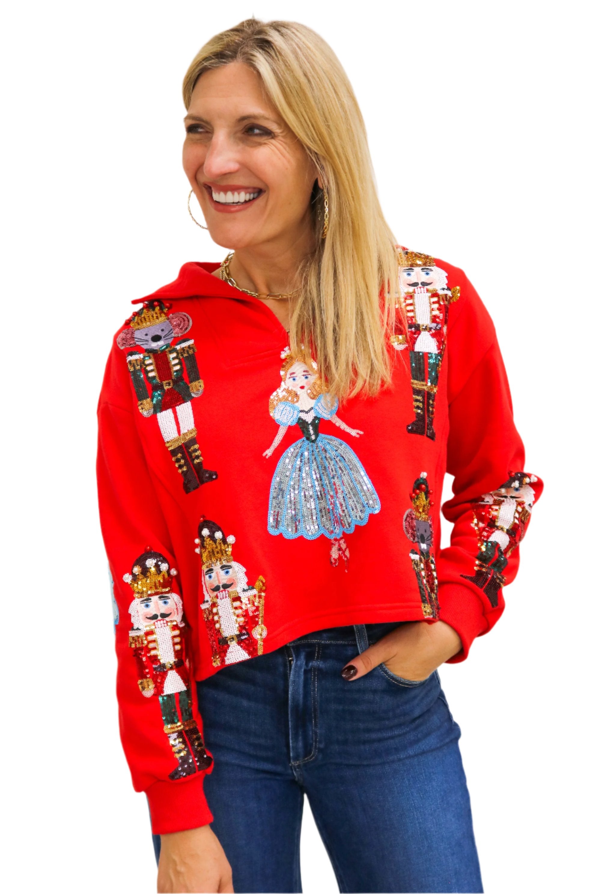 This cropped sweatshirt is perfect for your holiday wardrobe. Its relaxed and oversized fit is both comfortable and trendy. The bold collared neckline adds a touch of sophistication, while the bright holiday red and sequin nutcracker characters make a playful statement. Dress up or down for any occasion!