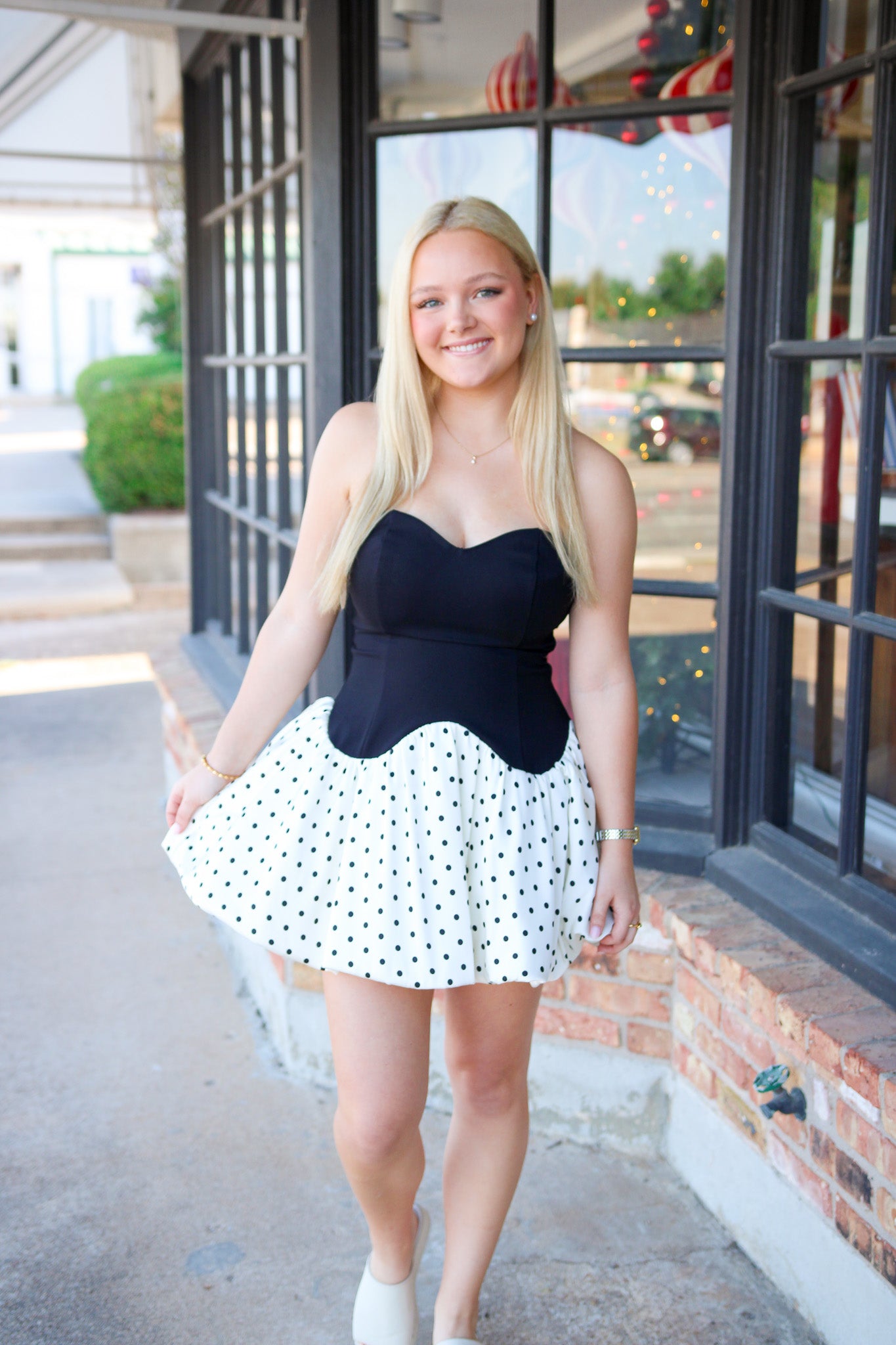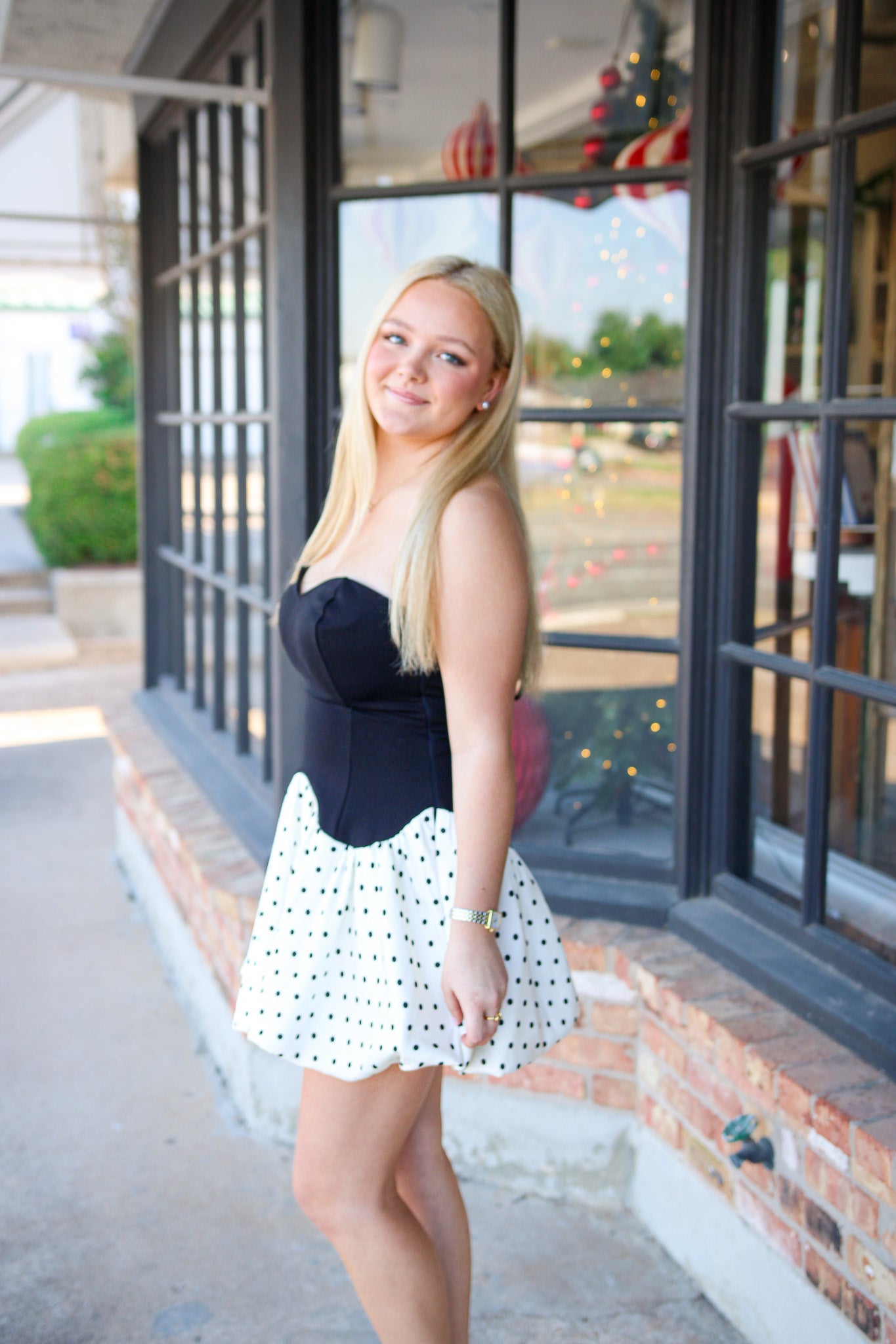 This playful black mini dress features a charming sweetheart neckline and a flirty bubble hem that adds a fun, voluminous touch. Perfect for turning heads at any event, its silhouette blends girlish charm with a modern edge, making it a must-have for your wardrobe. Dress it up or down and enjoy a look that’s as sweet as sugar!