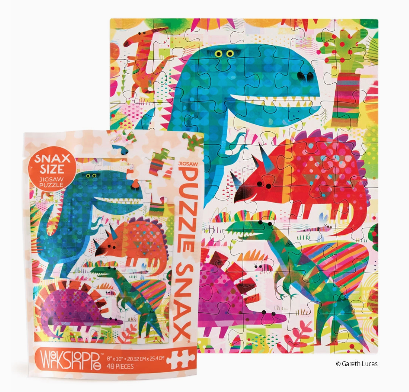 A 48-piece Puzzle Snax of ever-popular, colorful dinosaurs reminding kids of all ages of these prehistoric creatures that used to roam the earth.