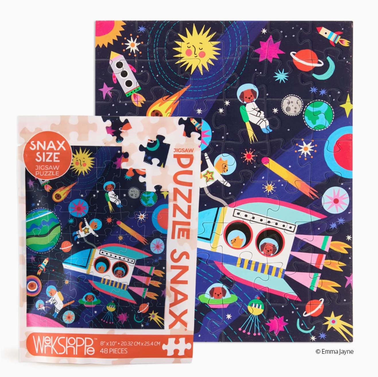 This Puzzle Snax proves that these star-gazing pets know no limits. Blast off with these adorable space cats and dogs. Take a break and pick up some snax, Puzzle Snax. This 48-piece sustainably made jigsaw puzzle is great for puzzlers of all ages. The art is fantastic and sure to bring a smile to all who engage. A resealable pouch is great for storing the pieces, or frame the completed puzzle in any 8" x 10" frame.