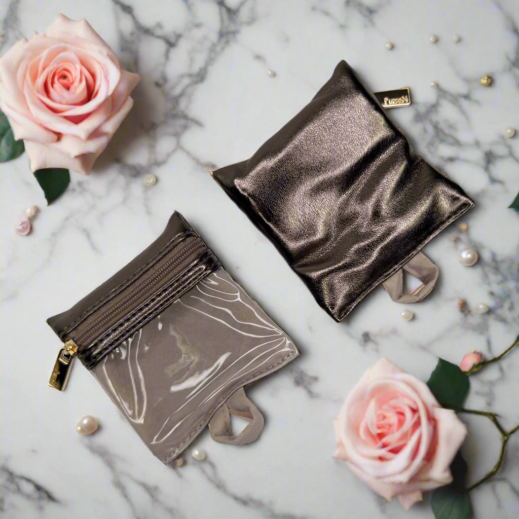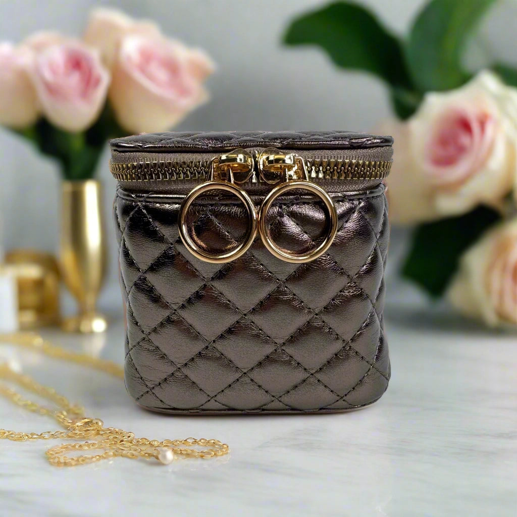 Chic, compact, and cleverly designed, the Train Jewelry Case in metallic Bronze is your go-to for maximum organization in a perfectly portable size. Ideal for small to medium jewelry pieces, it unzips to completely reveal a thoughtfully arranged interior featuring 2 elastic pockets, 3 clear front zippered compartments, and space for everything from studs to statement pieces. With 3 earring stays, 3 necklace holders, and 6 removable clear front pouches included, this soft-sided case brings effortless elegance to your travel routine - and keeps your sparkle sorted and easy to see wherever you go.