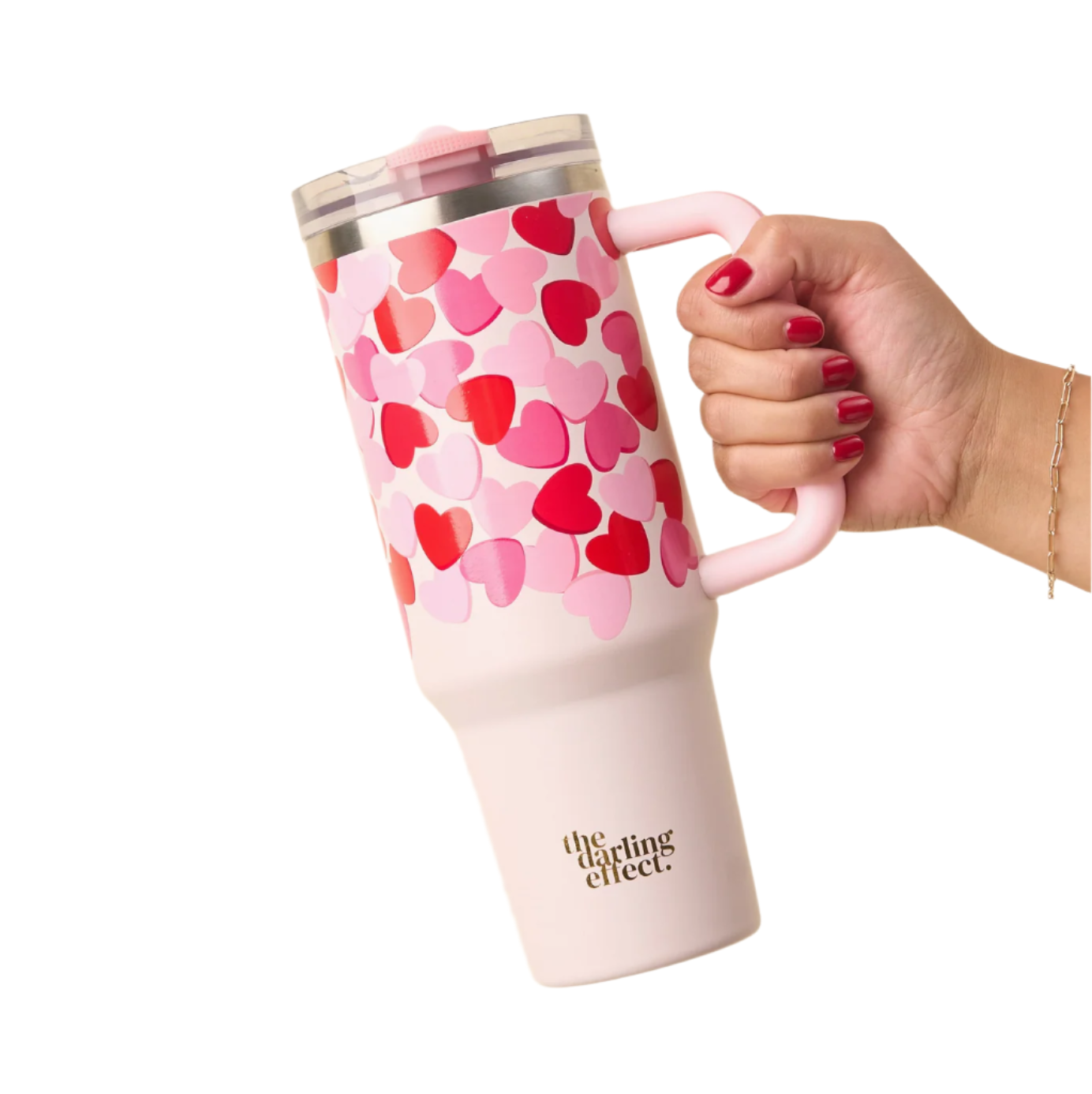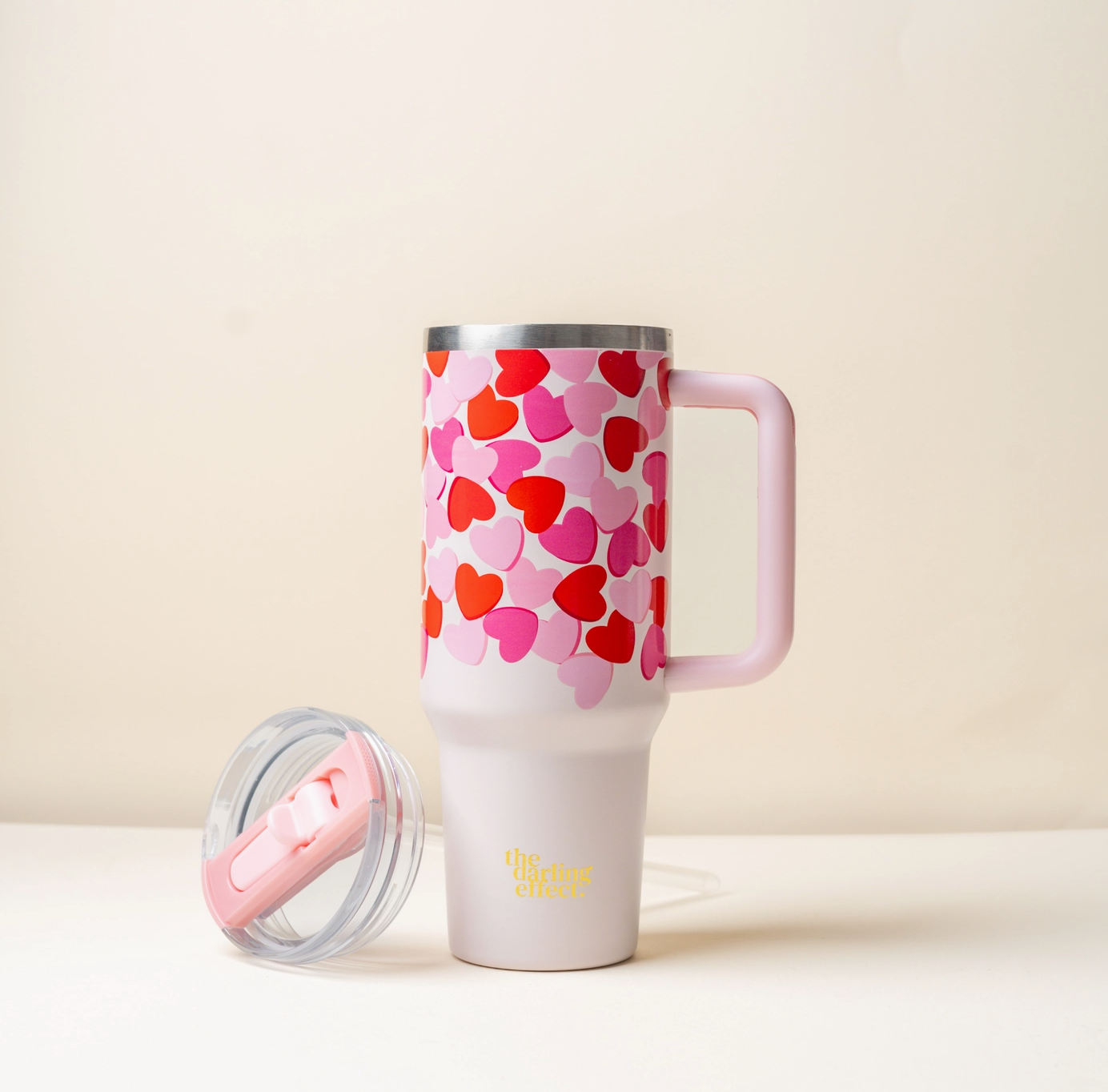 Embrace the spirit of love with our Blushing Hearts tumbler, inspired by the classic charm of conversation hearts! This delightful tumbler features a playful pattern that captures the essence of Valentine’s Day, making it the perfect accessory for sharing your favorite beverages with someone special.