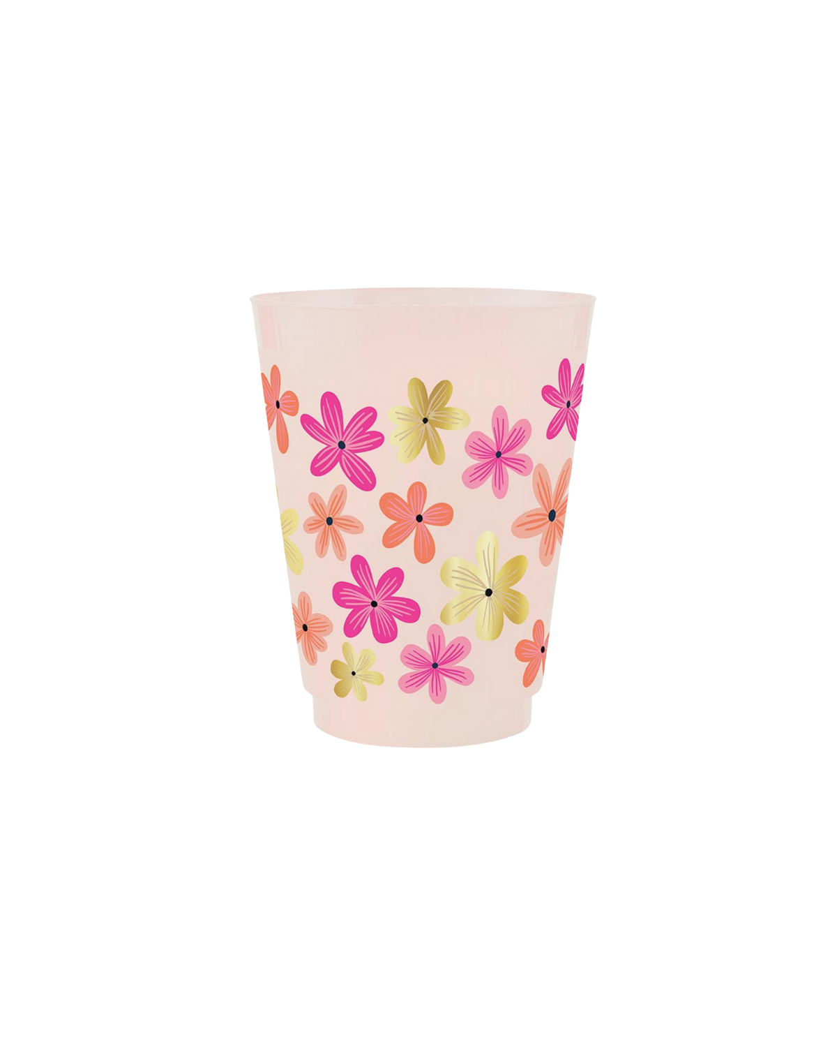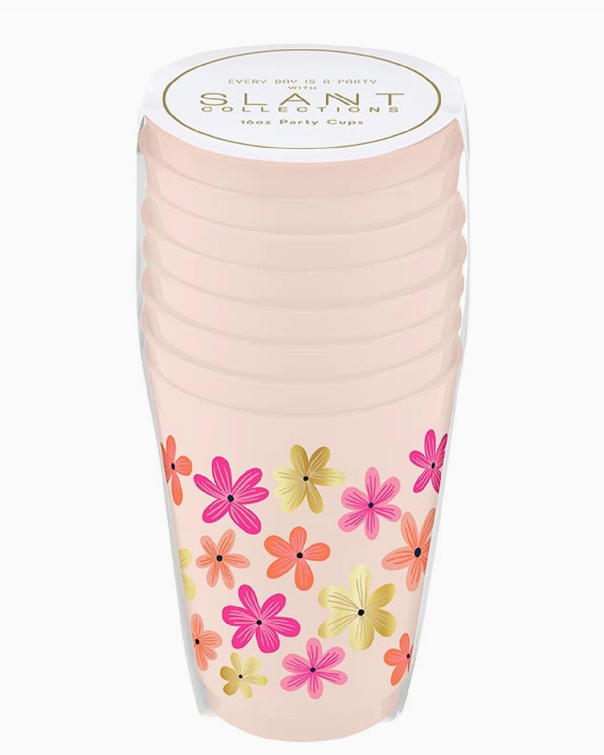 Brighten up your celebrations with our frosted party cups, featuring a vibrant floral print in various colors, beautifully accented with gold foil detailing.