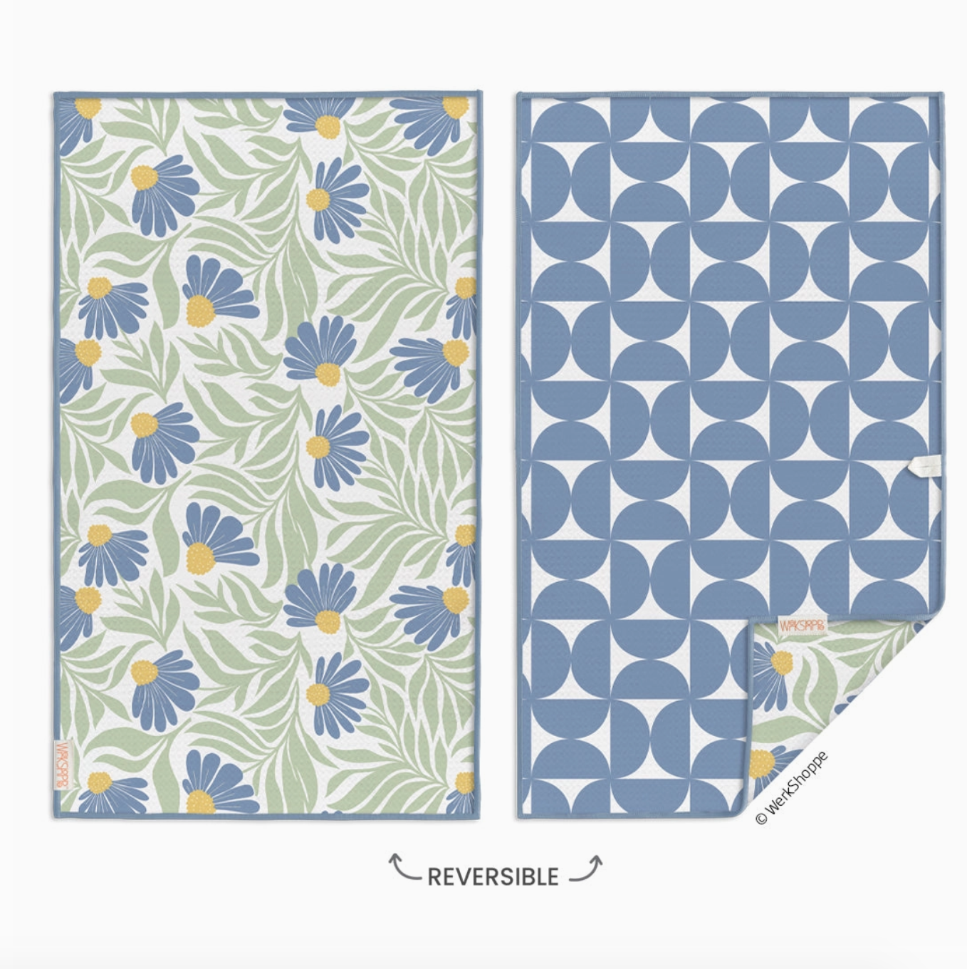 A contemporary design of blue coneflowers with greenery in the style of Matisse reverses to an arched geometric pattern on the other side. A fresh look for this two-sided microfiber hard-working towel. Hands down, these high-performance, eco-friendly microfiber towels are clean-up marvels. An optimized, waffle weave material blend makes these towels ultra-absorbent and quick drying. And that's not the half of it. Each reversible towel has not only one but two gorgeous works of art to brighten your workspace, not to mention your mood.