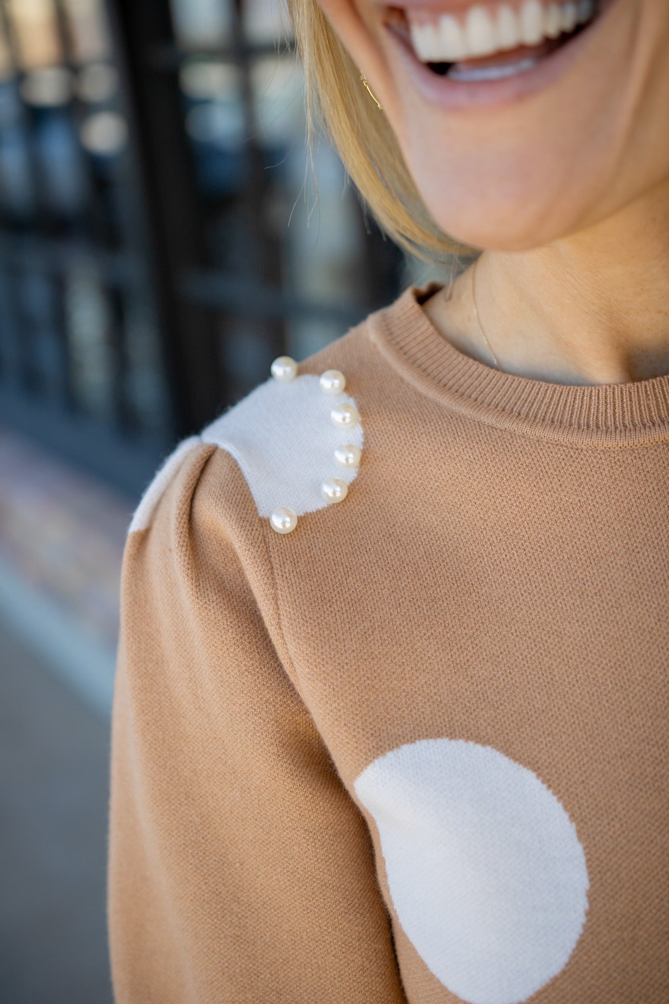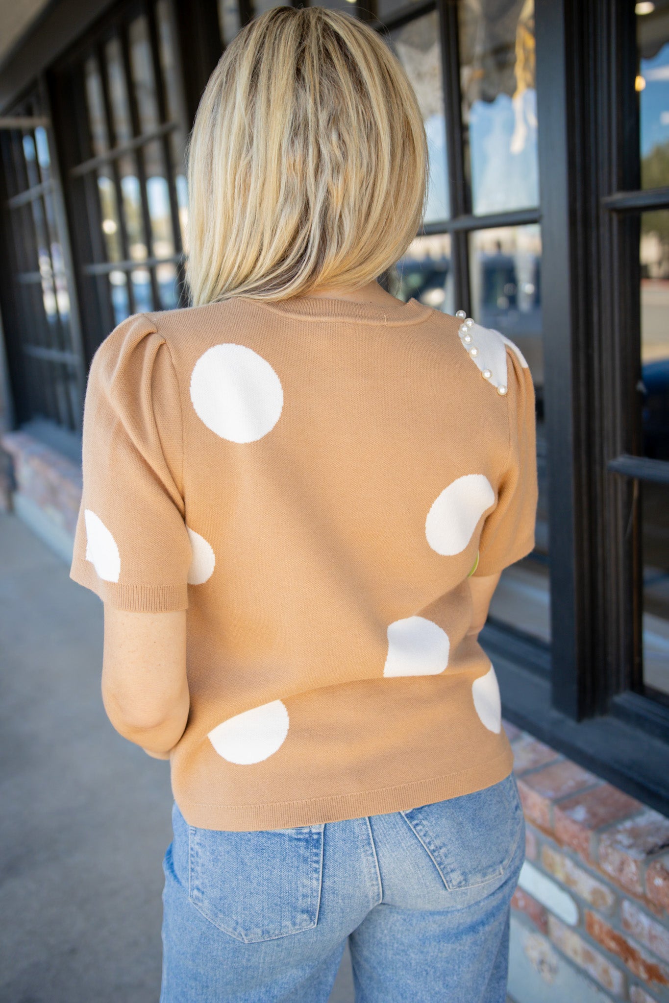Adorable spotted sweater in soft tan and off-white tones, perfect for effortless layering. Short sleeves and delicate pearl accents add just the right amount of charm to this transitional piece. Throw it on with your favorite denim for a look that's both cozy and put-together. The polka dot pattern keeps things fun and fresh, making it an easy go-to for any season.