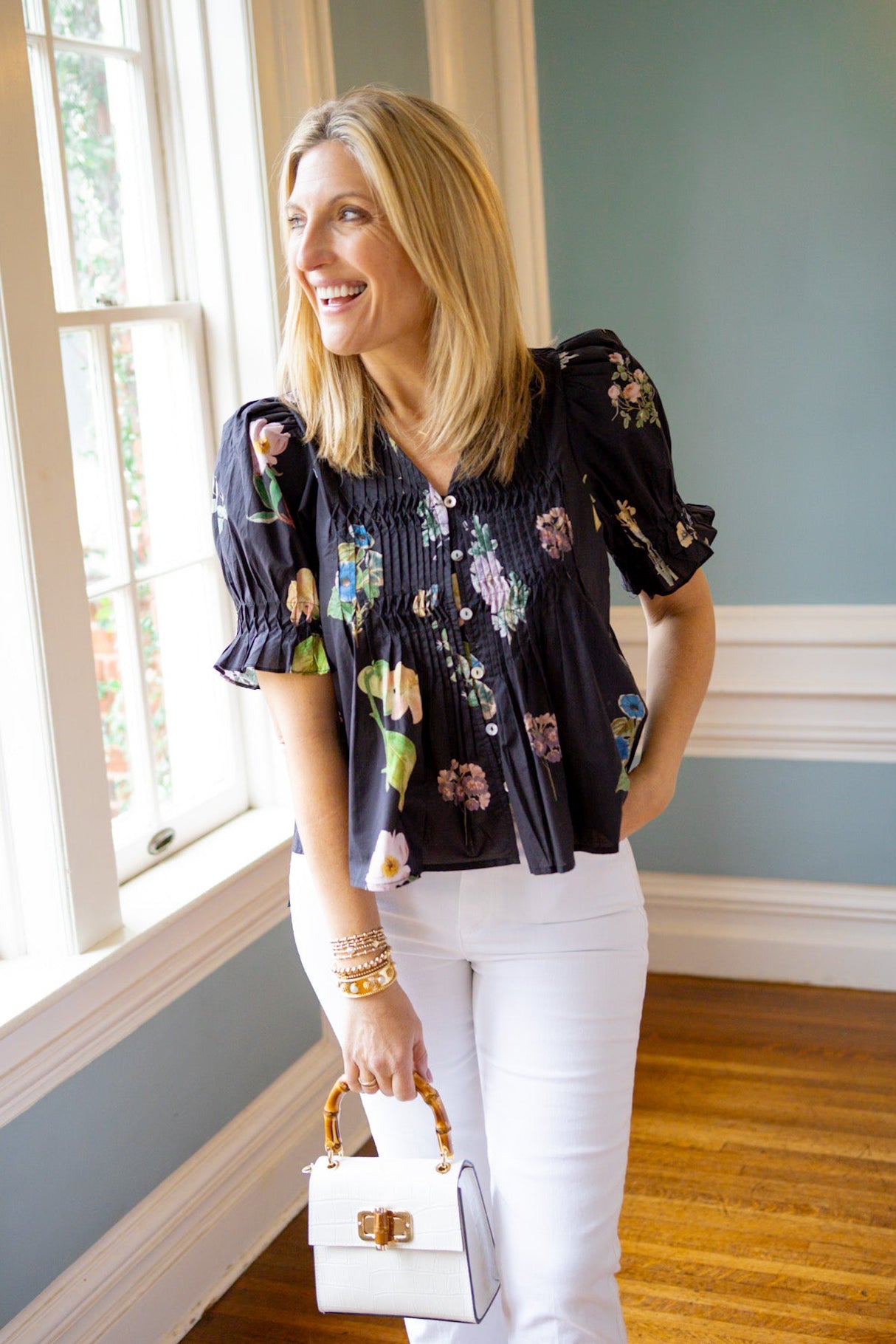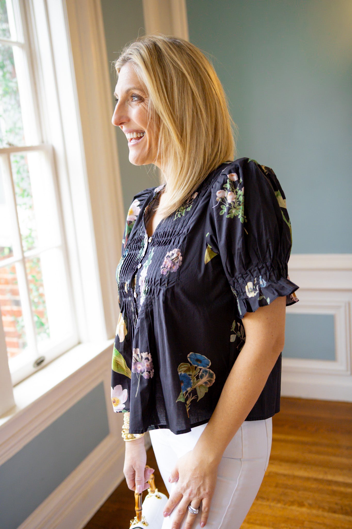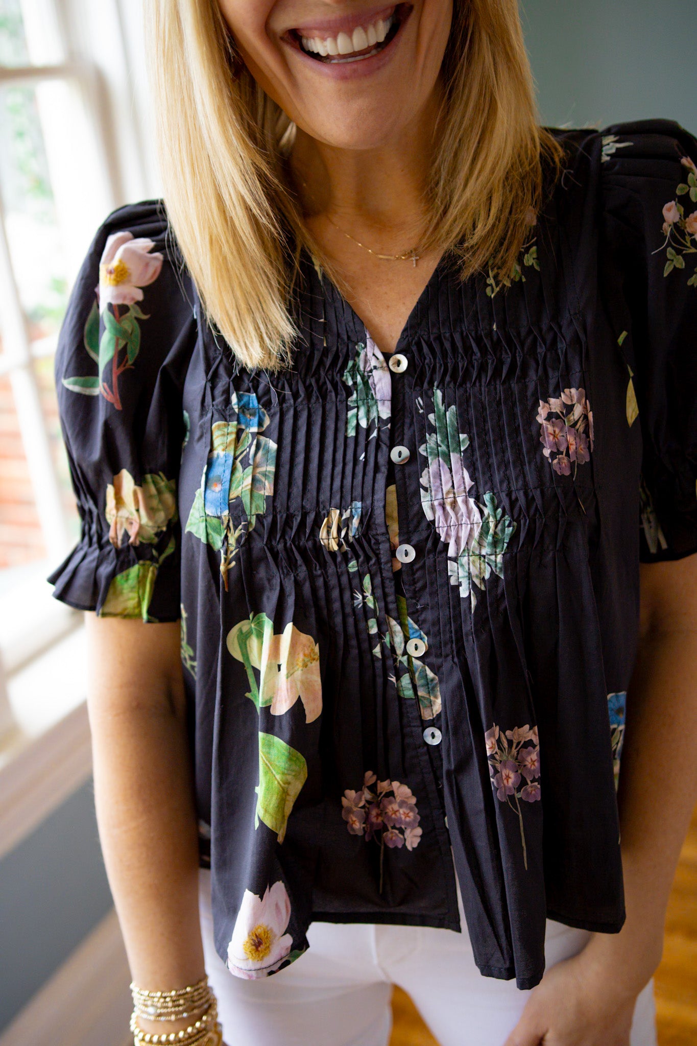 Elevate your everyday style with this charming button-up top featuring a striking pintuck pleated front that adds dimension and visual interest. The playful puff sleeves bring a touch of whimsy, while the V-neckline offers a flattering silhouette. Finished in a rich black base adorned with vibrant floral accents, this piece effortlessly transitions from casual brunch to evening plans. Perfect for those who love a little personality in their wardrobe.