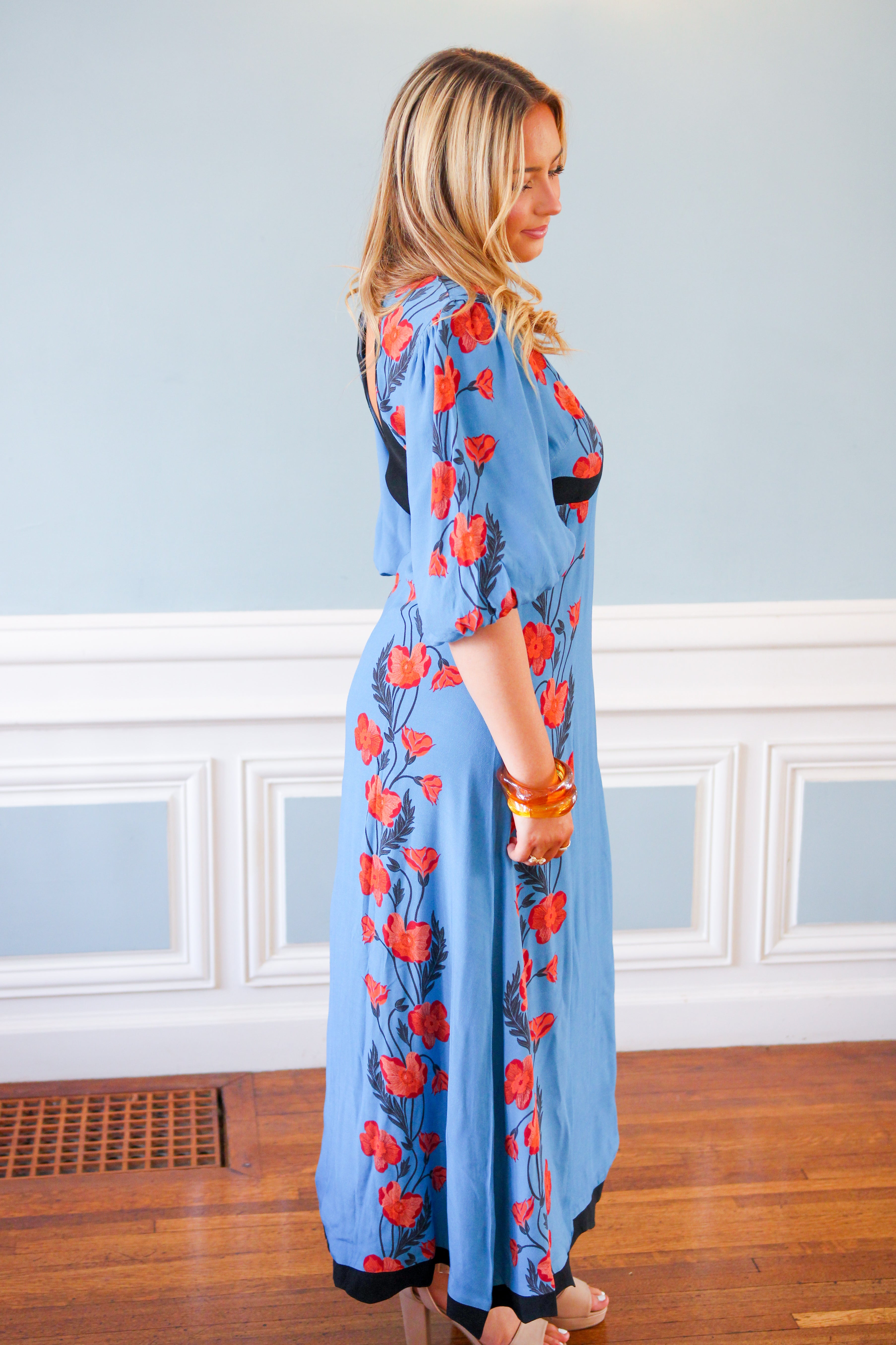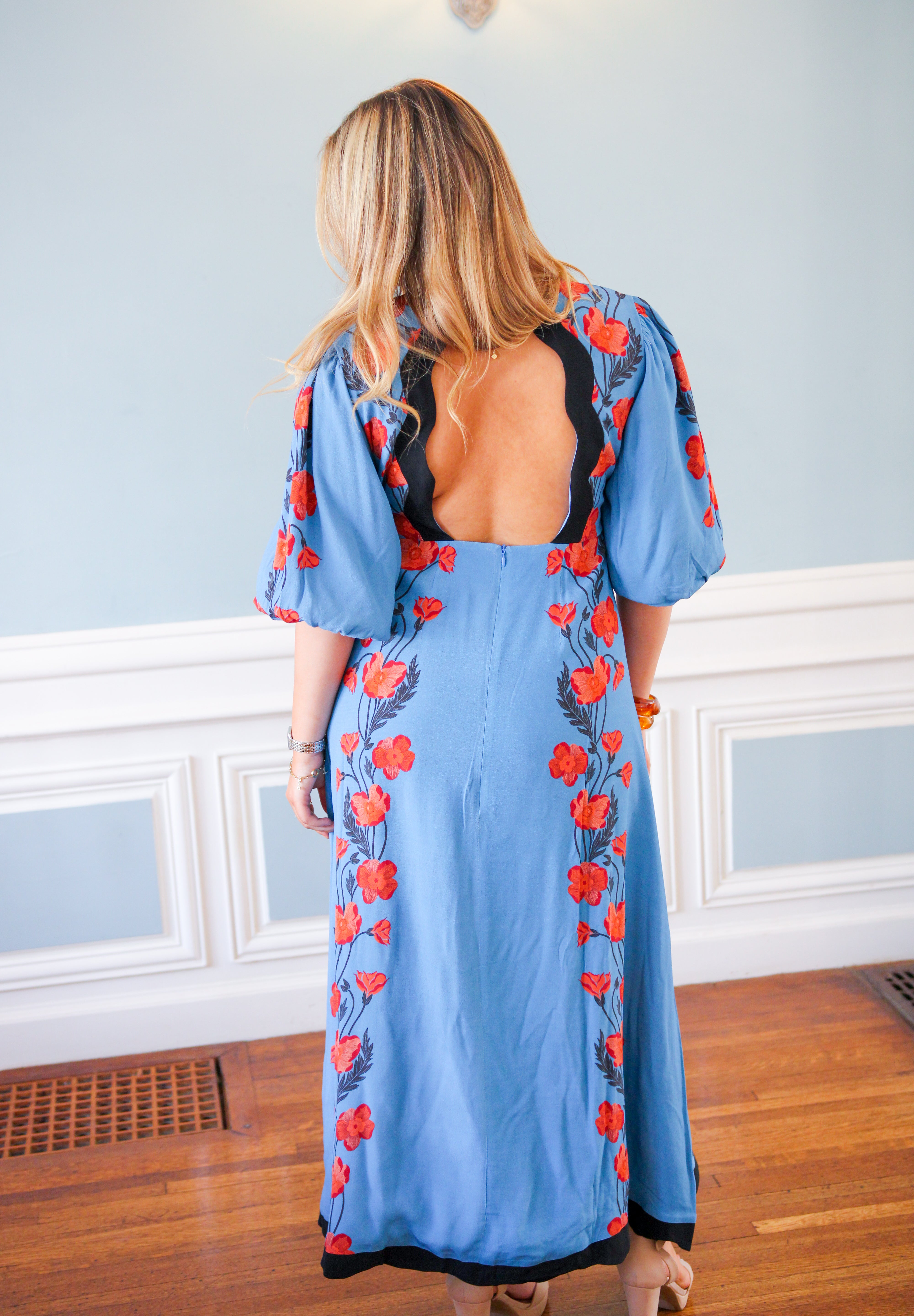 Introducing the Berlin Dress in Blushing Meadow Blume—a show-stopping piece that's equal parts elegant and enchanting. This beauty showcases a serene blue canvas adorned with delicate red florals, punctuated by a striking black wave detail that adds modern flair. The graceful A-line silhouette flows to mid-calf with effortless movement, while the daring backless design—secured with a subtle button at the nape—reveals just enough to turn heads. Perfect for wedding season, fall galas, or any occasion calling for refined sophistication with a playful twist.