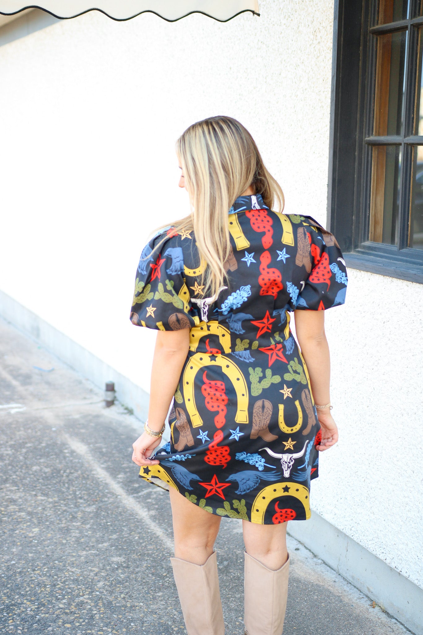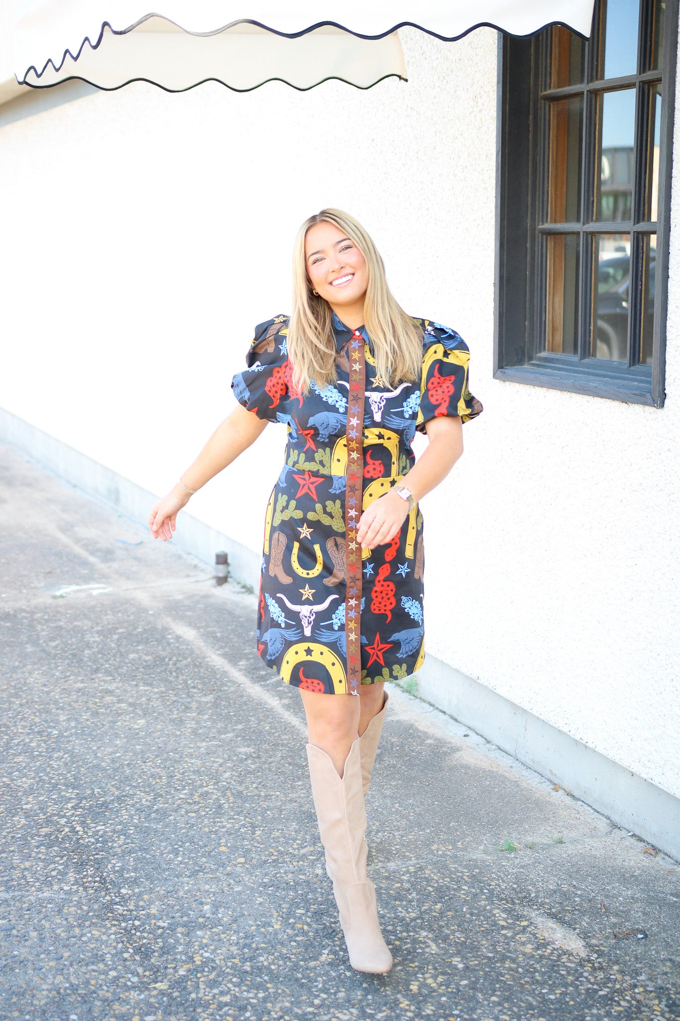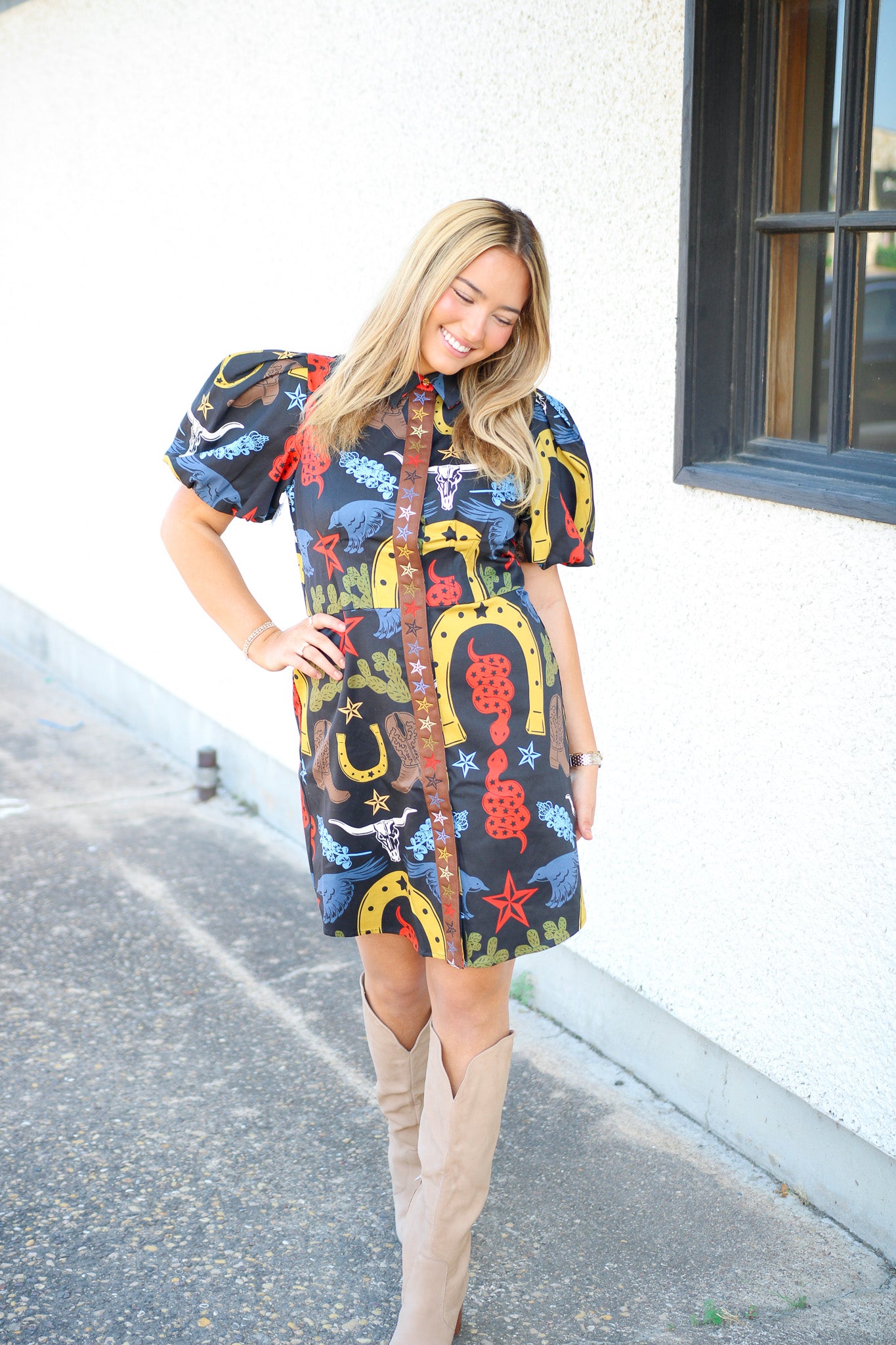 The Britt Dress in Lone Star features a tailored silhouette with a button-front closure, classic fold-over collar, puff sleeves, and a shirttail hem that adds a touch of ease to the structured fit. The Lone Star print is a bold tribute to Texas heritage, showcasing western iconography like horseshoes, longhorns, cowboy boots, and desert florals in striking fall tones. A standout multicolor embroidered trim runs along the front placket, adding rich texture and dimension while concealing the button closure. Finished with thoughtful detailing, this mini is designed to make a statement with playful edge and timeless western character.