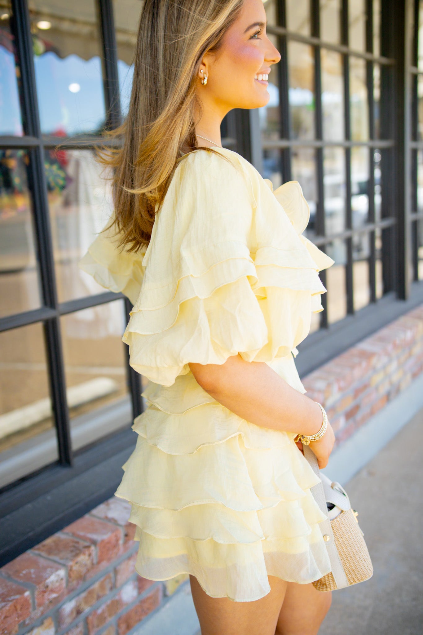 Twirl into spring with the Buttercup Breeze Mini Dress—a charming babydoll style that's equal parts sweet and sophisticated. Layered ruffles create playful movement, while puff sleeves and a square neckline deliver that effortless, flirty vibe. Adjustable straps ensure the perfect fit, and the hidden back zipper keeps things polished. Fully lined for comfort and confidence, this textured woven piece transitions seamlessly from brunch to evening plans.