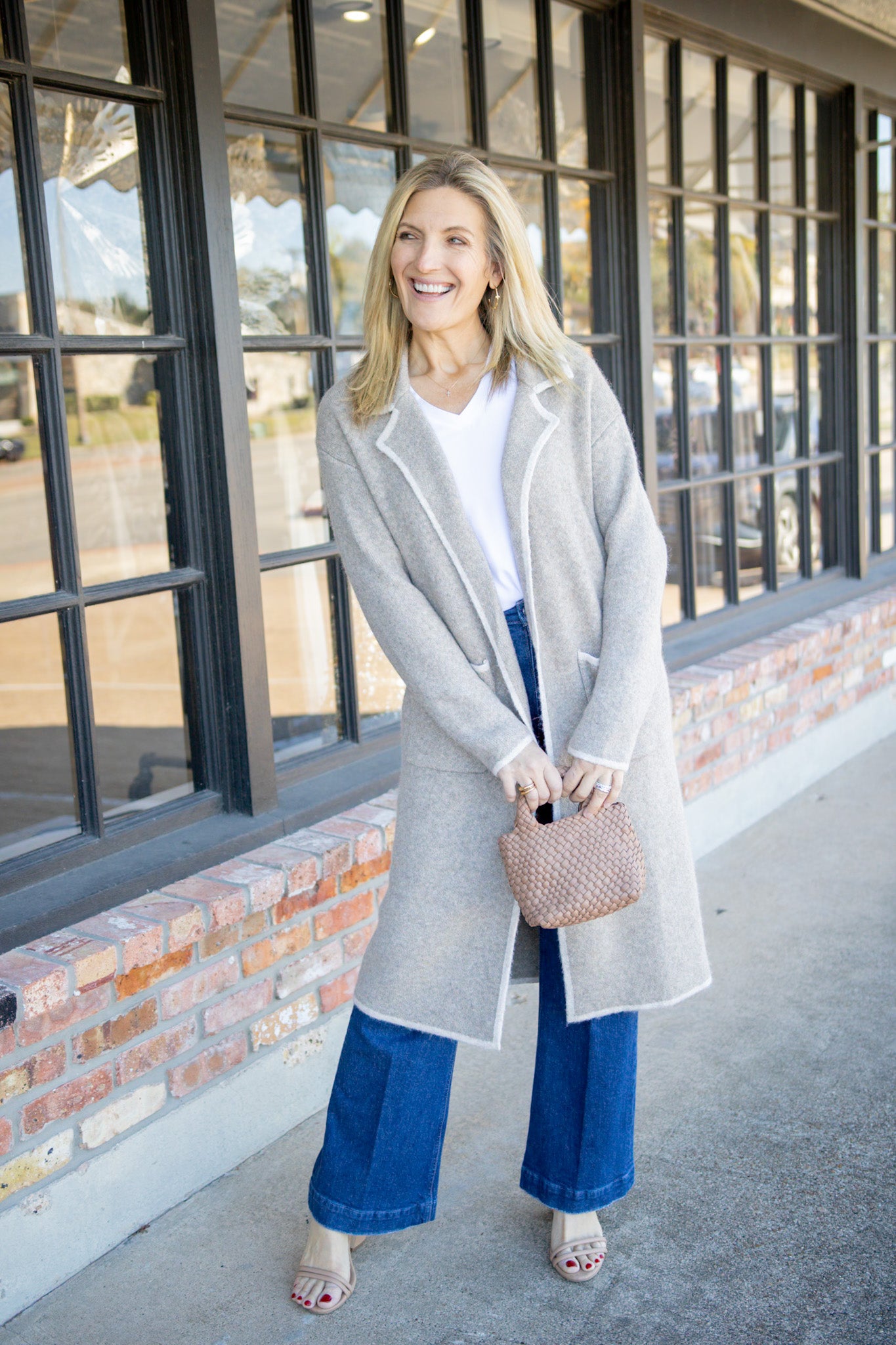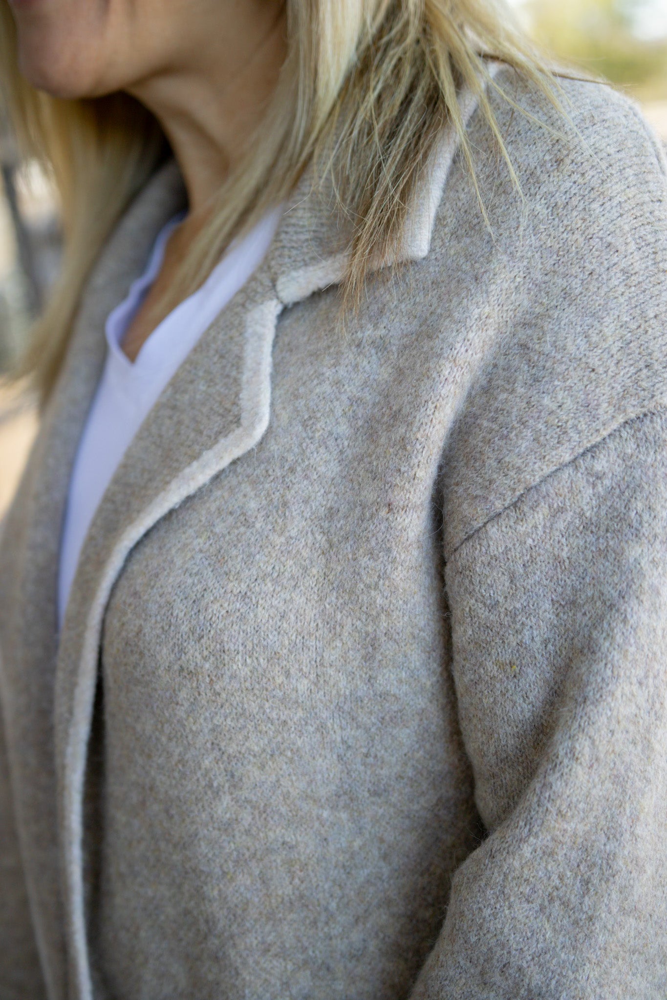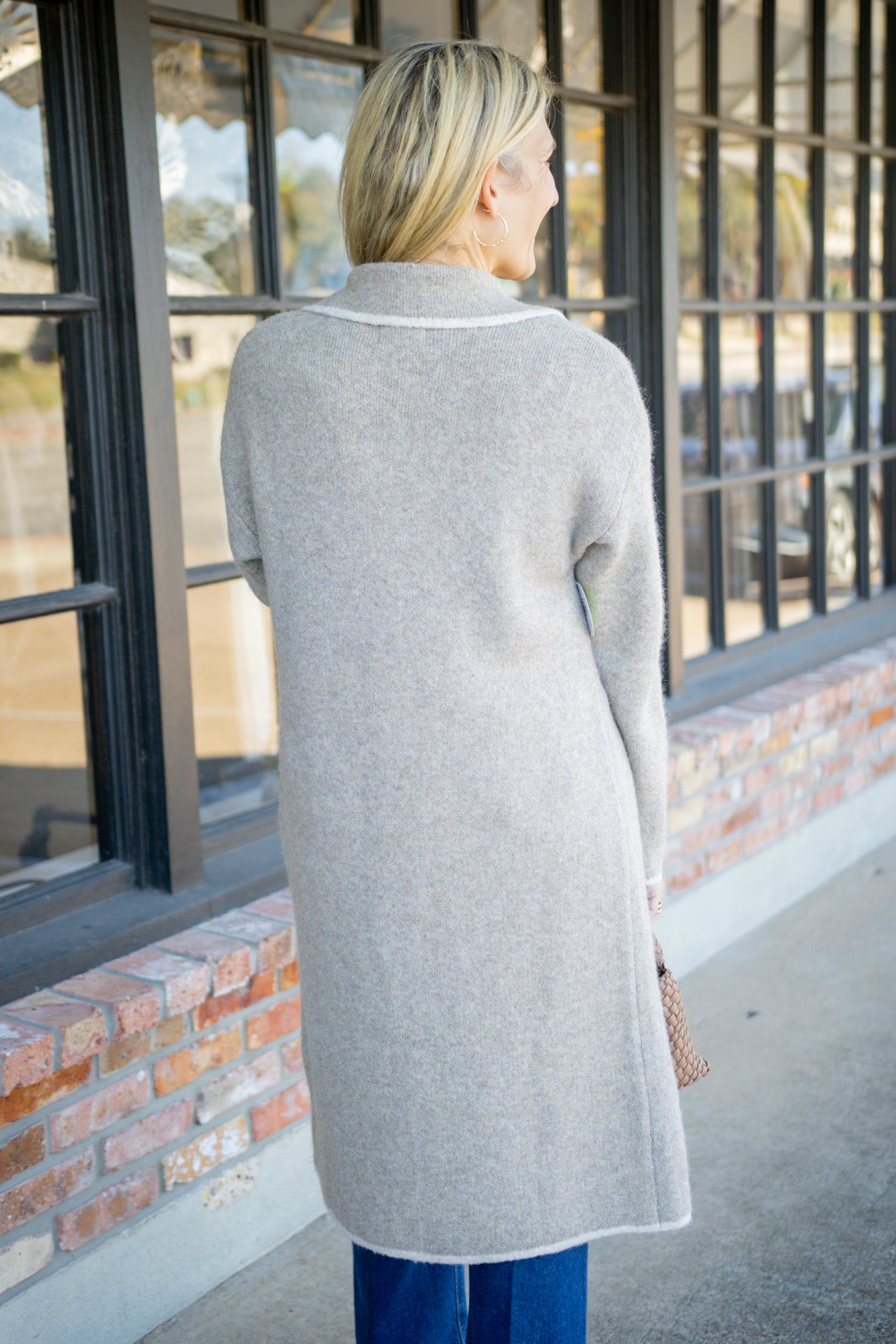 Snuggle up in this irresistibly cozy long-line cardigan that's basically a hug you can wear! Crafted from a luxuriously soft, marled knit in warm oatmeal tones, it's the perfect layering piece for those in-between weather days. The sophisticated shawl collar and open front are finished with crisp cream trim for a polished touch, while two generous front pockets keep your hands toasty or your essentials close. Whether you're throwing it over a tee, pairing it with denim, or wearing it as a lightweight jacket, this effortlessly chic piece delivers comfort without compromising on style.