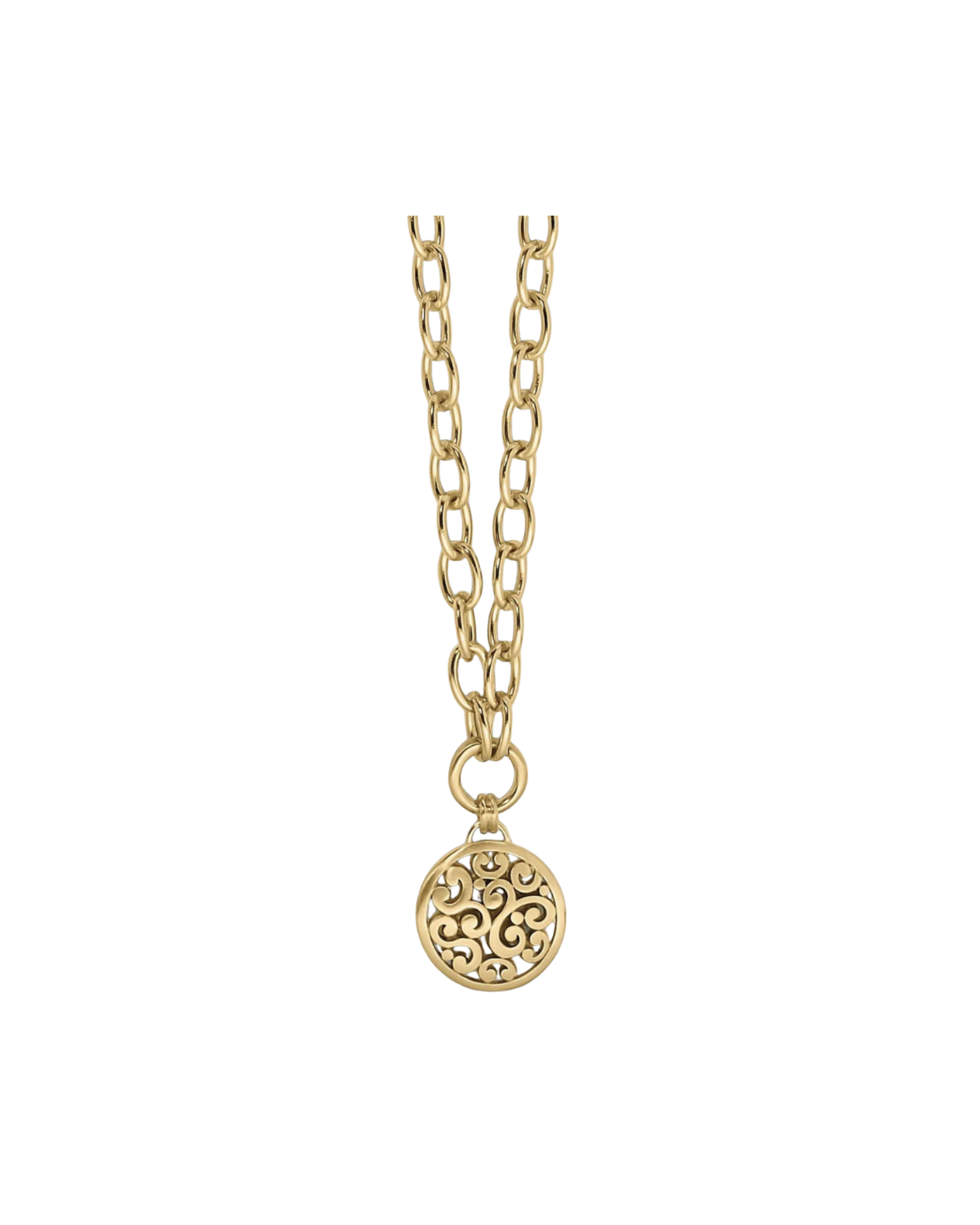 This circular pendant necklace with mesmerizing swirls and scrolls has the look of handmade silver artistry from Taxco, Mexico.