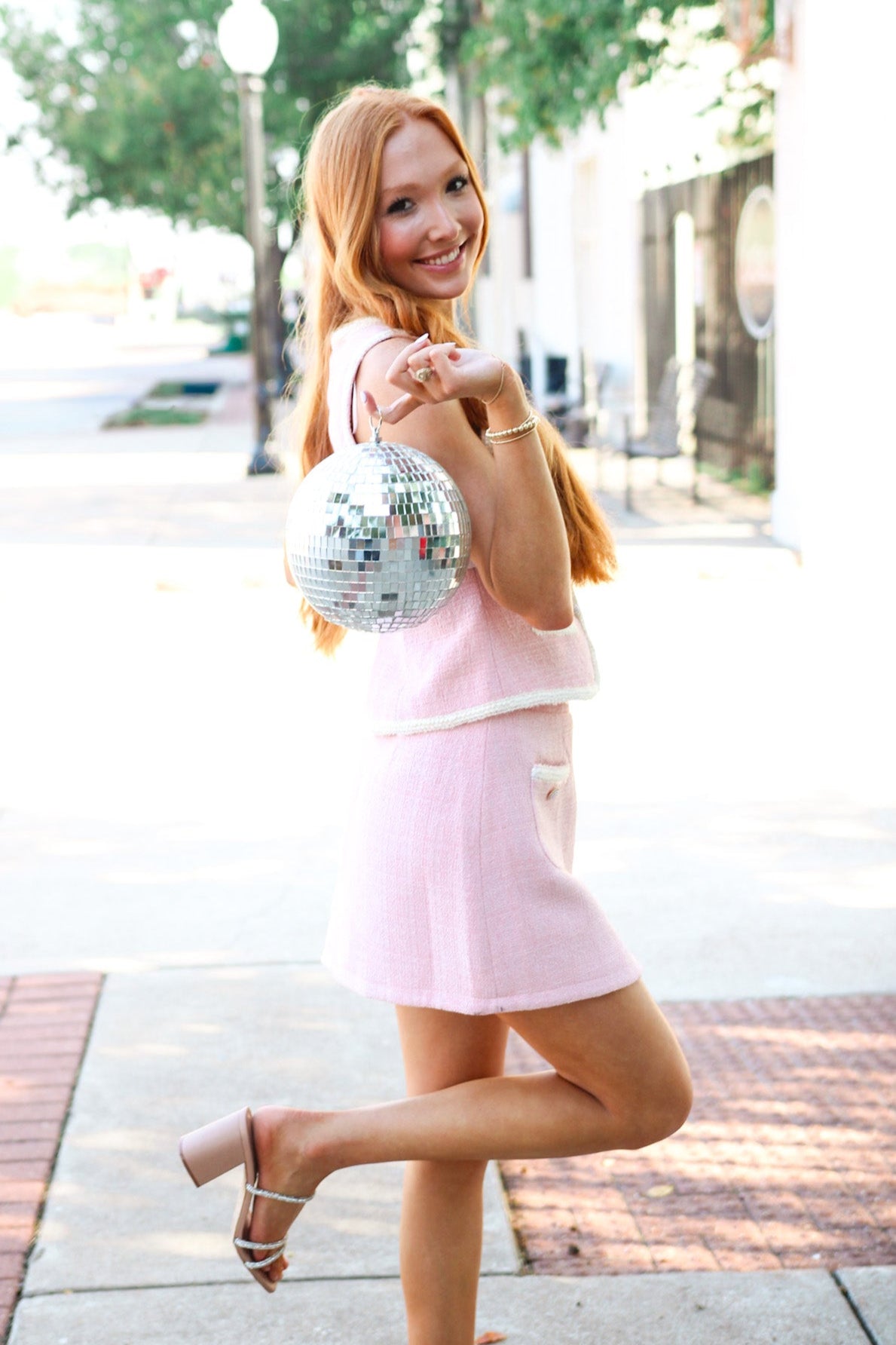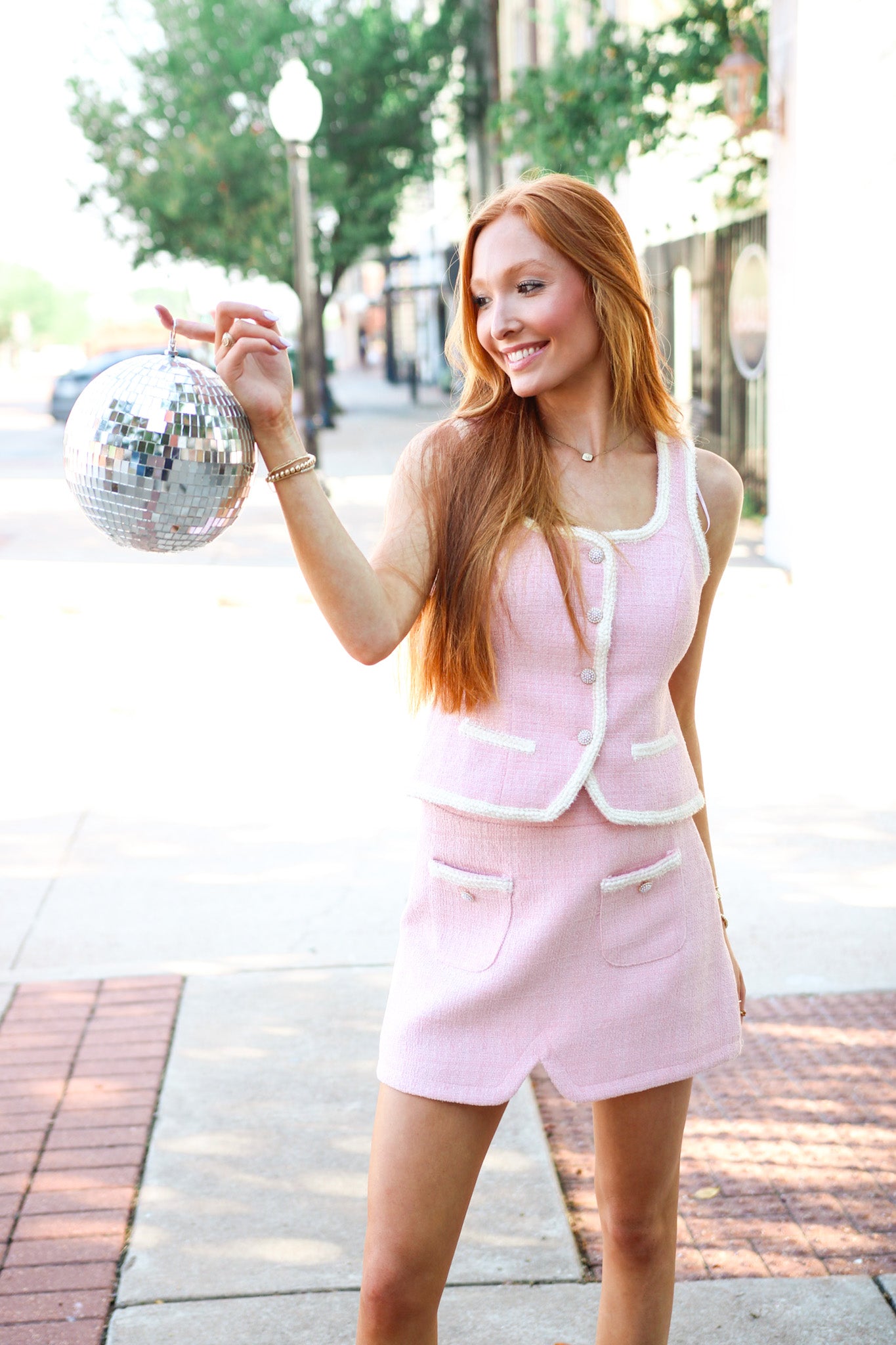 Step out in style with the Crown Jewel Set in Light Pink! This playful two-piece features a sleeveless tweed top adorned with sparkling rhinestone buttons and chic contrast boucle trim. The matching mini skirt, complete with a flirty front notch slit and invisible back zipper, adds a fun twist to a classic look. Fully lined for comfort, this set is perfect for turning heads wherever you go.