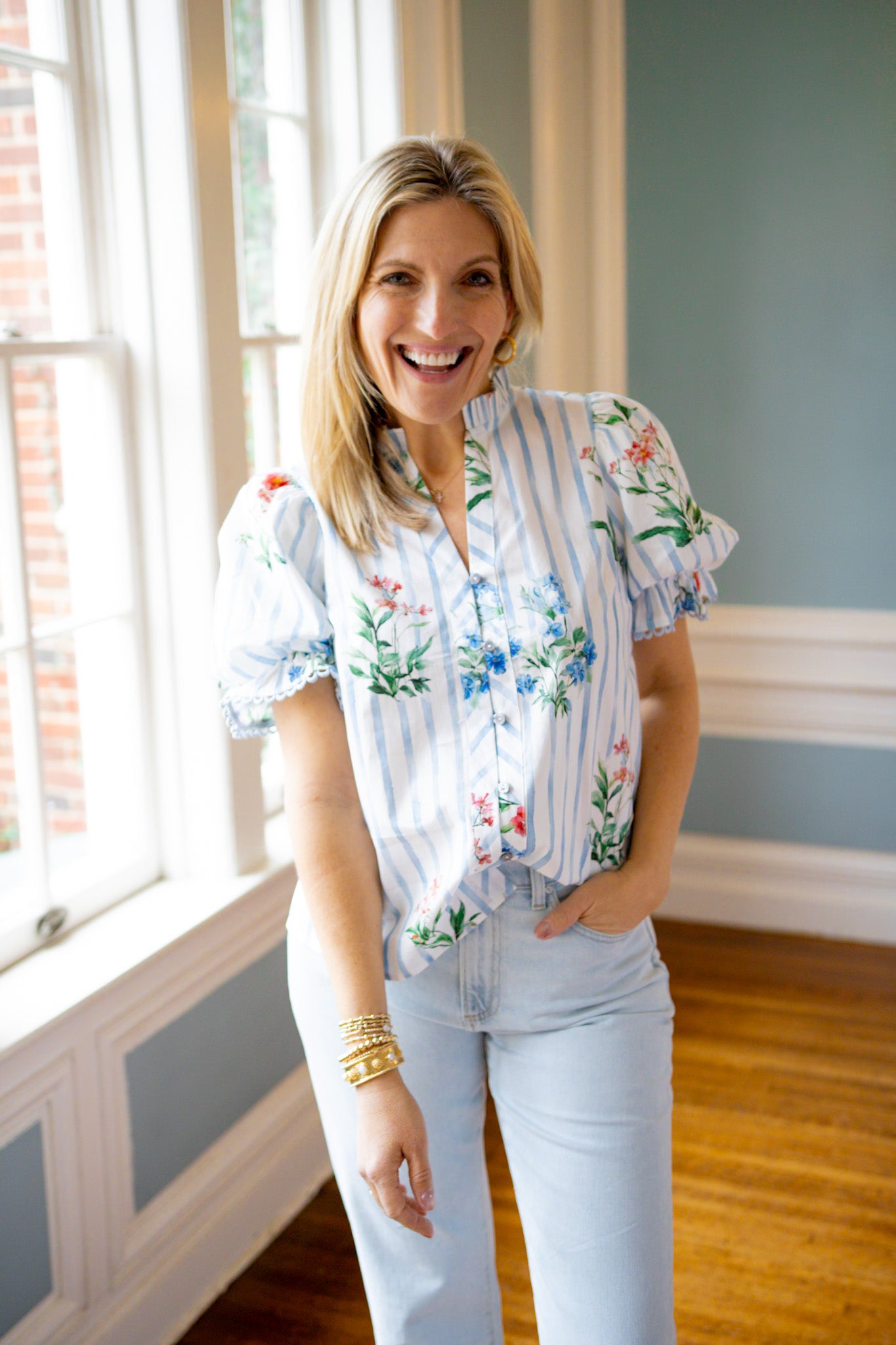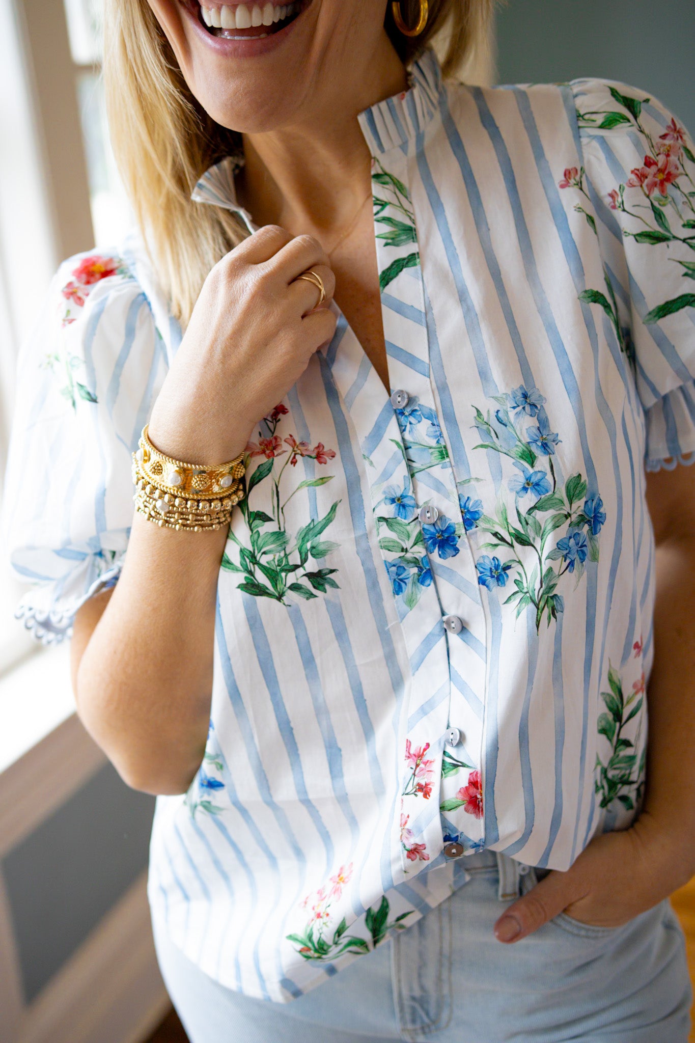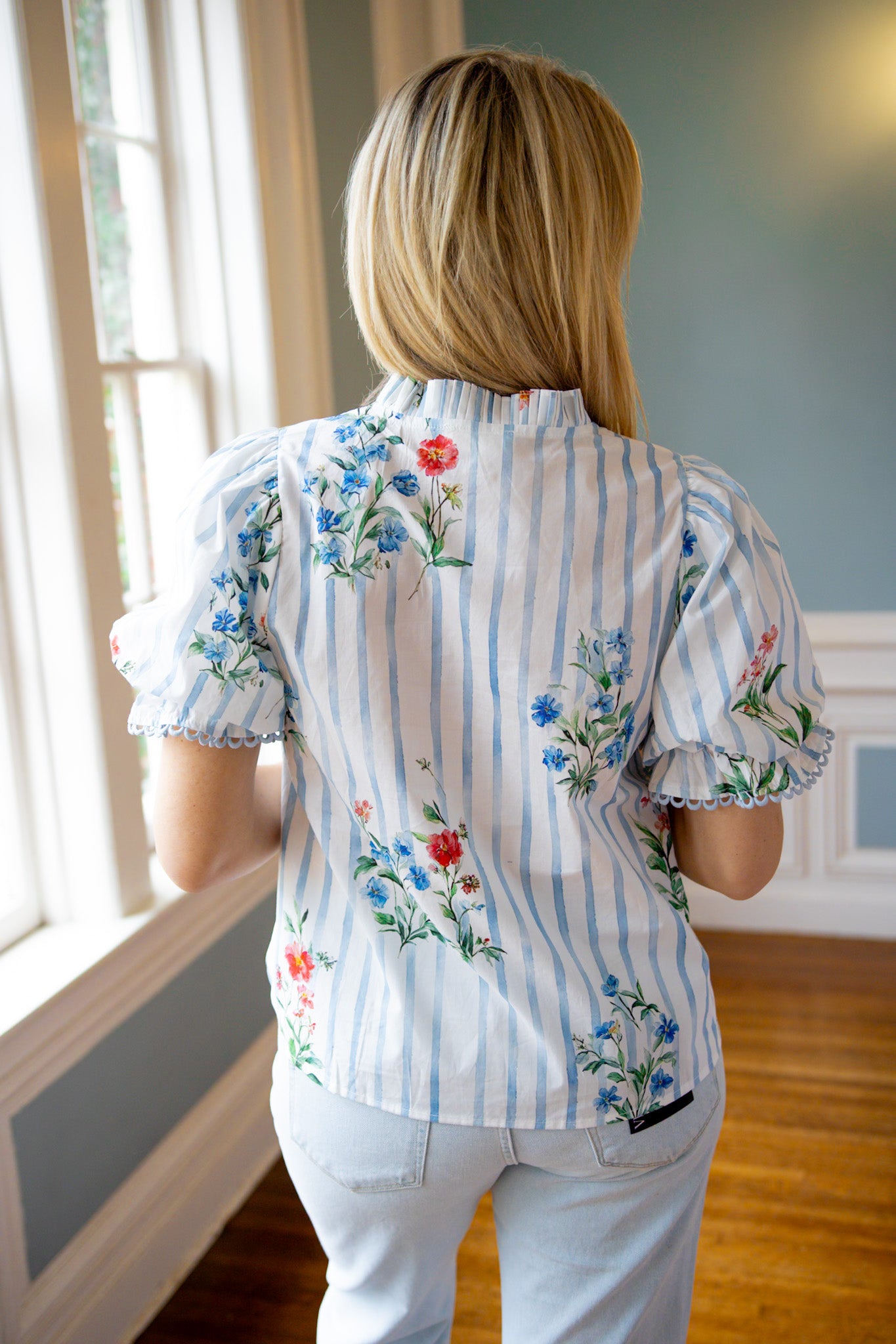Brighten your wardrobe with this cheerful Great Days Ahead Top in light blue. Featuring a charming mix of floral and stripe prints, this V-neck style pairs perfectly with your favorite bottoms. The puffed short sleeves are finished with delicate scallop trim for an extra touch of whimsy, while the front button closure makes getting dressed effortless. Crafted from lightweight woven fabric that's non-sheer and unlined, it's your go-to piece for casual days that call for a little extra joy.