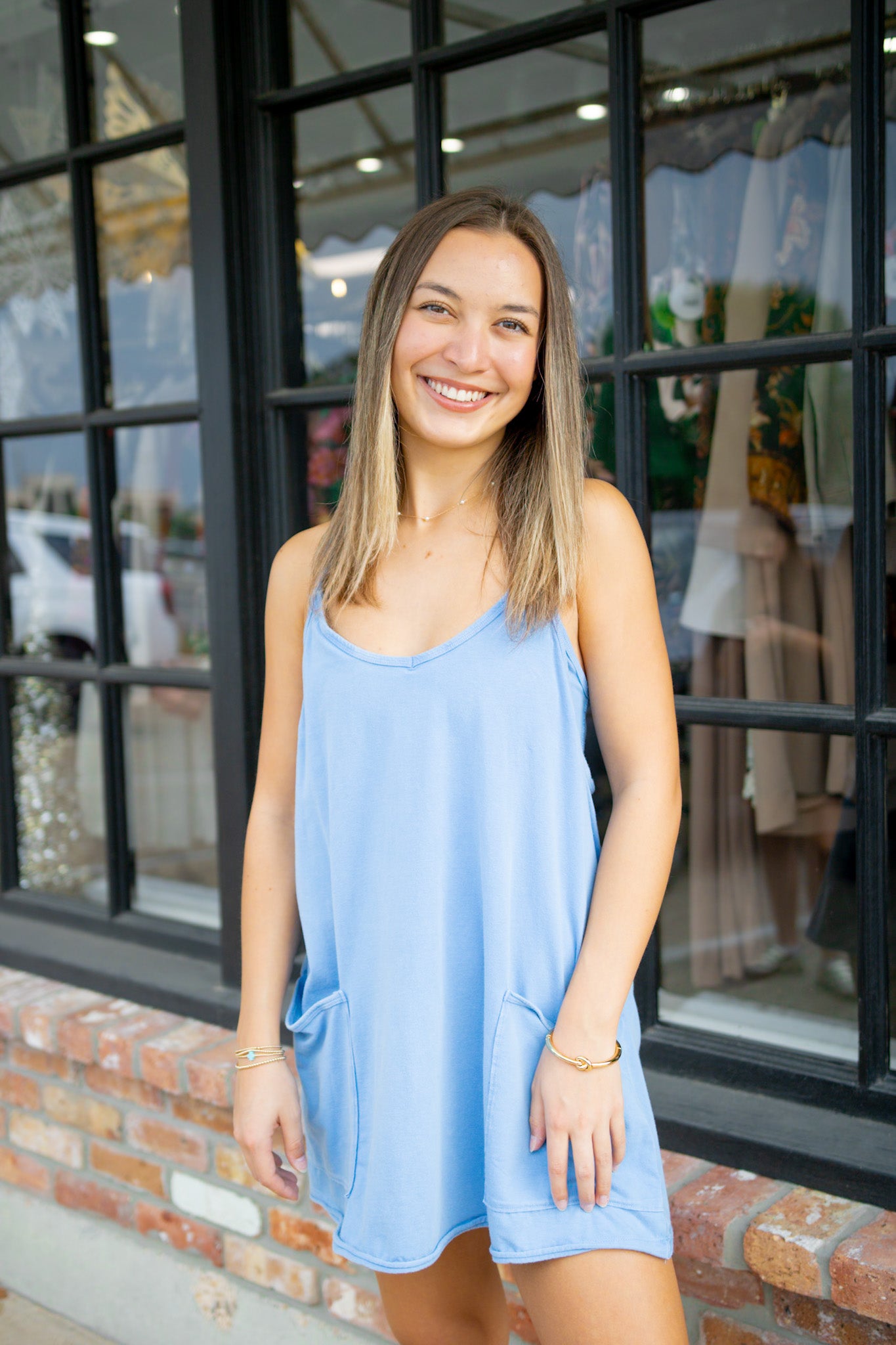 Features: Soft fabrication, lightweight design, scoop-neckline, thin shoulder straps, racerback detail with zippered pocket, oversized patch pockets at front, lined interior with shorts piecing at bottom