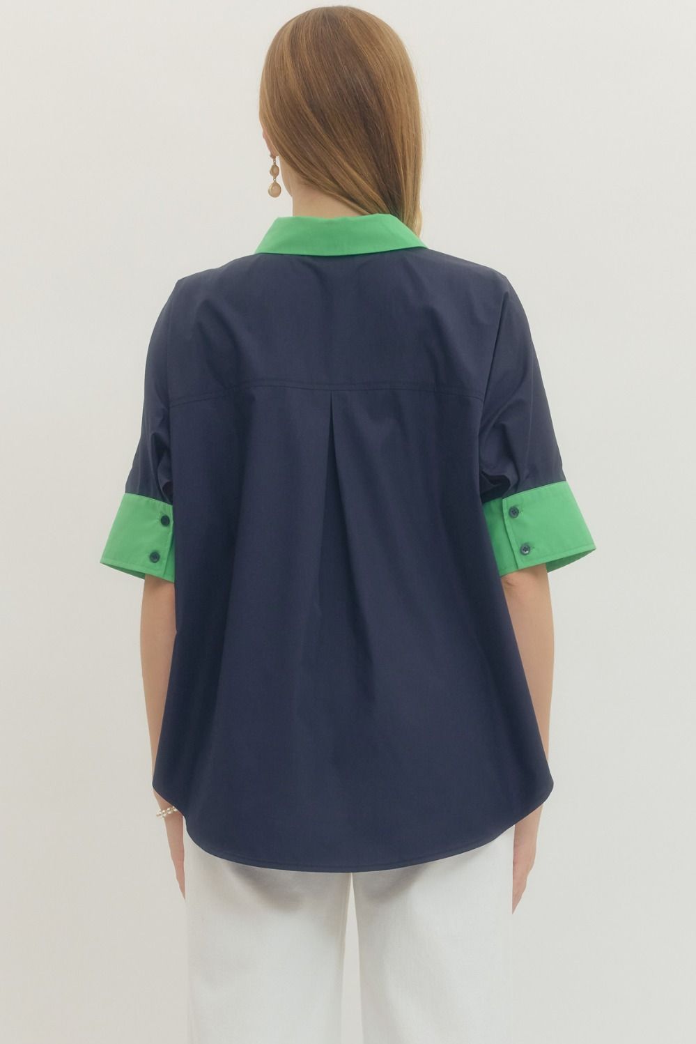 Meet your new go-to top—a navy and green button-down that's ready for anything. The pointed collar with contrast trim gives it character, while lightweight woven fabric keeps you comfortable all day long. Front button closure and buttoned cuffs mean easy dressing, and the unlined, non-sheer construction is perfectly polished on its own. Simple, stylish, and just the right amount of fun.