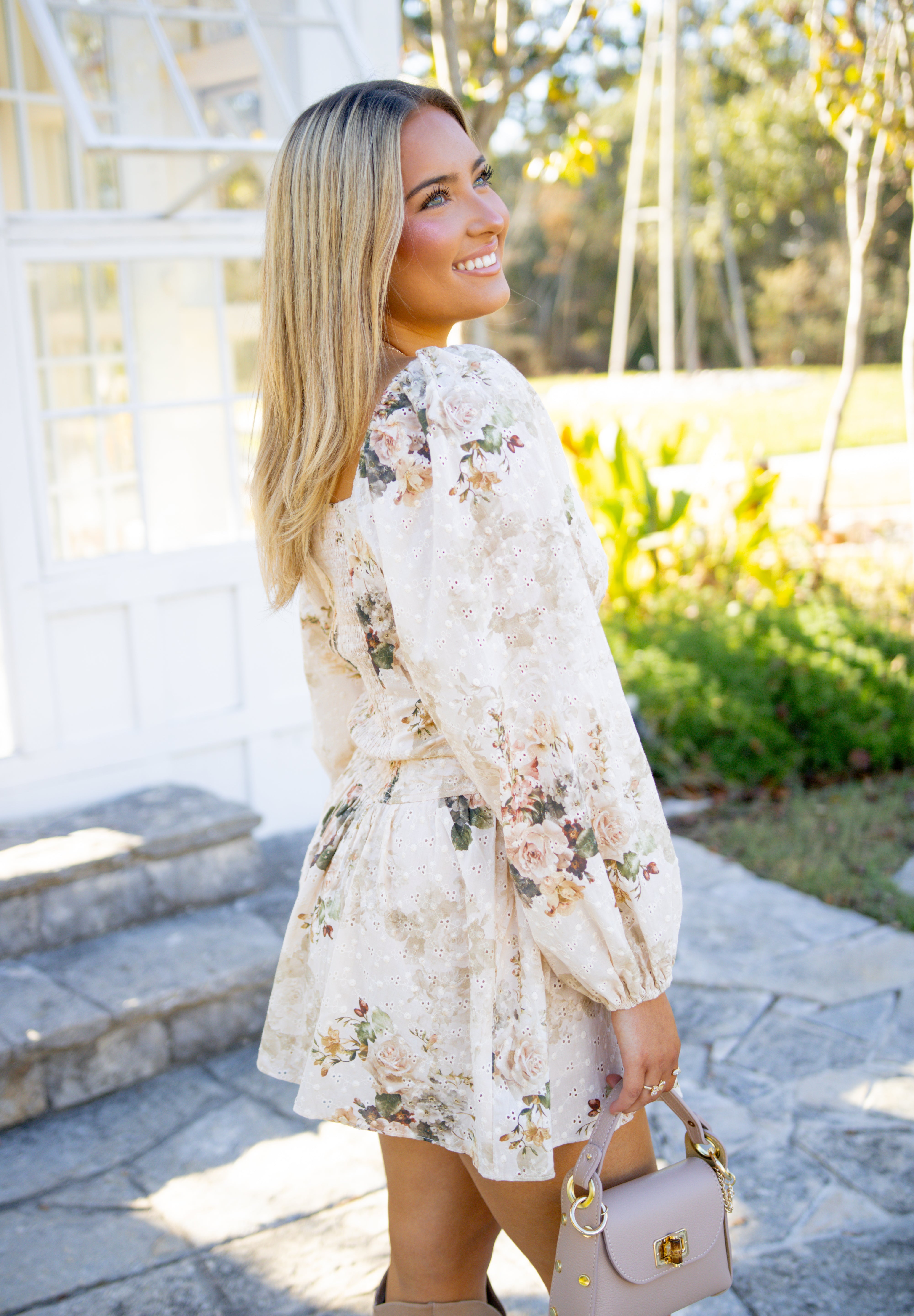 Introducing the Storia mini dress—your new go-to for effortless, romantic vibes. This charming piece features a dreamy vintage-inspired floral print on natural beige woven cotton that's as soft as it is breathable. The square neckline and fitted bodice flow into a gently flared skirt, while delicate puff sleeves add that perfect touch of feminine flair. Subtle eyelet detailing throughout gives the fabric beautiful texture and depth. Made from 100% cotton, it's lightweight enough to wear year-round and comfortable enough to live in. Pure romance, zero fuss.