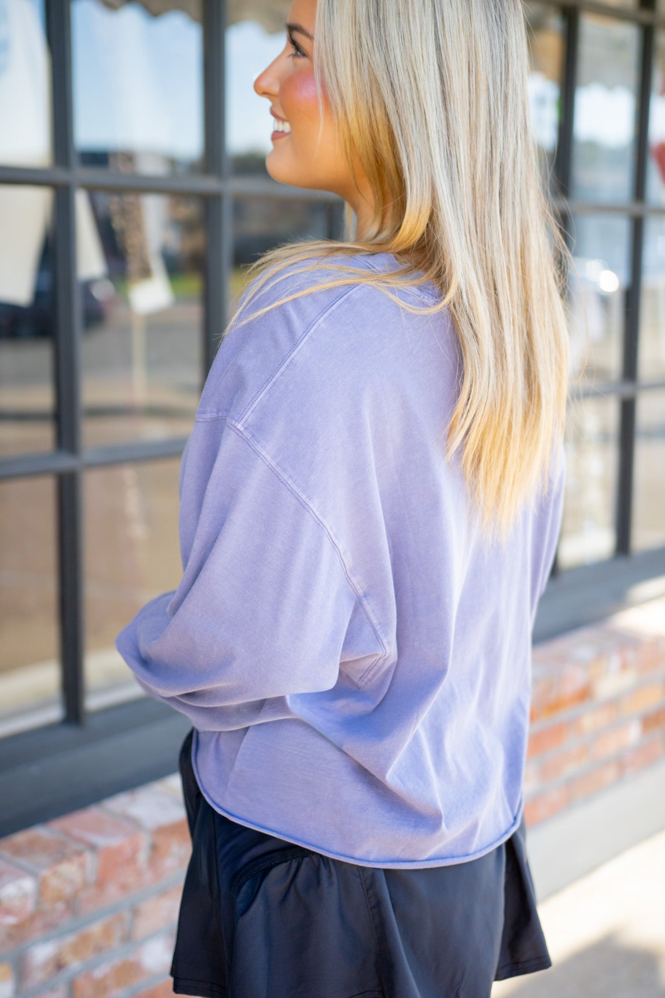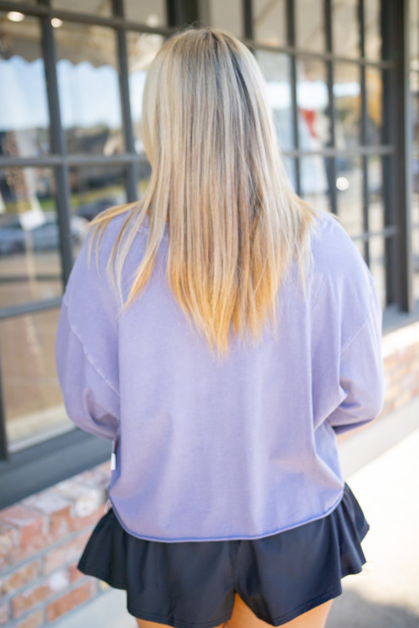 Warm up or cool down in this essential long-sleeve, featured in a boxy silhouette and slightly cropped fit with a classic crew neckline and raw-edge trim.