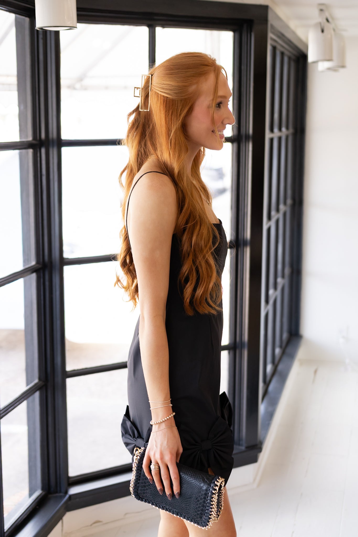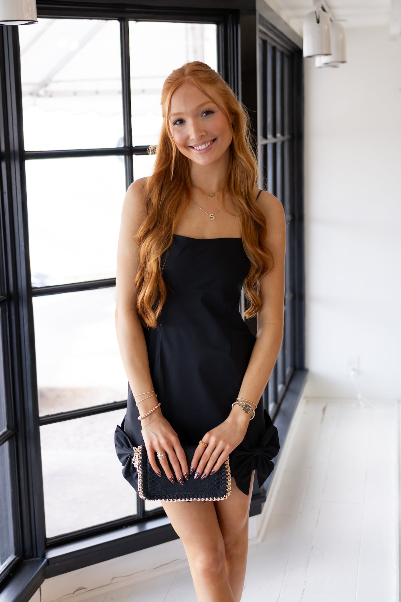 The Kennedi Dress captures the spirit of the season in glossy taffeta, blending sleek sophistication with playful romance. This bodycon silhouette is shaped by princess seams that sculpt and flatter, while dainty spaghetti straps and a soft empire waist lend a touch of ’60s-inspired mod charm. Along the hem, delicate bows add a feminine flourish, bringing movement and whimsy to its structured shape. Finished with a side zip and invisible back zipper, the Kennedi is equal parts elegance and flirtation—a modern holiday classic made for festive nights out.