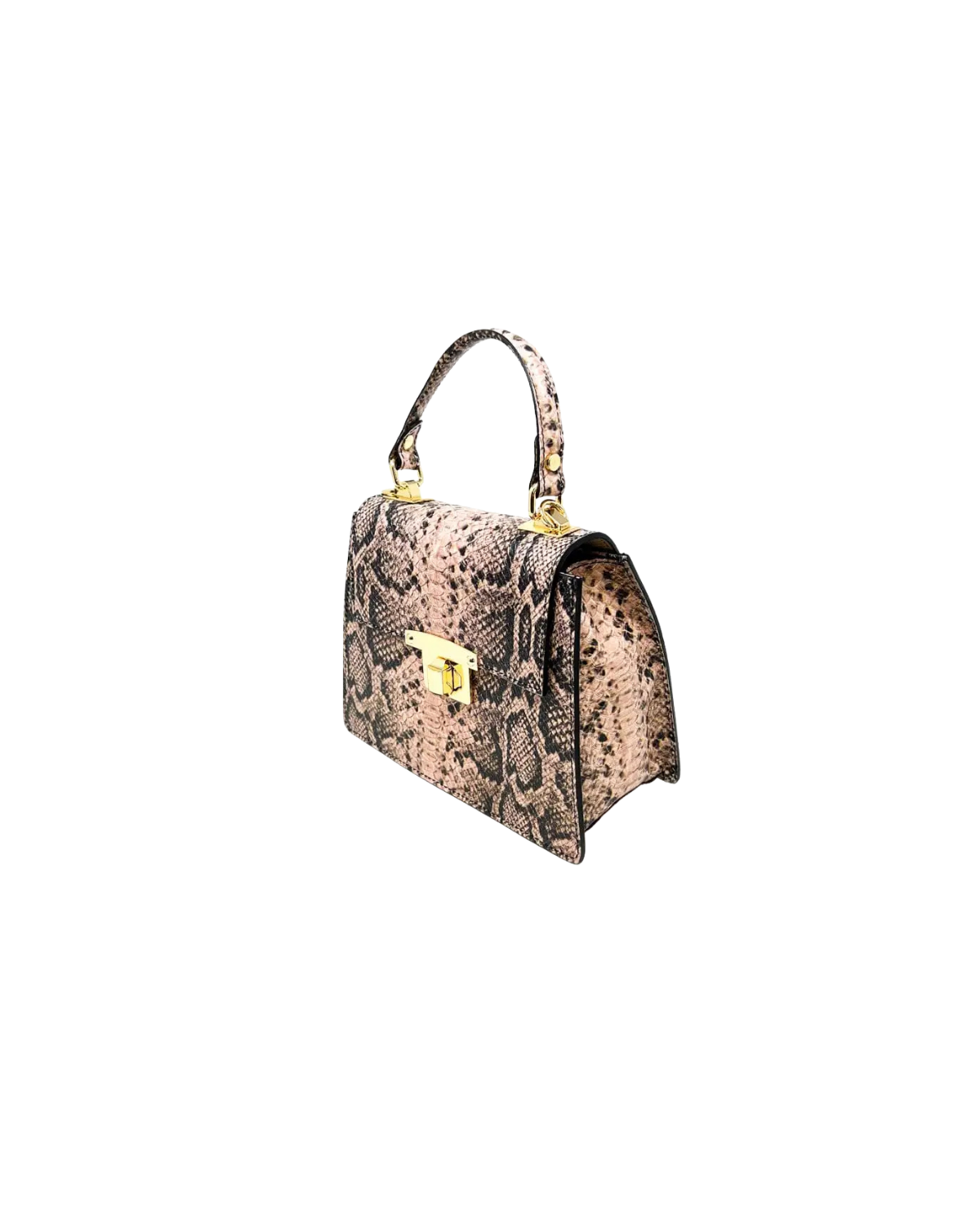 This elegant leather bag is crafted from Italian leather that features a croc-embossed design. It features a detachable chain strap for versatile wear, along with a zipper and flap adorned with a decorative twist and turn lock. Finished with golden accessories. Measurements: 7"* 9" * 4"