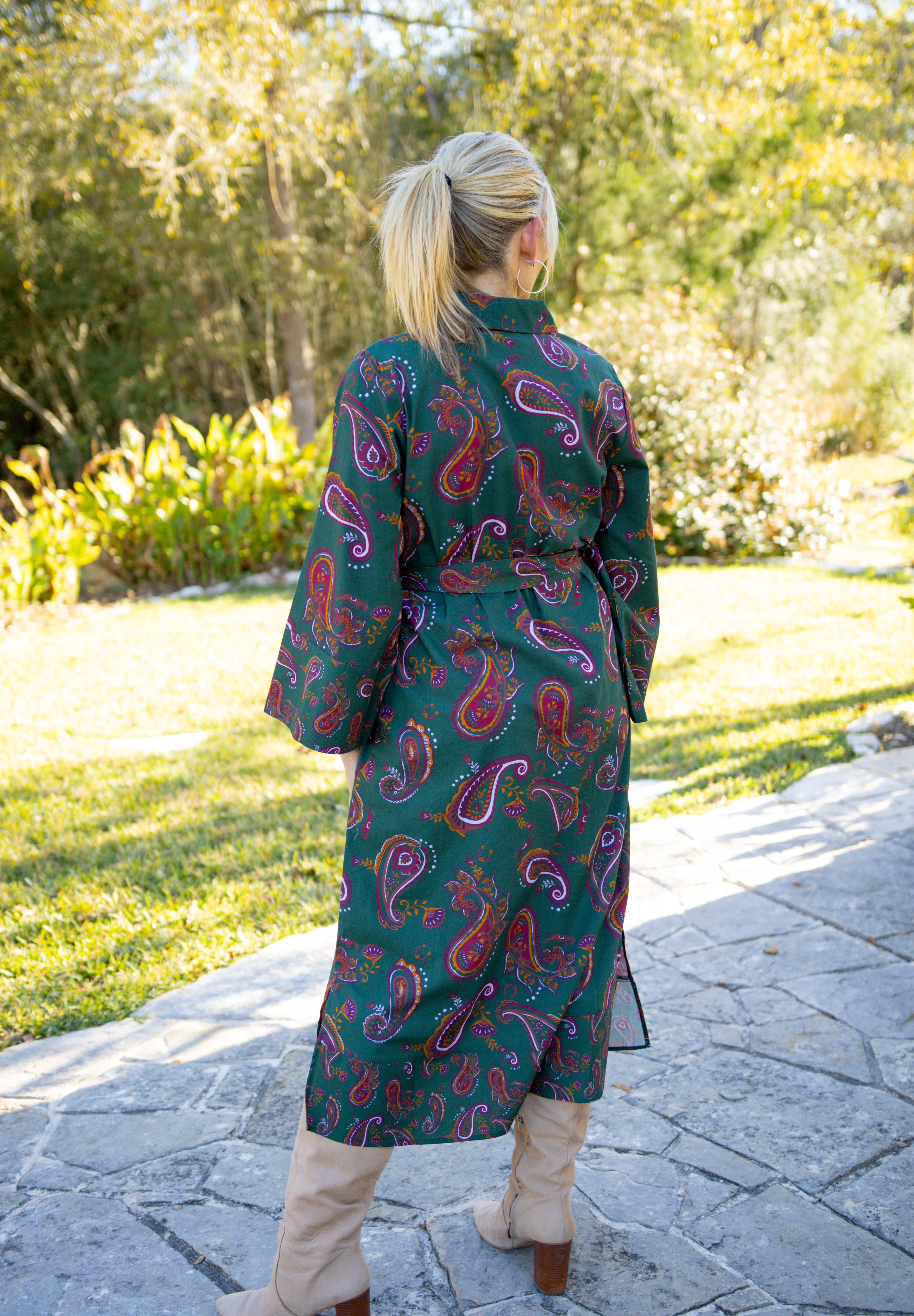 The Lee Dress is a stylish, midi-length wrap dress featuring a rich forest green base with an intricate paisley print in deep red-brown and rust tones. It has a flattering V-neckline, a self-tie belt to cinch the waist, and flowy long sleeves, making it a perfect bohemian yet refined piece for the cooler seasons.