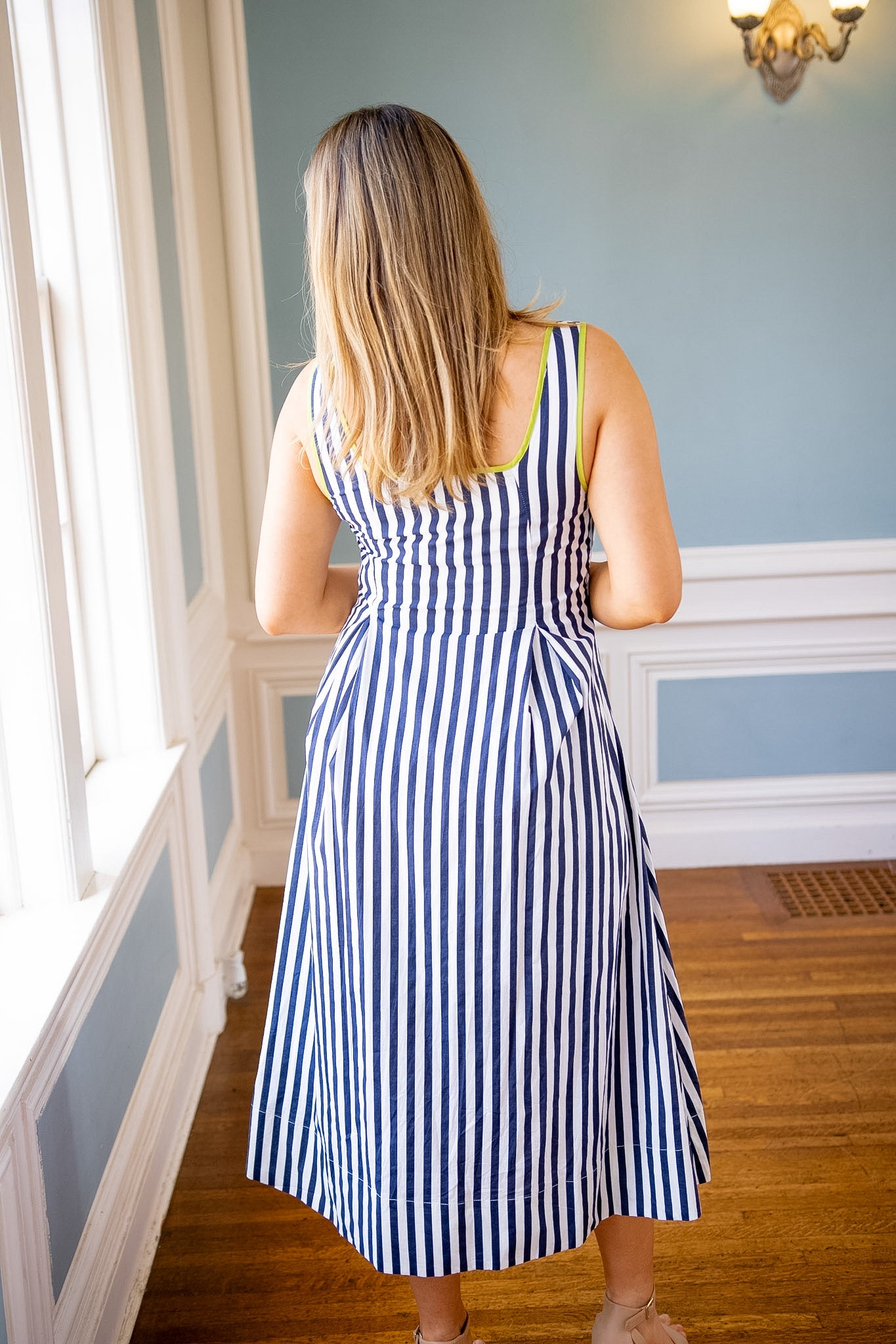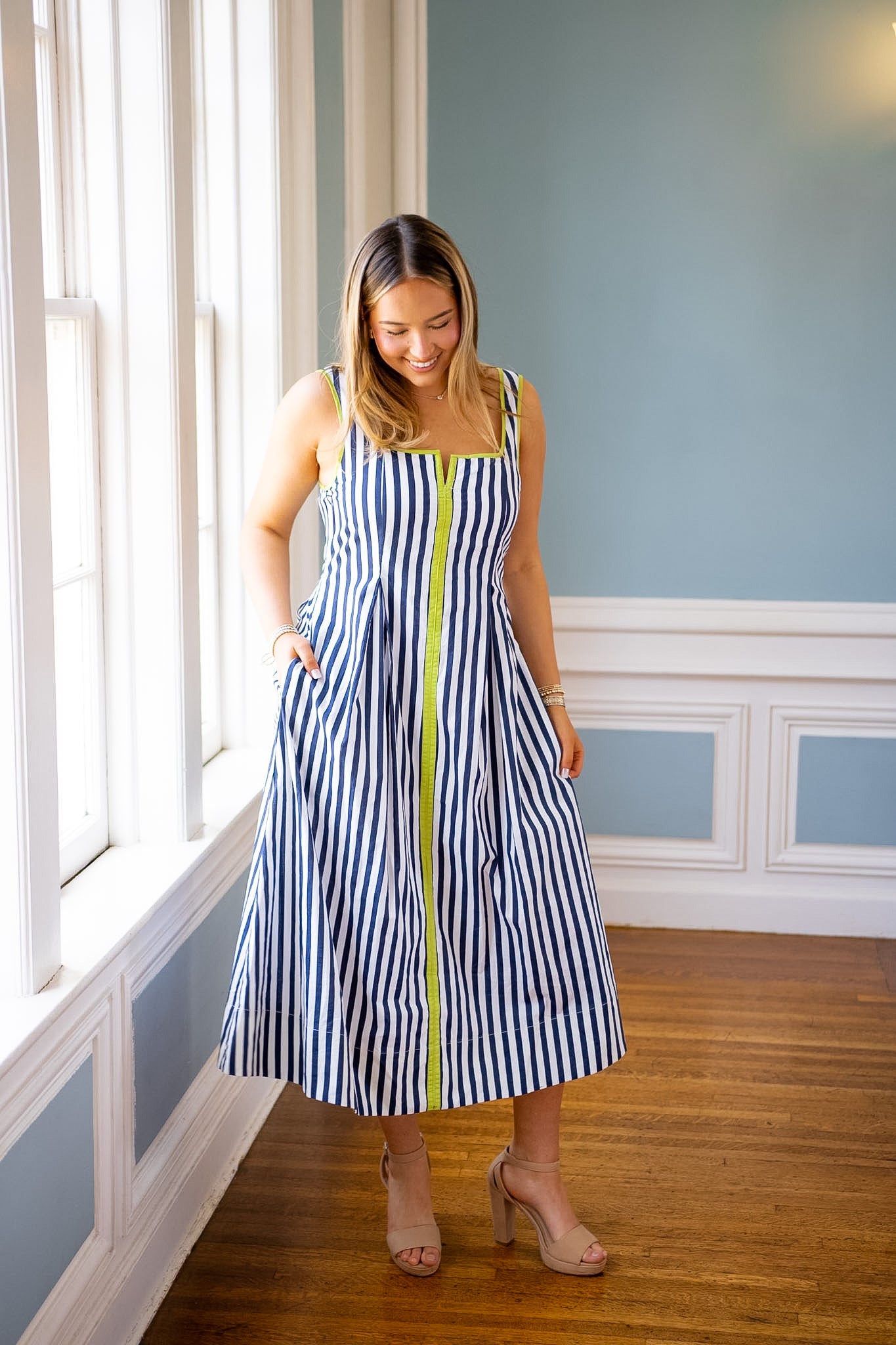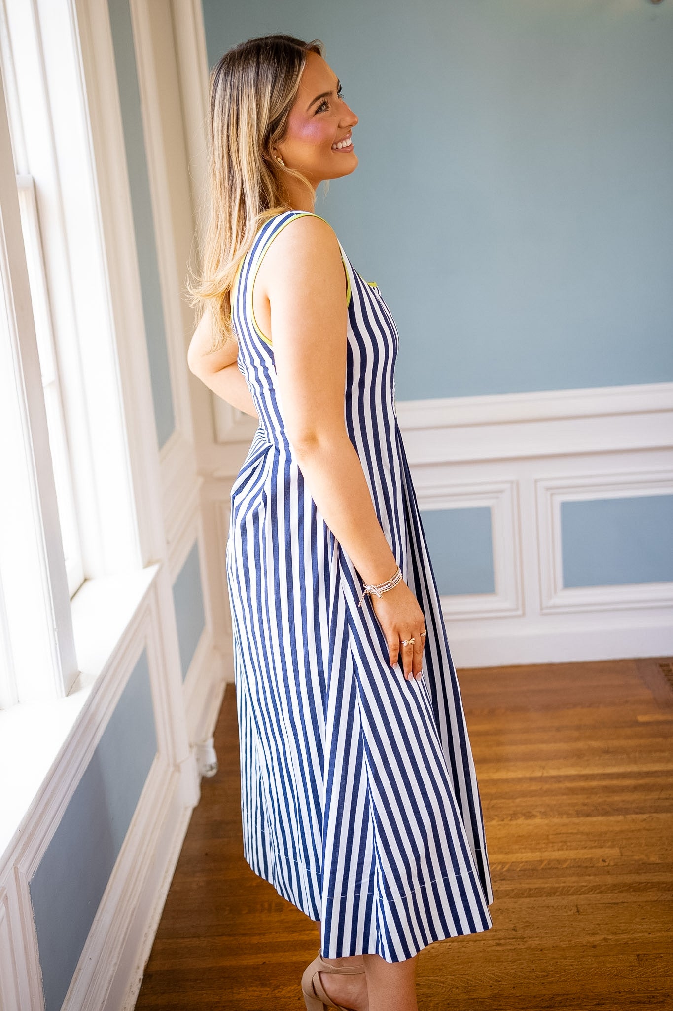 Make a statement in this eye-catching midi dress that blends classic navy and white stripes with a vibrant chartreuse trim for an unexpected pop of color. The playful color-blocking creates instant visual interest, while the relaxed midi length keeps things effortlessly chic. Perfect for turning heads at brunch, weekend outings, or whenever you want to add a splash of fun to your wardrobe. This dress proves that timeless stripes never go out of style—especially when paired with a bold, modern twist.