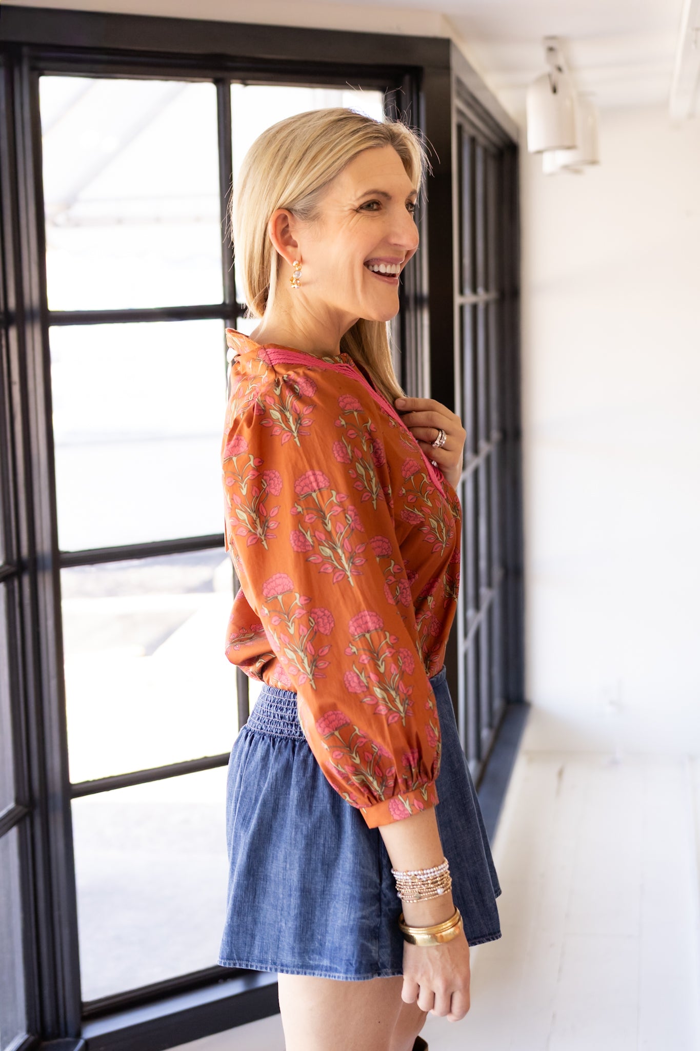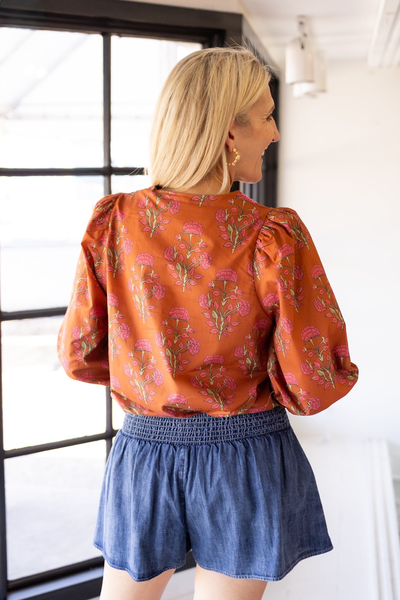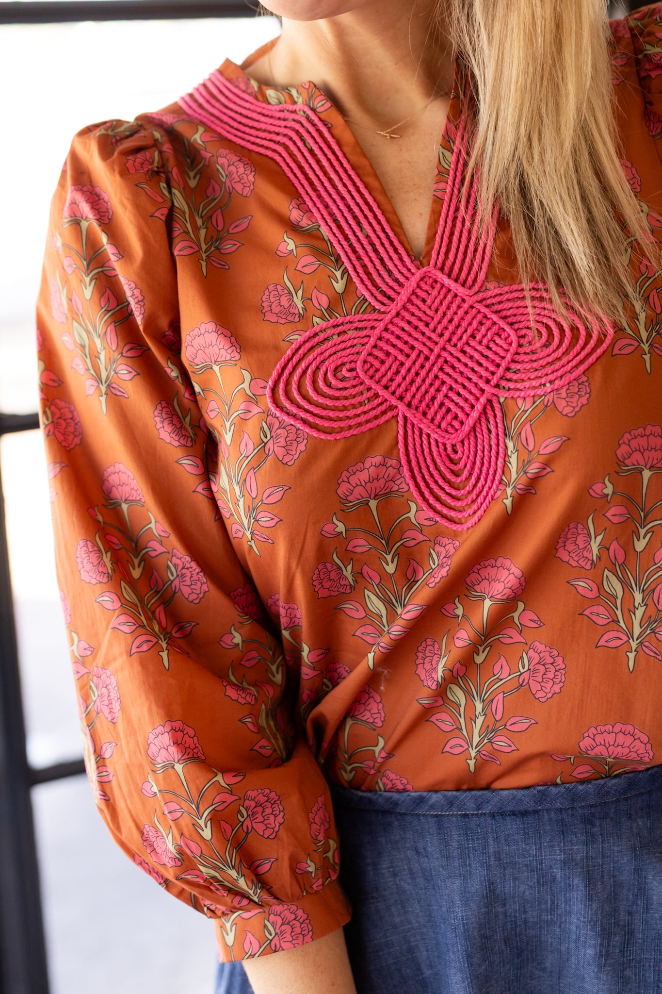 Embrace cozy elegance with the Maple Bloom Top in rich brown. This charming piece features long sleeves perfect for layering through the seasons, paired with a flattering v neckline that adds a touch of sophistication. Delicate embroidered accents dance across the fabric, bringing whimsical character and artisanal flair to your everyday wardrobe. Whether you're heading to brunch or a casual gathering, this top strikes the perfect balance between comfort and style—a versatile essential that feels anything but basic.