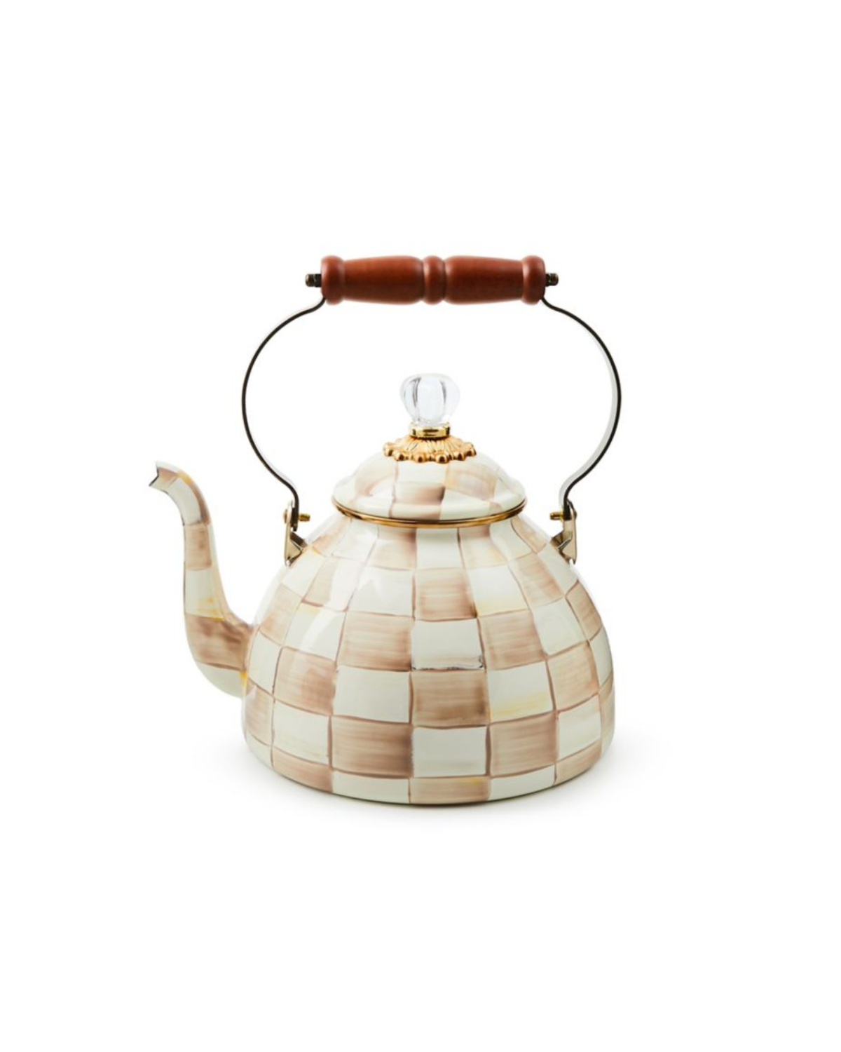 Bubbling over with MacKenzie-Childs style, our Mocha Check Enamel 3 Quart Tea Kettle will have you finding new reasons to put the kettle on. The heavy-gauge steel underbody is glazed with hand-painted, coffee-colored checks and topped with an elegant clear glass knob.